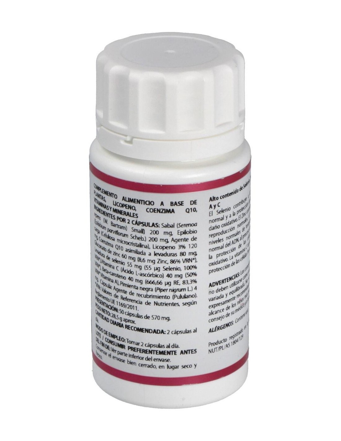 La acción del licopeno como antioxidante tiene una marcada incidencia en el bienestar de la próstata. Se une a otros dos antioxidantes como son la Coenzima Q10 y el selenio, que se presentan en forma orgánica para favorecer la absorción y biodisponibilidad. Dos plantas, de reconocida acción descongestionante de la próstata, completan junto con el aporte de zinc la formulación. Se asocia a la fórmula vitamina C y betacarotenos, que ayudan a la conservación de los principios del Sabal, por su acción antioxidante. Por último, la pimienta negra ayuda a la asimilación de los principios de estos nutrientes.