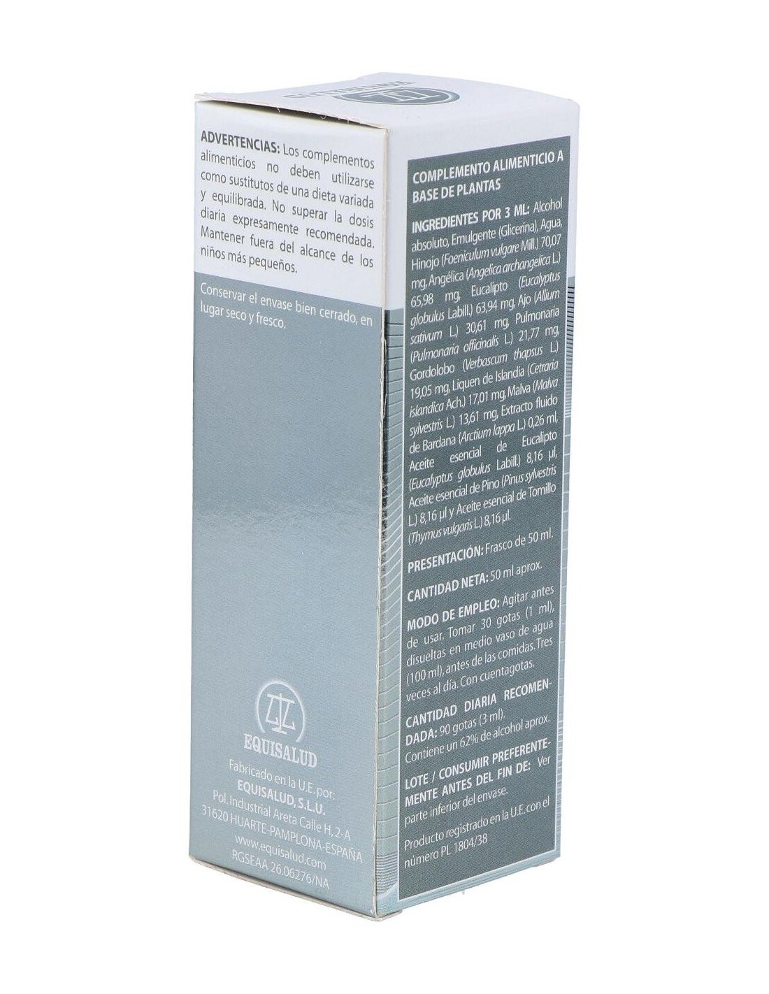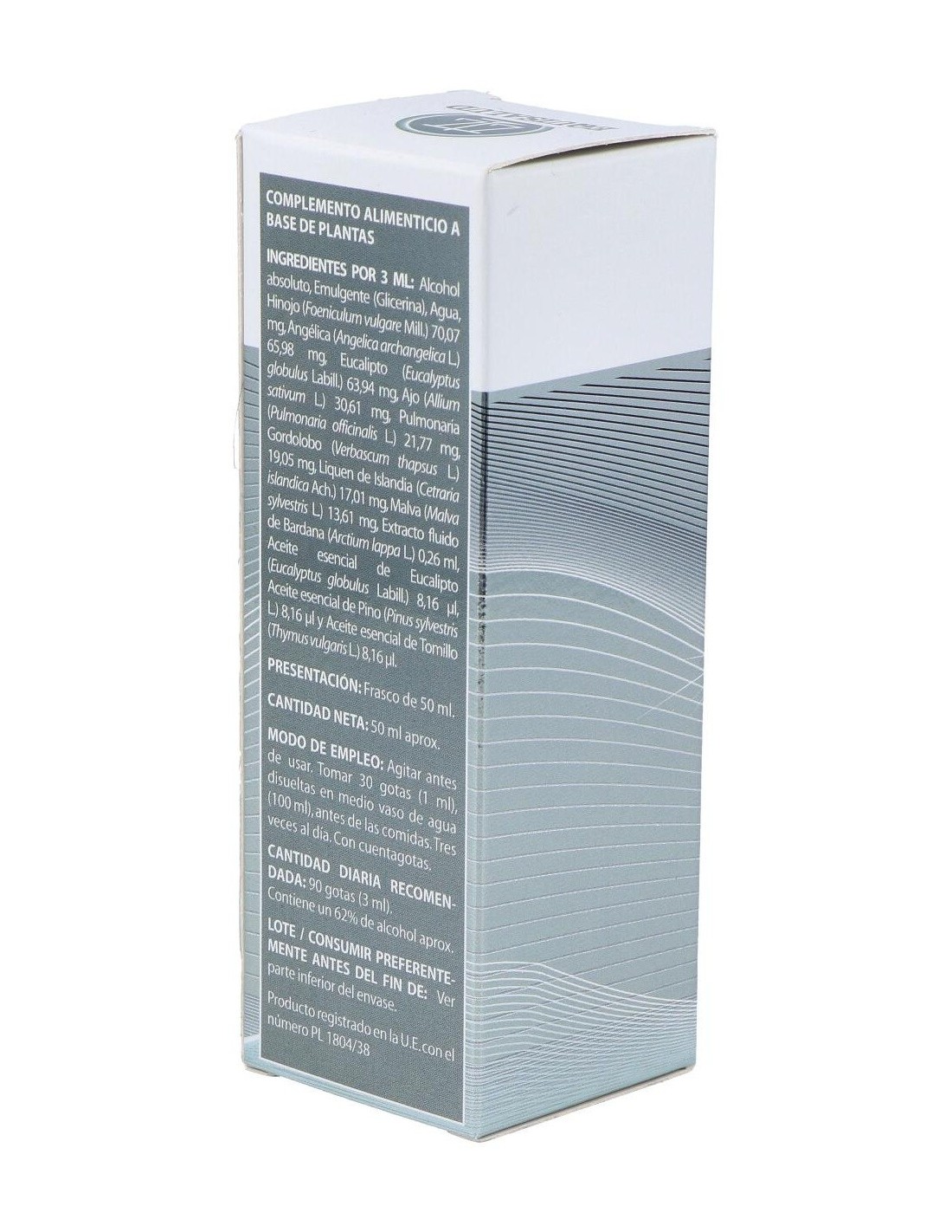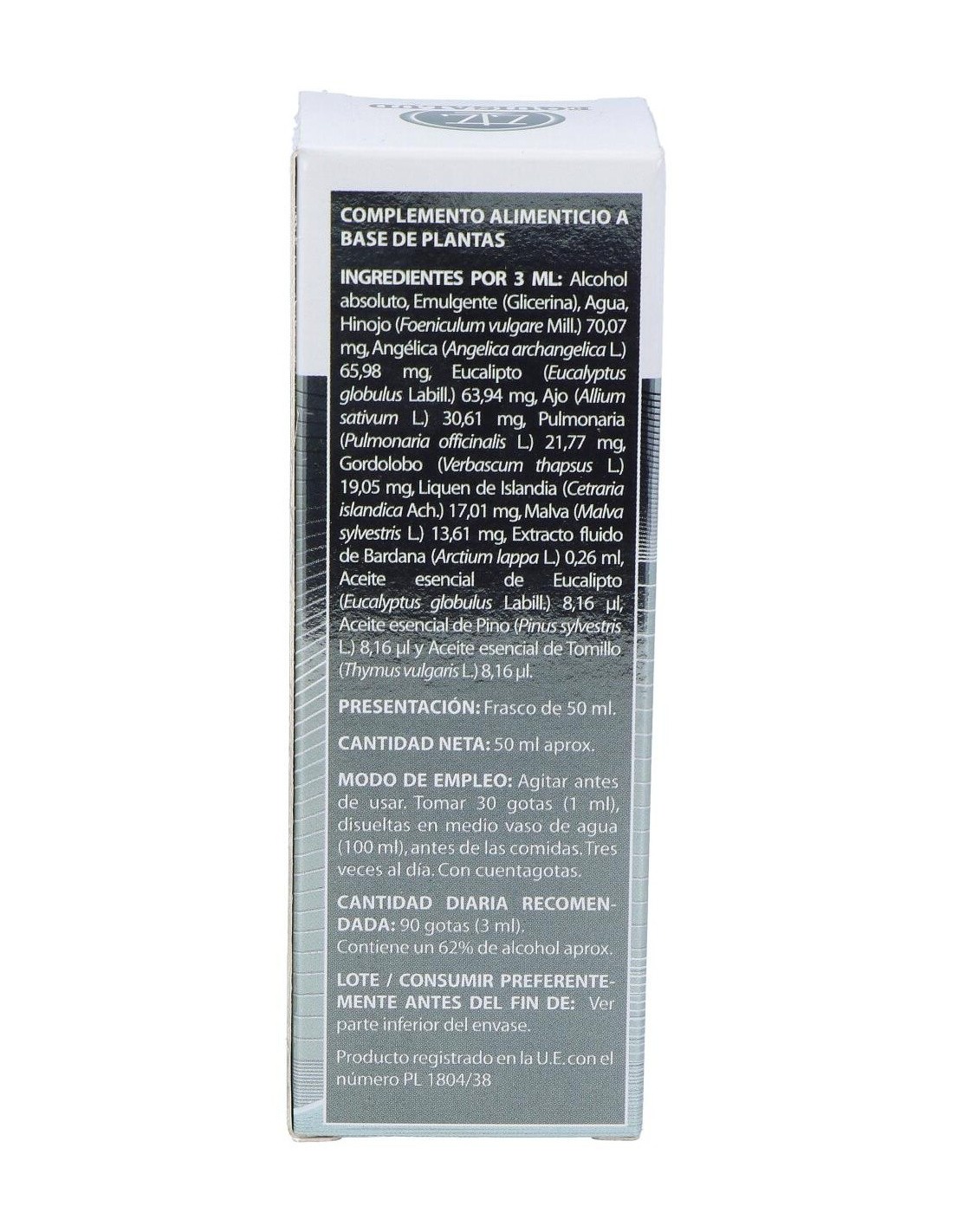 Composición:Bardana (Arctium lappa), Angélica (Angelica archangelica), Hinojo (Foeniculum vulgare), Gordolobo (Verbascum thapsus), Pulmonaria (Pulmonaria officinalis), Eucalipto (Eucaliptus globulus), Malva (Malva sylvestris), Liquen islandia (Cetraria islandica), Ajo (Allium sativum), Tomillo (Thymus vulgaris), Pino (Pinus sylvestris). FV (frecuencias vibracionales):