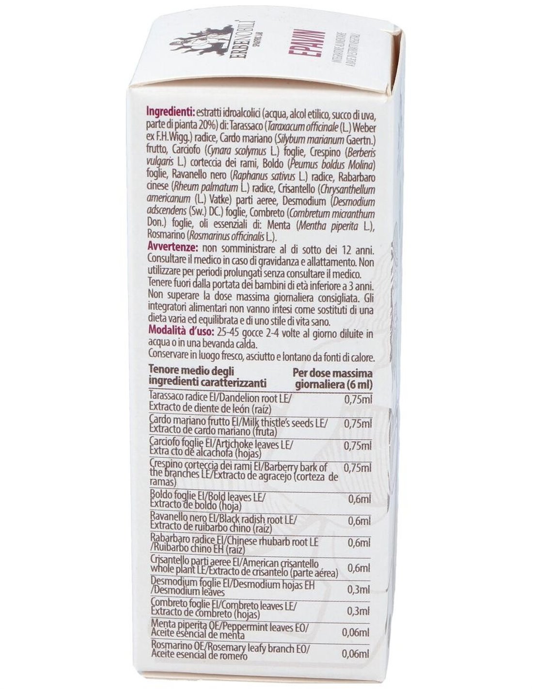 Extractos hidroalcohólicos (agua, alcohol etílico, jugo de uva, parte de la planta 20%) de: Diente de león (Taraxacum officinale Weber) raíz, Cardo mariano (Silybum marianum Gaertn.) fruto, Alcachofa (Cynara scolymus L.) hojas, Agracejo (Berberis vulgaris L.) hojas, Boldo (Peumus boldus Molina) hojas, Rábano negro (Raphanus sativus L.) raiz, Ruibarbo chino (Rheum palmatum L.) raíz, Manzanilla (Chrysantellum americanum Vatke) partes aéreas, Cúrcuma (Curcumalonga L.) rizoma, Combreto (Combretum micranthum Don.) hojas, aceites esenciales de: Hierbabuena (Mentha piperita L.), Romero (Rosmarinus officinalis L.).