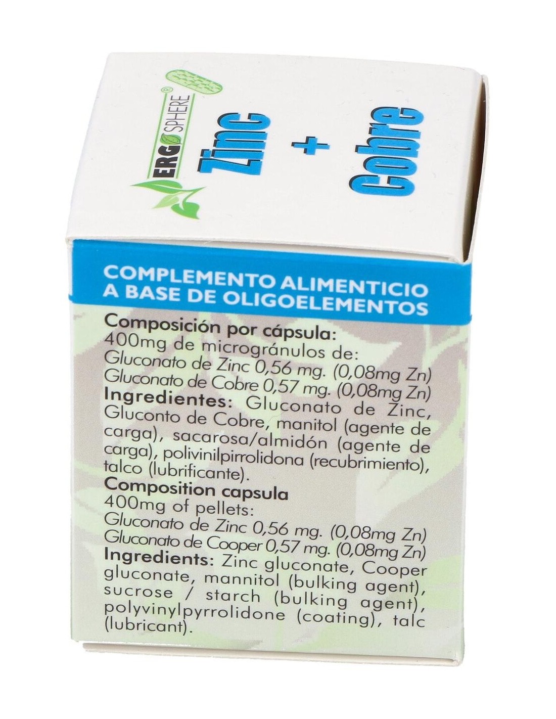Ingredientes:Gluconato de Zinc, Gluconato de Cobre, manitol (agente de carga), sacarosa/almidón (agente de carga), polivinilpirrolidona (recubrimiento), talco (lubrificante).Modo de empleo:Tomar 1 o 2 cápsulas al día o según recomendación de un profesionalPresentación:Envase de 50 cápsulas.
