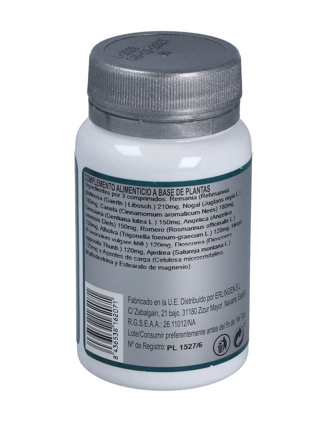 Remania (Rehmannia glutinosa (Gaertn.) Libosch.) 210 mg, Nogal (Juglans regia L.) 180 mg, Canela (Cinnamomum aromaticum Nees) 180 mg, Genciana (Gentiana lutea L.) 150 mg, Angélica (Angelica sinensis Diels) 150 mg, Romero (Rosmarinus officinalis L.) 150 mg, Alholva (Trigonella foenum-graecum L.) 120 mg, Hinojo (Foeniculum vulgare Mill.) 120 mg, Dioscorea (Dioscorea opposita Thunb.) 120 mg, Ajedrea (Satureja montana L.) 120 mg y Agentes de carga (Celulosa microcristalina, Maltodextrina y Estearato de magnesio).