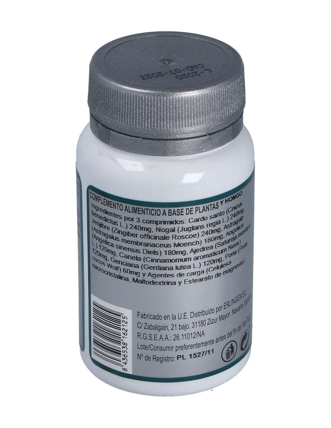 Cardo santo (Cnicus benedictus L.) 240 mg, Nogal (Juglans regia L.) 240 mg, Jengibre (Zingiber officinale Roscoe) 240 mg, Astrágalo (Astragalus membranaceus Moench) 180 mg, Angélica (Angelica sinensis Diels) 180 mg, Ajedrea (Satureja montana L.) 120 mg, Canela (Cinnamomum aromaticum Nees) 120 mg, Genciana (Gentiana lutea L.) 120 mg, Poria (Poria cocos Wolf) 60 mg y Agentes de carga (Celulosa microcristalina, Maltodextrina y Estearato de magnesio).