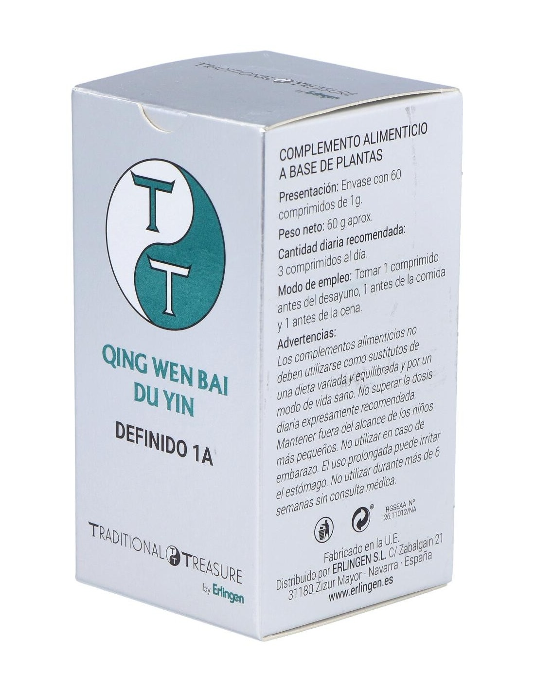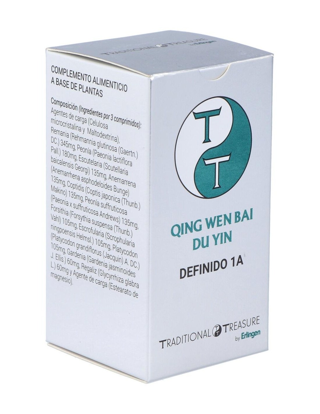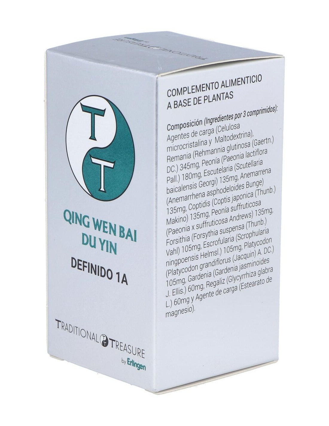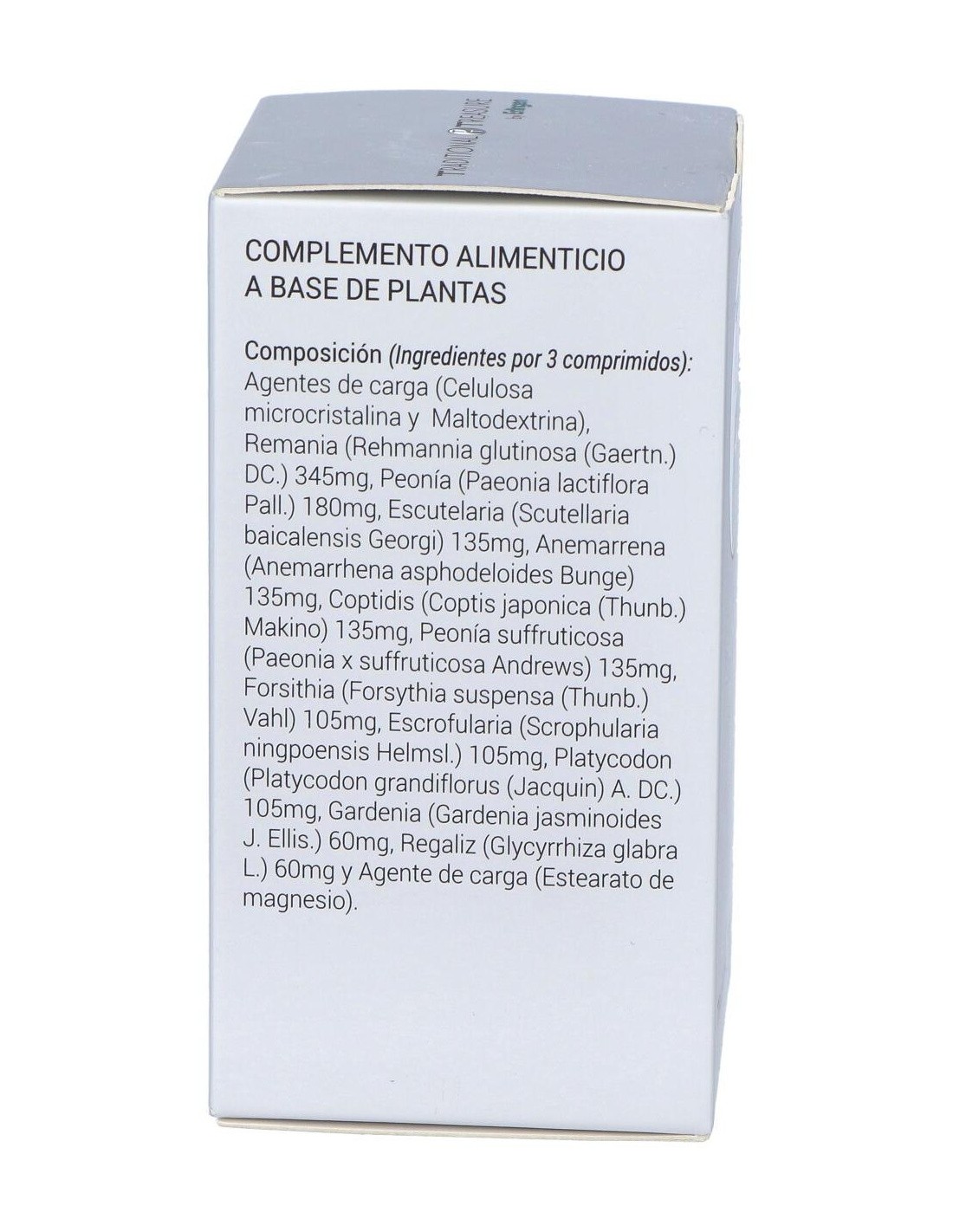 Agentes de carga (Celulosa microcristalina y Maltodextrina), Remania (Rehmannia glutinosa (Gaertn.) DC.) 345 mg, Peonía (Paeonia lactiflora Pall.) 180 mg, Escutelaria (Scutellaria baicalensis Georgi) 135 mg, Anemarrena (Anemarrhena asphodeloides Bunge) 135 mg, Coptidis (Coptis japonica (Thunb.) Makino) 135 mg, Peonía suffruticosa (Paeonia x suffruticosa Andrews) 135 mg, Forsithia (Forsythia suspensa (Thunb.) Vahl) 105 mg, Escrofularia (Scrophularia ningpoensis Helmsl.) 105 mg, Platycodon (Platycodon grandiflorus (Jacquin) A. DC.) 105 mg, Gardenia (Gardenia jasminoides J. Ellis.) 6 0mg, Regaliz (Glycyrrhiza glabra L.) 60 mg y Agente de carga (Estearato de magnesio).