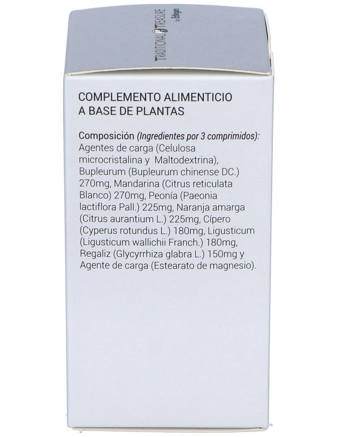 Agentes de carga (Celulosa microcristalina y Maltodextrina), Bupleurum (Bupleurum chinense DC.) 270 mg, Mandarina (Citrus reticulata Blanco) 270 mg, Peonía (Paeonia lactiflora Pall.) 225 mg, Naranja amarga (Citrus aurantium L.) 225 mg, Cípero (Cyperus rotundus L.) 180 mg, Ligusticum (Ligusticum wallichii Franch.) 180 mg, Regaliz (Glycyrrhiza glabra L.) 150 mg y Agente de carga (Estearato de magnesio).