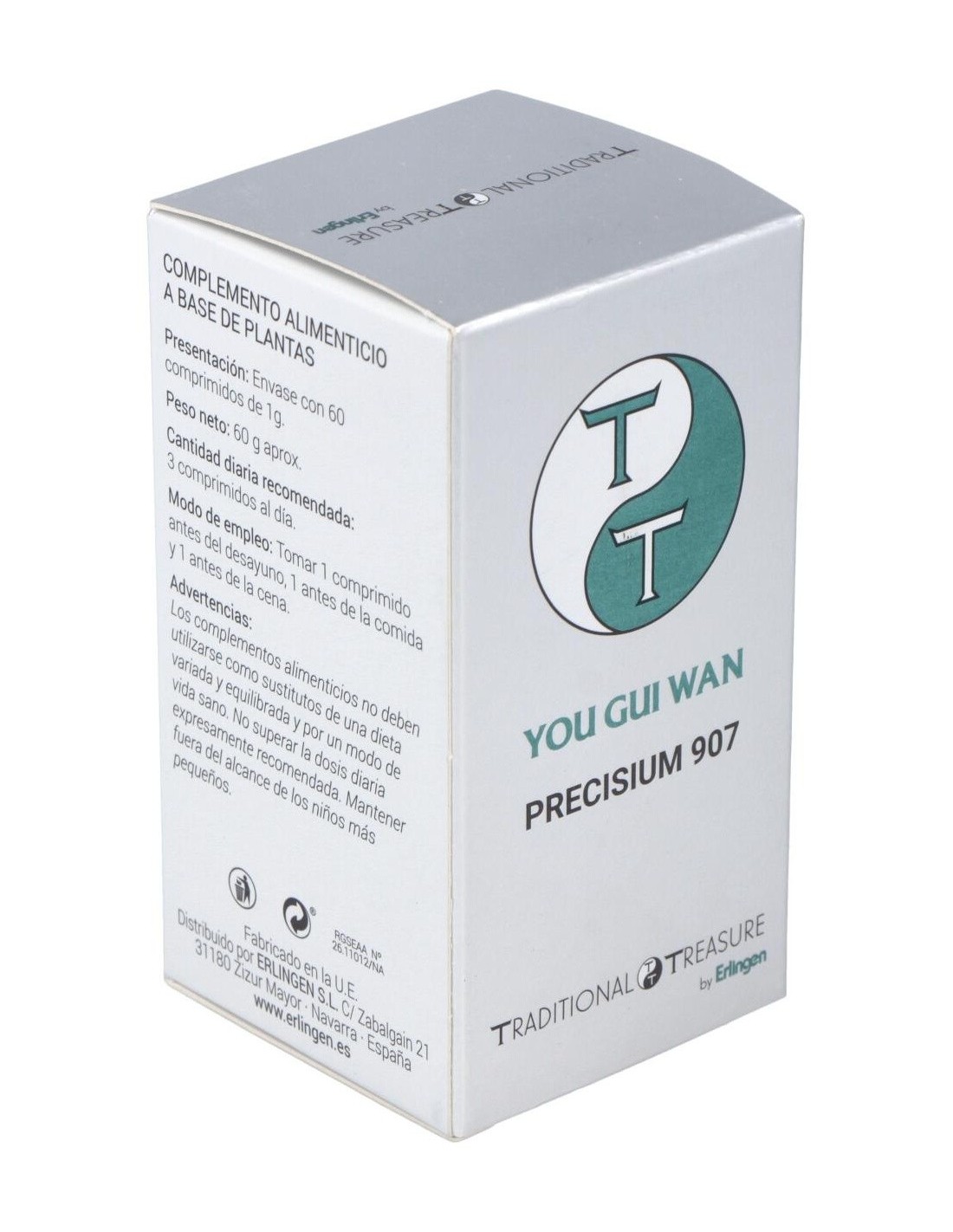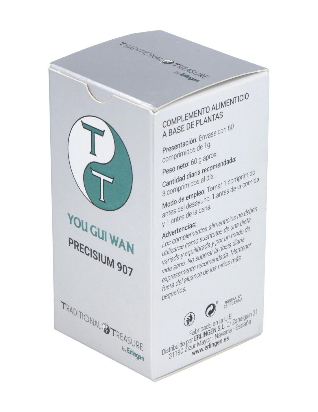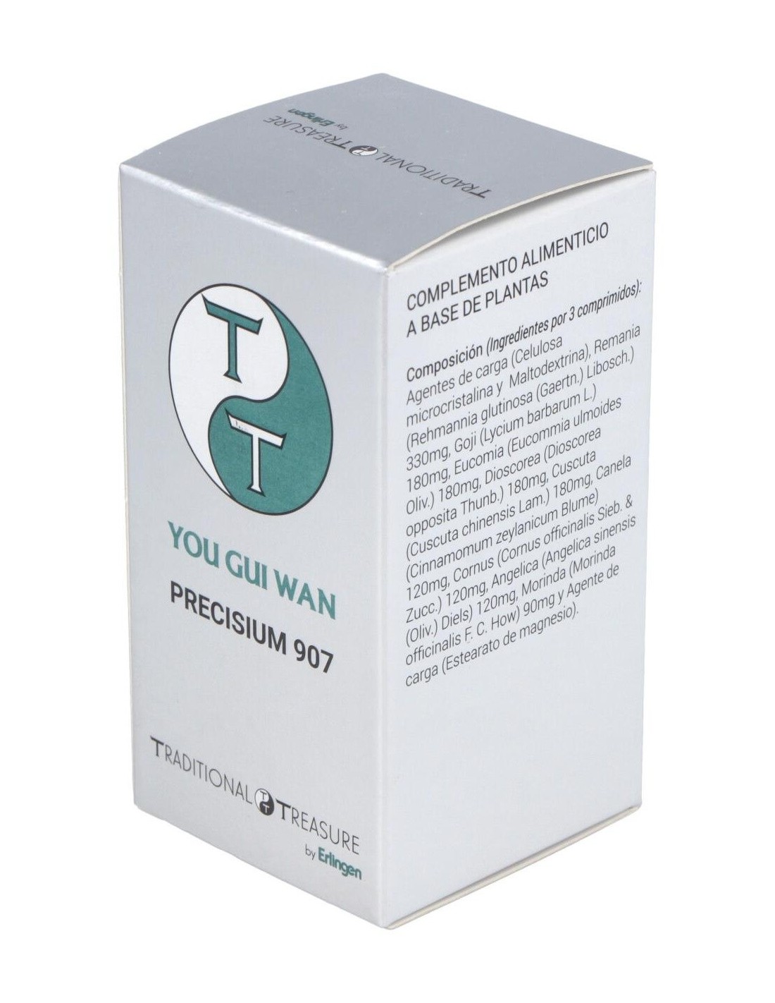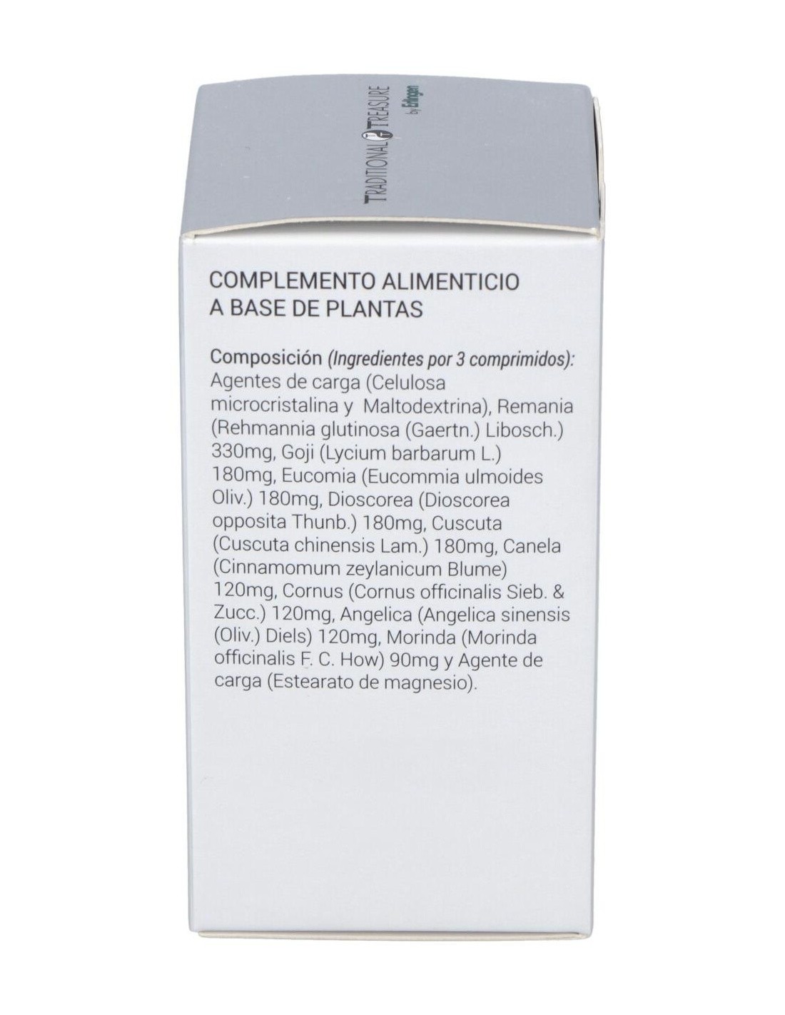 Agentes de carga (Celulosa microcristalina y Maltodextrina), Remania (Rehmannia glutinosa (Gaertn.) Libosch.) 330 mg, Goji (Lycium barbarum L.) 180 mg, Eucomia (Eucommia ulmoides Oliv.) 180 mg, Dioscorea (Dioscorea opposita Thunb.) 180 mg, Cuscuta (Cuscuta chinensis Lam.) 180 mg, Canela (Cinnamomum zeylanicum Blume) 120 mg, Cornus (Cornus officinalis Sieb. & Zucc.) 120 mg, Angélica (Angelica sinensis (Oliv.) Diels) 120 mg, Morinda (Morinda officinalis F. C. How) 90 mg y Agente de carga (Estearato de magnesio).