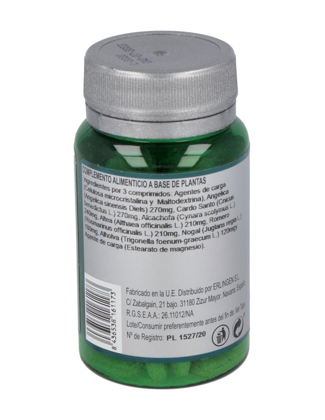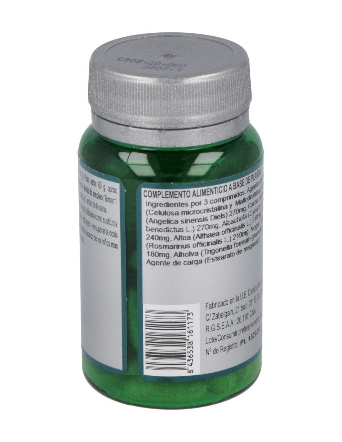 Agentes de carga (Celulosa microcristalina y Maltodextrina), Angélica (Angelica sinensis Diels) 270 mg, Cardo Santo (Cnicus benedictus L.) 270 mg, Alcachofa (Cynara scolymus L.) 240 mg, Altea (Althaea officinalis L.) 210 mg, Romero (Rosmarinus officinalis L.) 210 mg, Nogal (Juglans regia L.) 180 mg, Alholva (Trigonella foenum-graecum L.) 120 mg y Agente de carga (Estearato de magnesio).