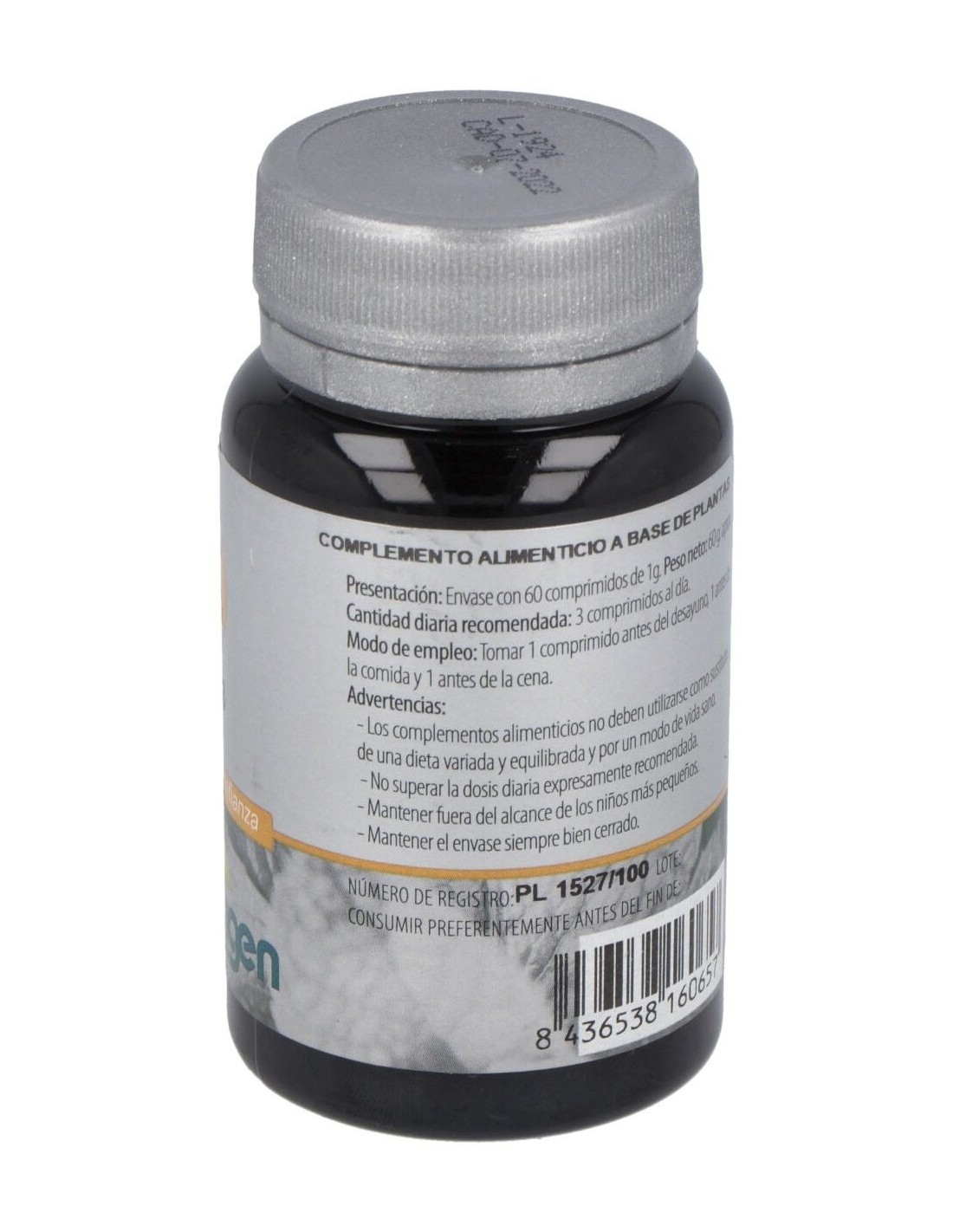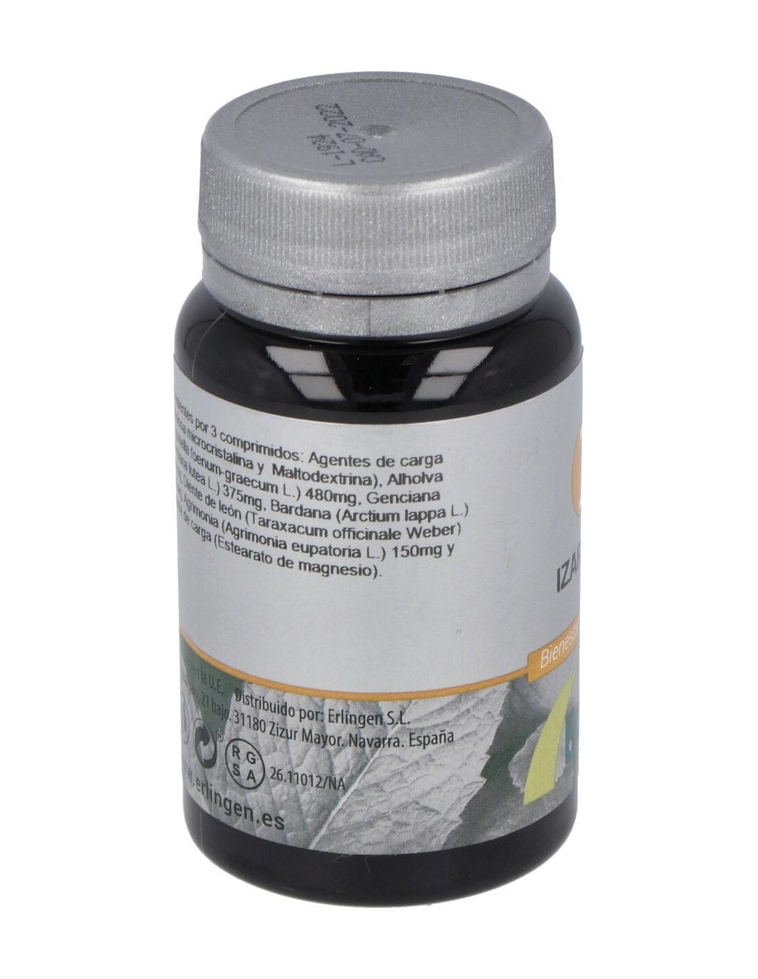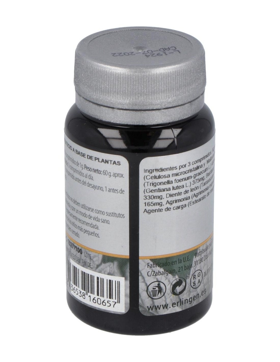 Agentes de carga (Celulosa microcristalina y Maltodextrina), Alholva (Trigonella foenum-graecum L.) 480 mg, Genciana (Gentiana lutea L.) 375 mg, Bardana (Arctium lappa L.) 330 mg, Diente de león (Taraxacum officinale Weber) 165 mg, Agrimonia (Agrimonia eupatoria L.) 150 mg y Agente de carga (Estearato de magnesio).