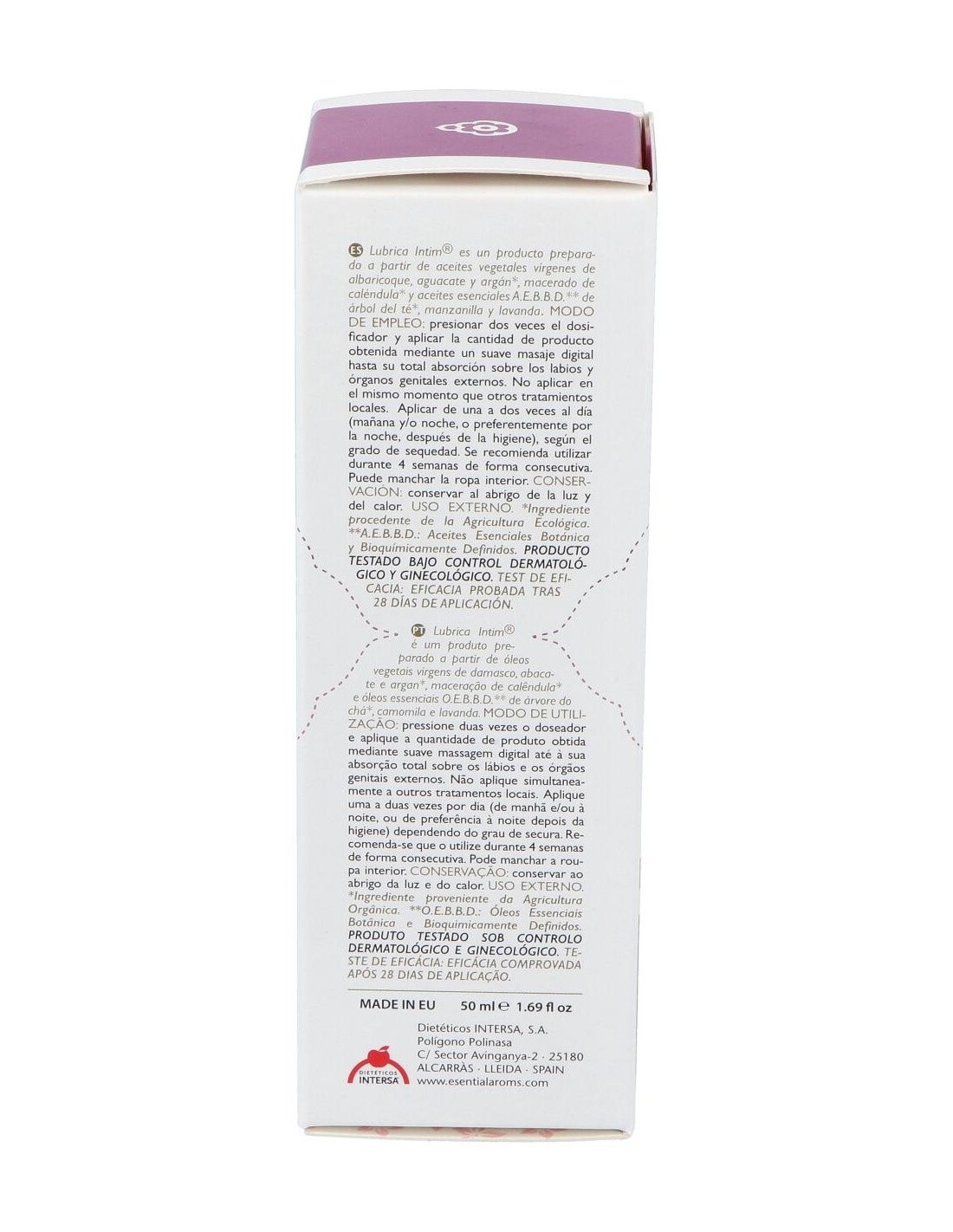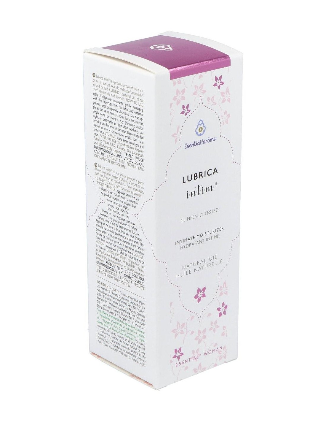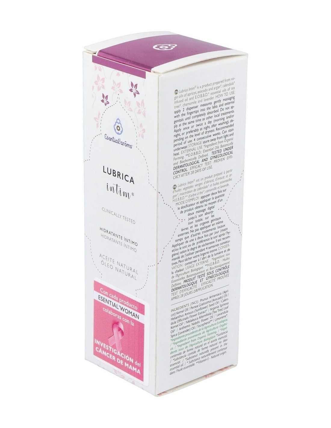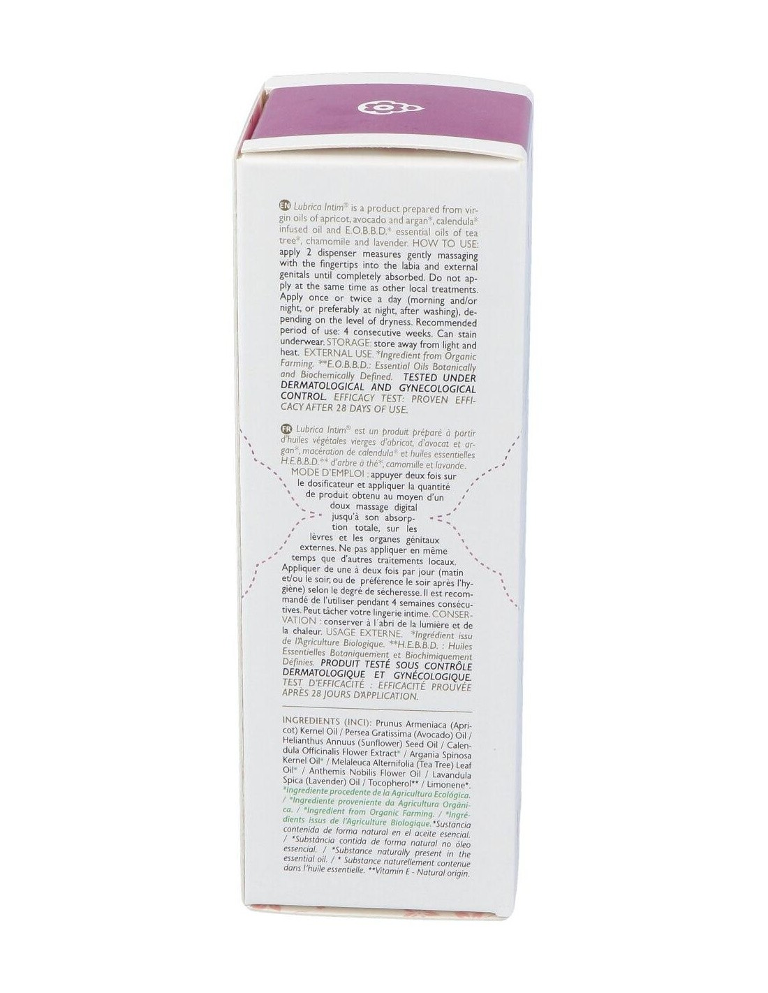 Ingredientes:Aceites vegetales vírgenes de albaricoque, aguacate y argán, macerado de caléndula y aceites esenciales AEBBD de árbol del té, manzanilla y lavanda. Modo de empleo:Presionar dos veces el dosificador y aplicar la cantidad de producto obtenida mediante suave masaje digital hasta su total absorción sobre los labios y órganos genitales externos. No aplicar en el mismo momento que otros tratamientos locales.