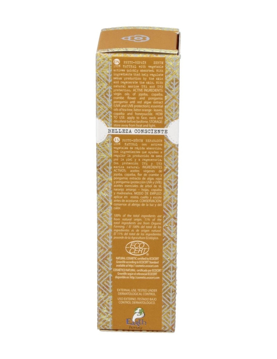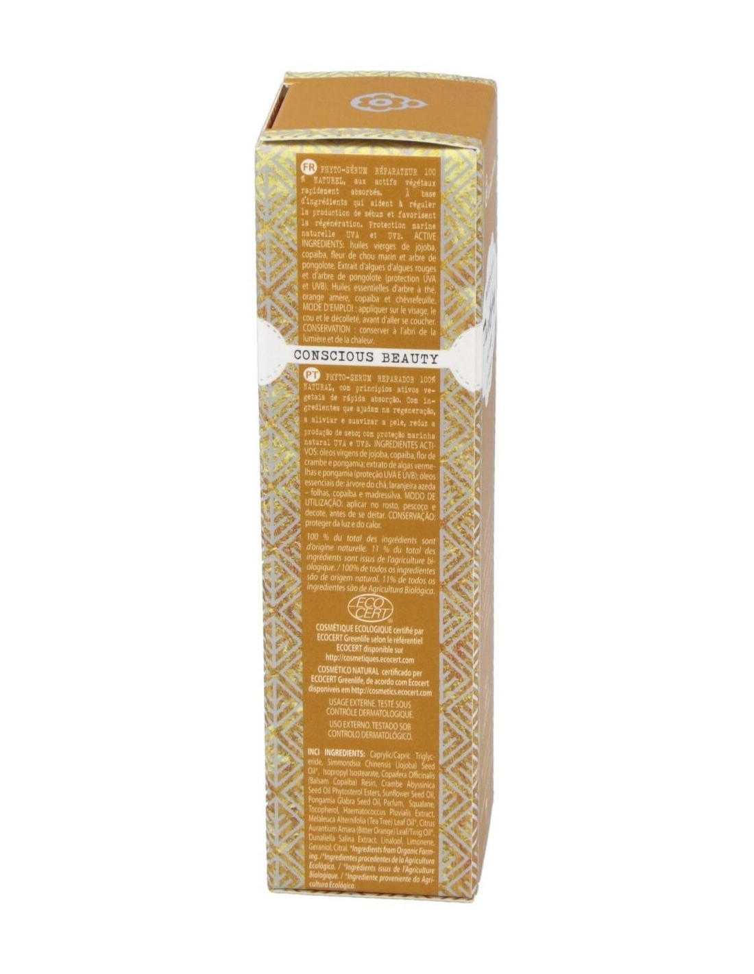 Aceites vírgenes de jojoba, copaiba, flor de crambe y pongamia; extracto de algas rojas y pongamia (protección UVA Y UVB); aceites esenciales de: árbol de té, naranjo amargo-hojas, copaiba y madreselva.