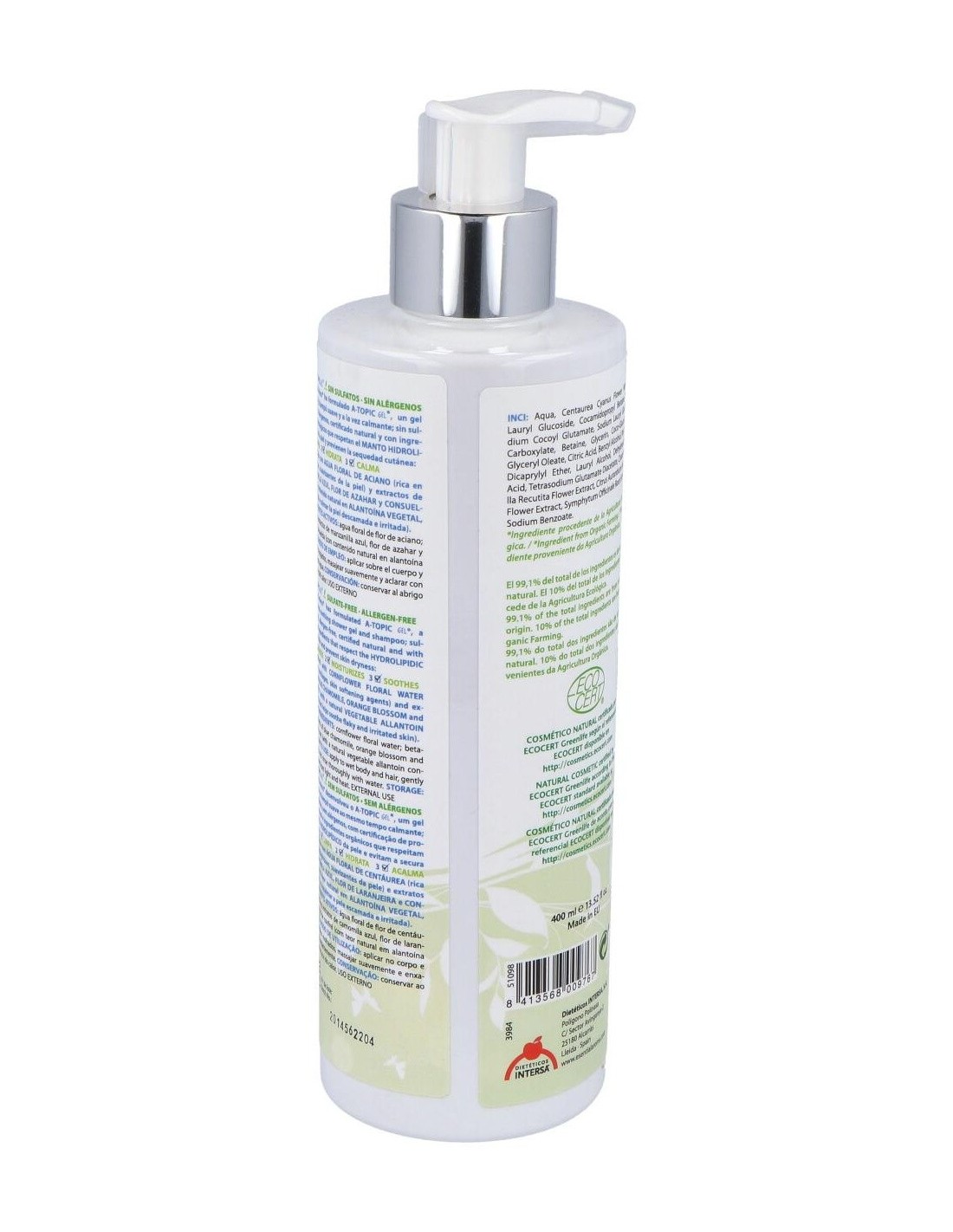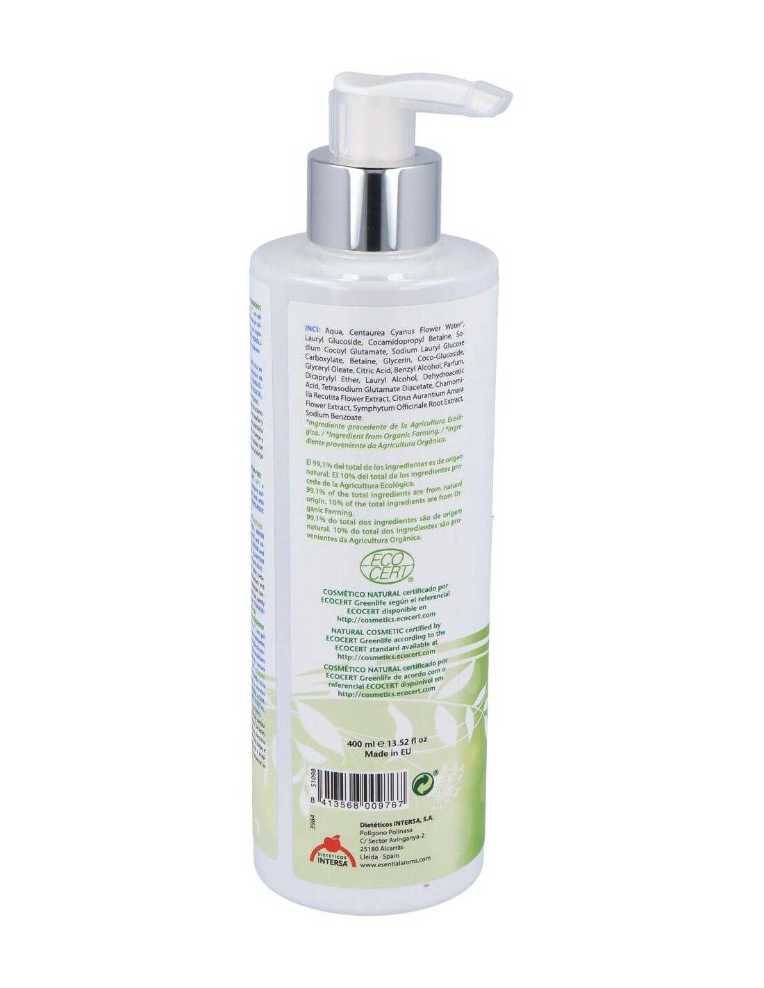 Posee además propiedades calmantes y emolientes que ayudan a suavizar la piel descamada e irritada. Ingredientes (INCI):Aqua, Centaura Cyanus Flower water*, Lauryl Glucoside, Cocamidopropyl Betaine, Sodium Cocoyl Glutamate, Sodium Lauryl Glucose Carboxylate, Betaine, Glycerin, Coco-Glucoside, Glyceryl Oleate, Citric Acid, Benzyl Alcohol, Parfum, Dicaprylyl Ether, Lauryl Alcohol, Dehydroacetic Acid, Tetrasodium Glutamte Diacetate, Camomila Recutita Flower Extract, Citrus Aurantium Amara Flower Extract, Symphytum Officinale Root Extract, Sodium Benzoate. * Ingredientes procedentes de la agricultura ecológica. Modo de empleo:Aplicar sobre el cuerpo y cabello mojado, masajear suavemente y aclarar con abundante agua. Presentación:Frasco con dosificador de 400 ml.