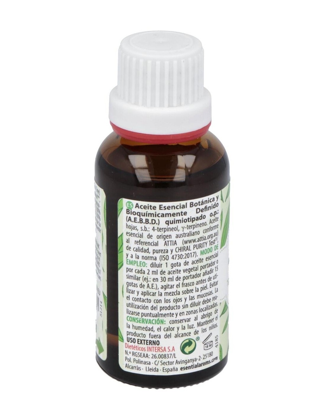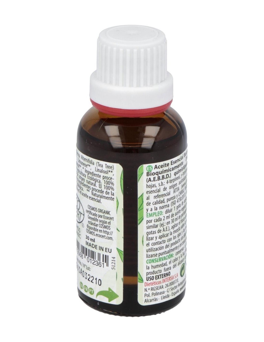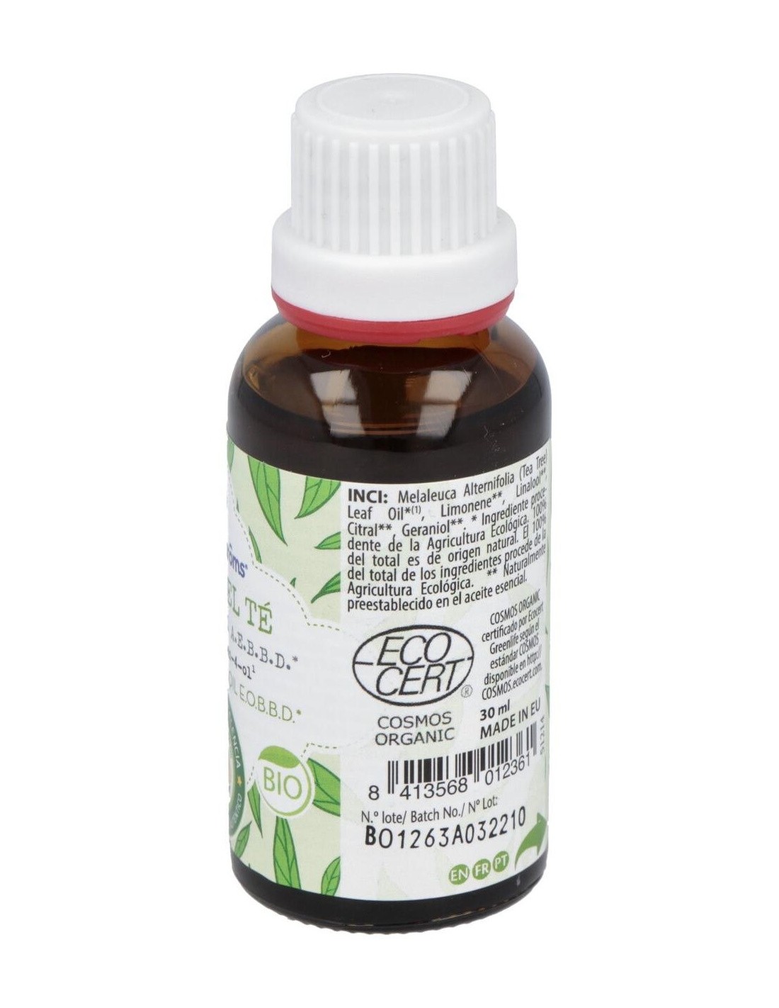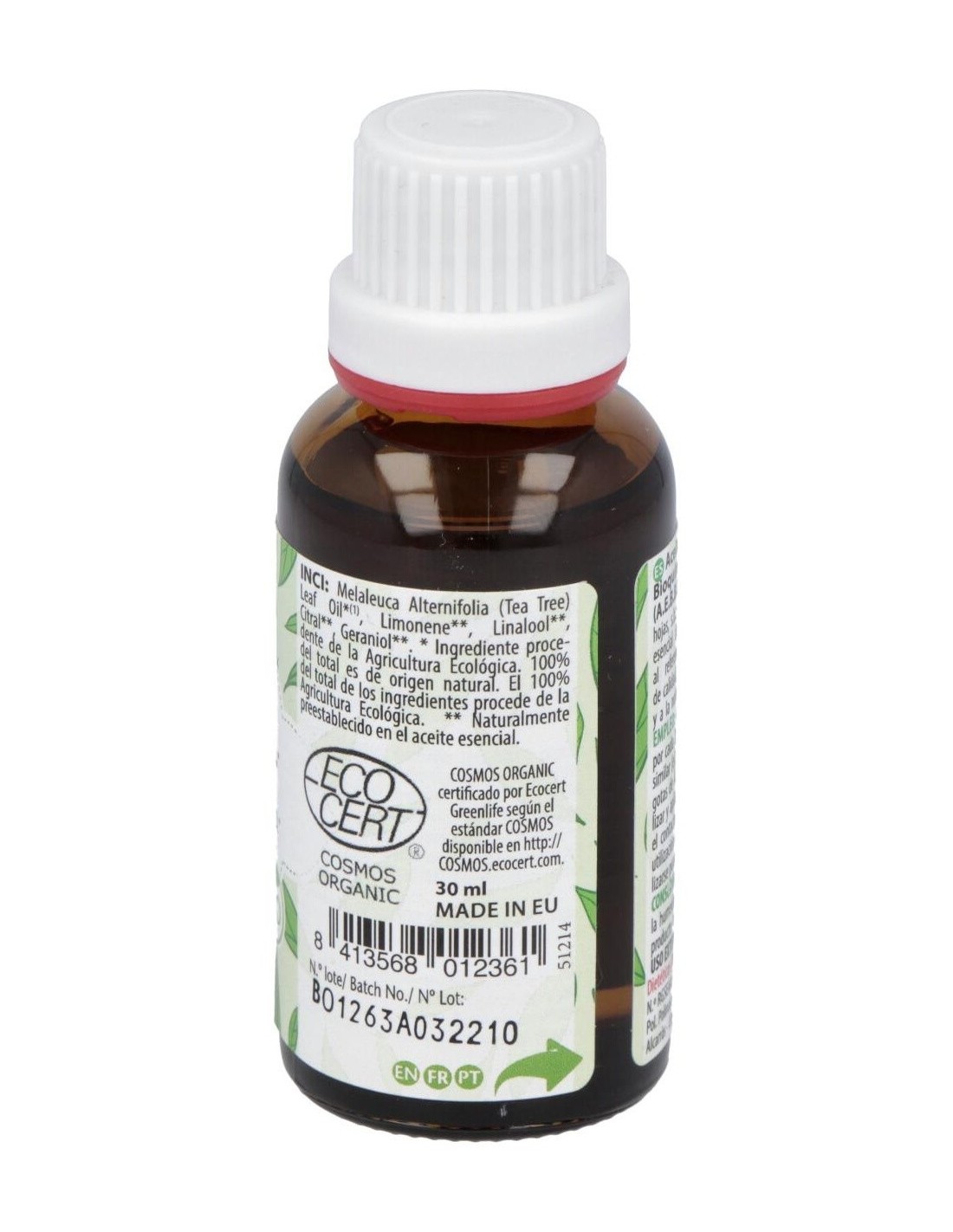 Ingredientes (INCI):Melaleuca Alternifolia (Tea Tree) Leaf Oil*», Limonene**, Linalool**, Citral**, Geranio**. (*) Ingrediente procedente de la agricultura ecológica. (**) Naturalmente preestablecido en el aceite esencial. (1) CHIRAL PURITY: Terpinen-4-ol (R) + 69%, Terpinen-4-ol (S) -29%.El 100% del total de los ingredientes es de origen natural. El 100% del total de los ingredientes procede de la Agricultura Ecológica.Quimiotipo: 4-terpineol, ?-terpineno.Modo de empleo:Diluir 1 gota de aceite esencial por cada 2 ml de aceite vegetal portador o similar, agitar el frasco antes de utilizar y aplicar la mezcla sobre la piel. Evitar el contacto con los ojos y las mucosas. La utilización del producto sin diluir debe realizarse puntualmente y en zonas localizadas.Presentación:Envase de 30 mlRecomendaciones y advertencias:No contiene colorantes, aromas artificiales ni productos químicos.