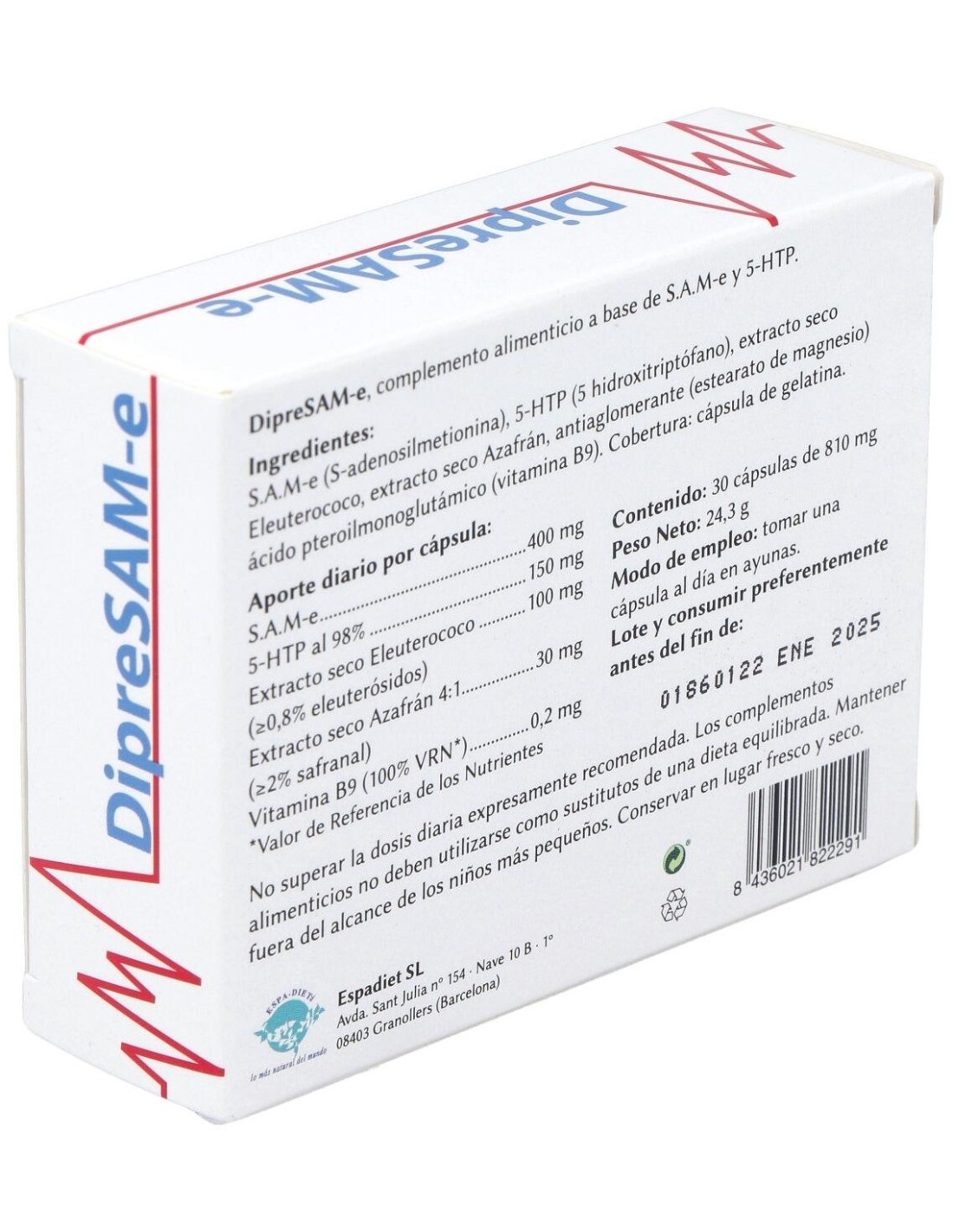 Dipresam-E 30Cap. de Espadiet es un complemento alimenticio para personas que buscan apoyar su bienestar emocional. Con ingredientes seleccionados, contribuye a mantener el equilibrio natural del estado de ánimo.