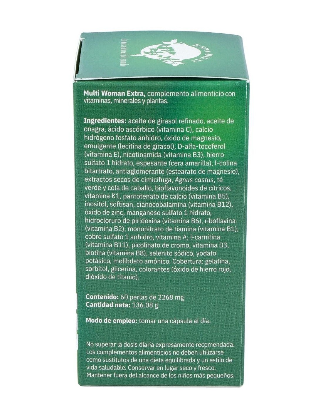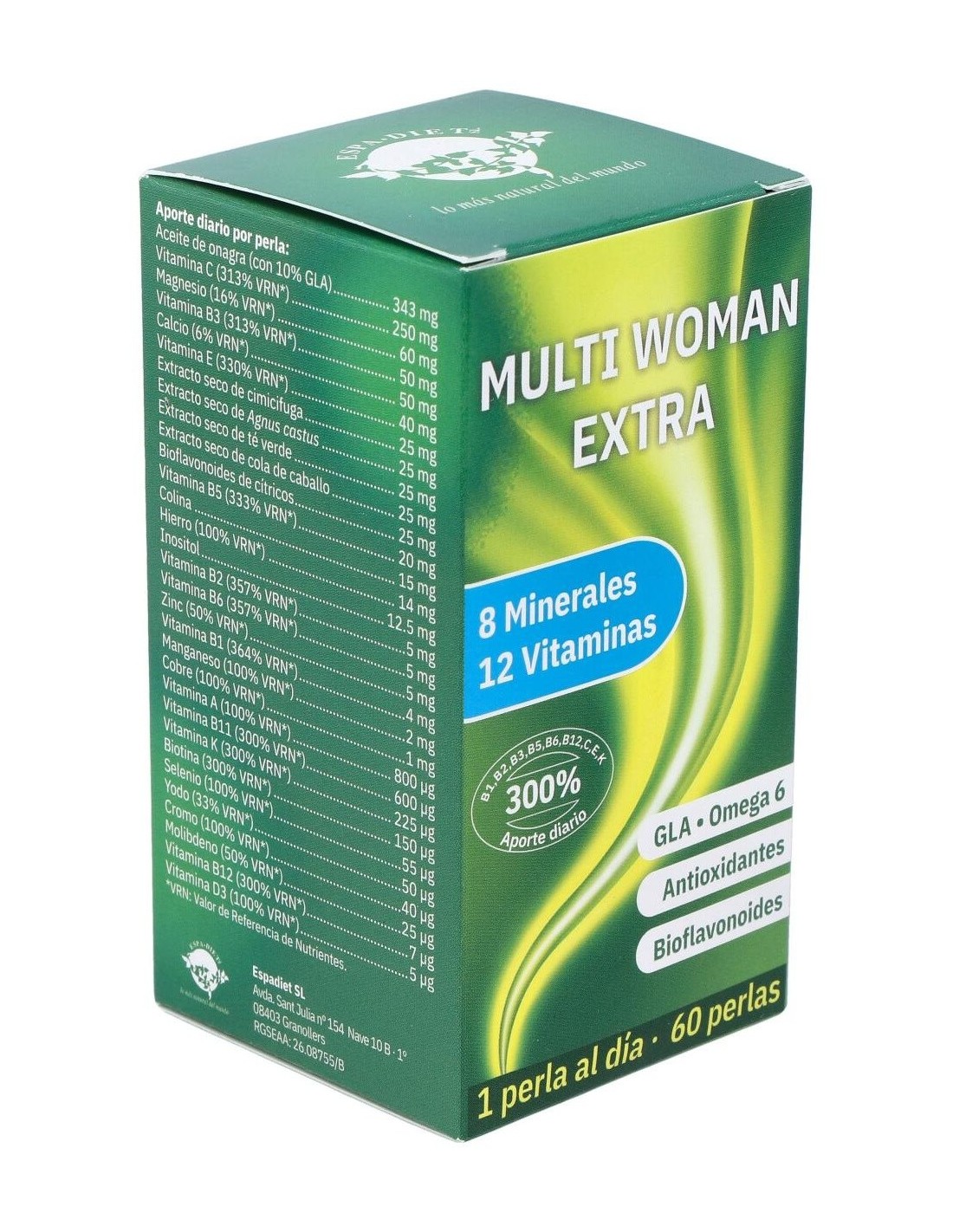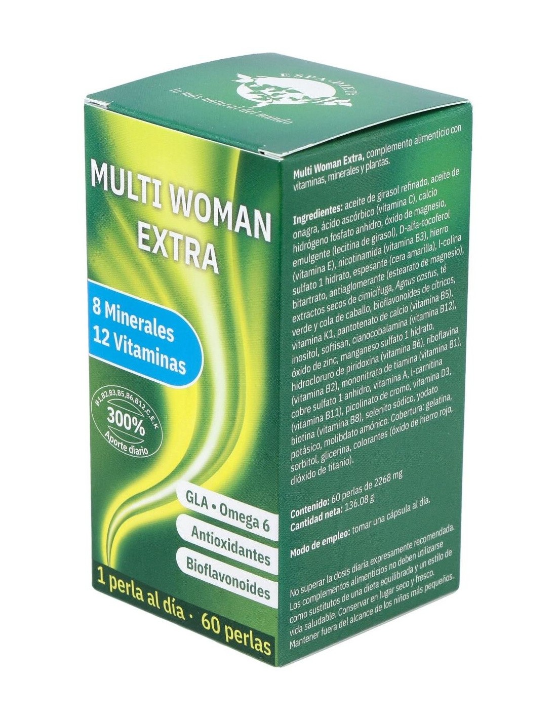 El Multi Woman 60Perlas Axium de Espadiet es un complemento alimenticio para mujeres que contribuye al bienestar general mediante una fórmula equilibrada de vitaminas y minerales.