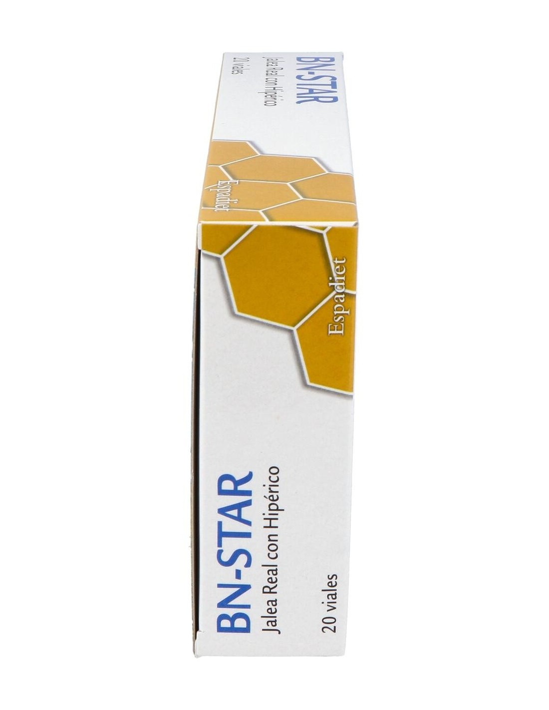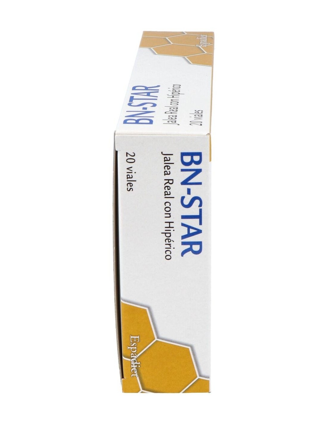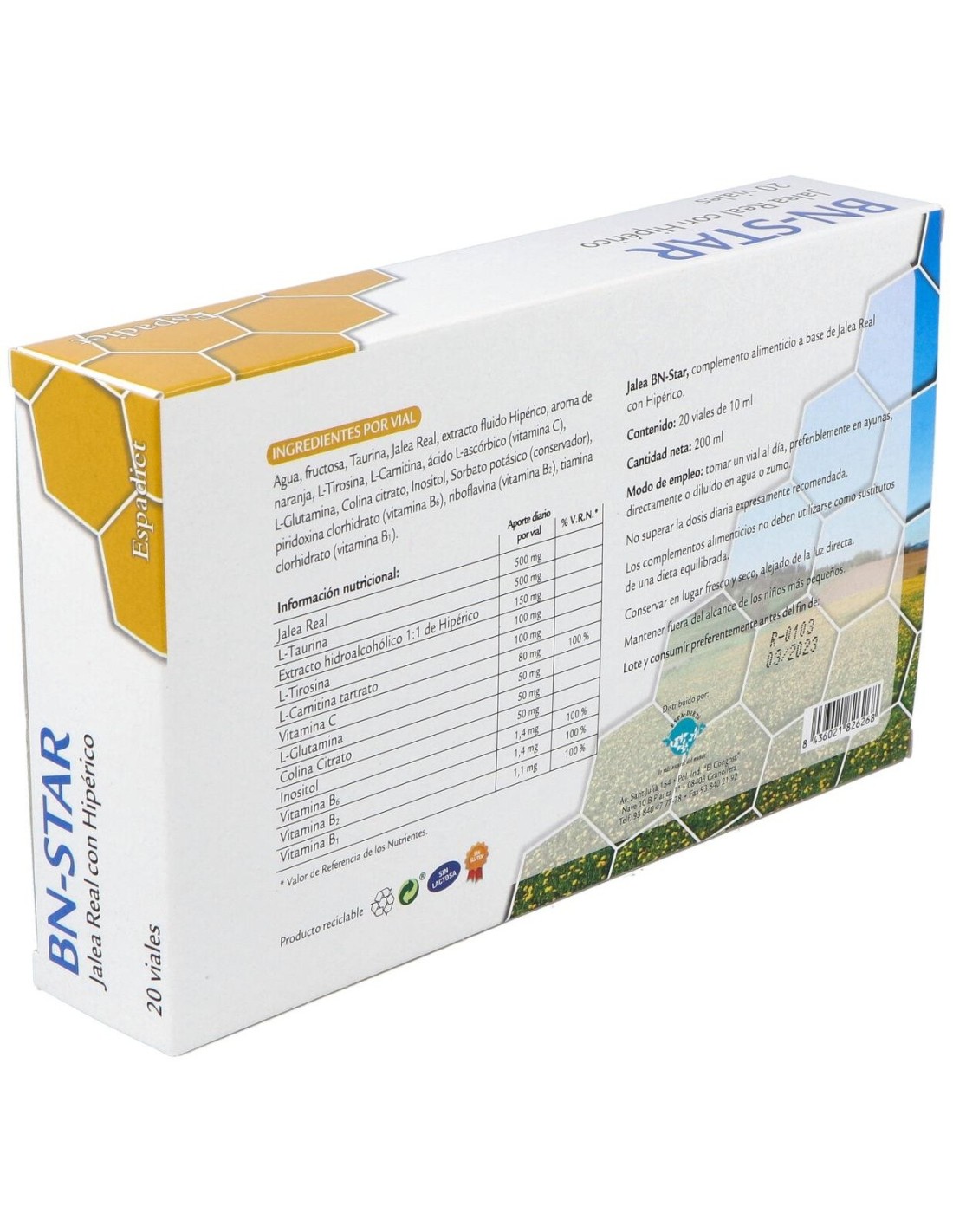 Jalea Real+Hiperico Bn-Star 20Amp. de Espadiet es un complemento alimenticio diseñado para personas que buscan apoyar su bienestar diario mediante ingredientes naturales. Este producto combina jalea real y extracto de hipérico en una presentación práctica de 20 ampollas, ideal para quienes prefieren una fórmula líquida de fácil absorción.