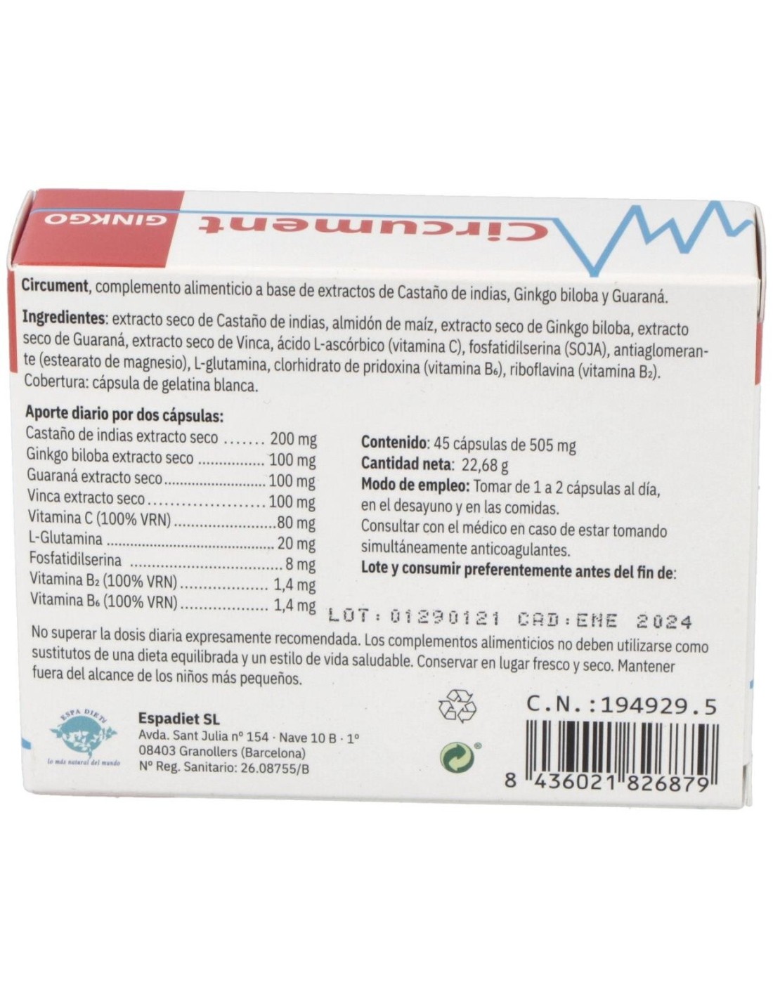 Ingredientes:Extracto seco de Castaño de indias, almidón de maíz, extracto seco de Ginkgo biloba, extracto seco de Guaraná, extracto seco de Vinca, ácido L-ascórbico (vitamina C), fosfatidilserina (SOJA), antiaglomeran-te (estearato de magnesio), L-glutamina, clorhidrato de pridoxina (vitamina Bs), riboflavina (vitamina B2). Cobertura: cápsula de gelatina blanca. Modo de empleo:Tomar de 1 a 2 cápsulas al día, en el desayuno y en la merienda. Presentación:Envase de 45 cápsulas.