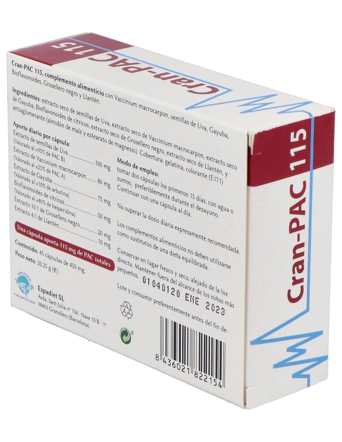 Además, ayuda en el tratamiento y profilaxis de litiasis (piedras) en riñón, reducción de la adoración asociada a incontinencia y del control de la acidificación de la orina, por regulación del pH alcalino, y es muy probable que ejerza efectos fungistáticos, es decir, inhibe el crecimiento, frente a 8 hongos dermatológicos y otros de diferente índole. - Semillas de uvaPor su concentración en polifenoles del tipo oligomeros procianidas, puede aumentas particularmente la acción antimicrobiana del Cranberry y el balance del electrólitos.