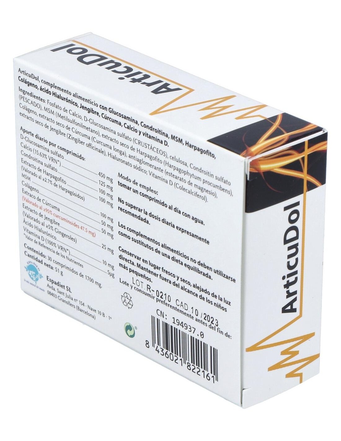 Articudol 30Comp. de Espadiet es un complemento alimenticio para personas que buscan apoyar el bienestar articular, formulado con ingredientes que contribuyen a la salud de las articulaciones y el confort diario.