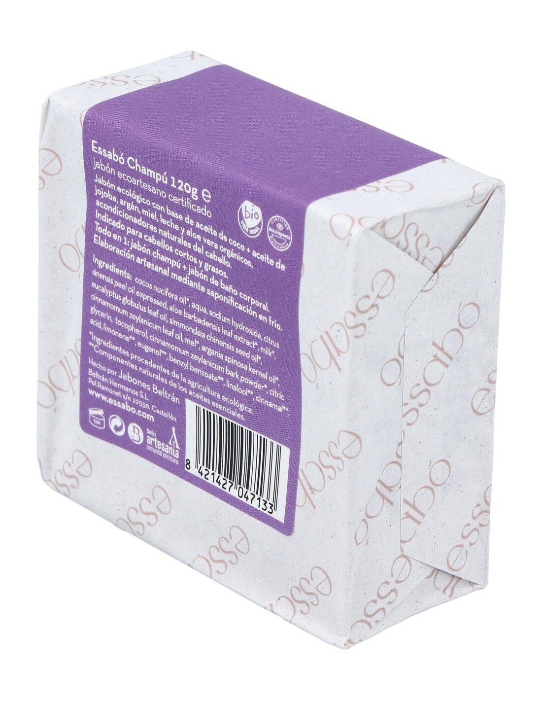 Essabó Champú es un jabón ecológico específico para el lavado del cabello, enriquecido con aceite de jojoba, argán y aloe vera ecológicos, acondicionadores naturales del cabello. Su base está elaborada con aceite de coco de agricultura sostenible de Filipinas.Elaborado artesanalmente mediante saponificación tradicional en frío. Idóneo para cabellos cortos y grasos. Para cabellos largos recomendamos utilizar posteriormente suavizante ecológico.Cuenta con el certificado cosmético ecológico NATRUE que audita todo el proceso de producción; desde la calidad, trazabilidad y origen de los ingredientes hasta el cosmético final pasando por fabricación, instalaciones y documentación.Principios activos: