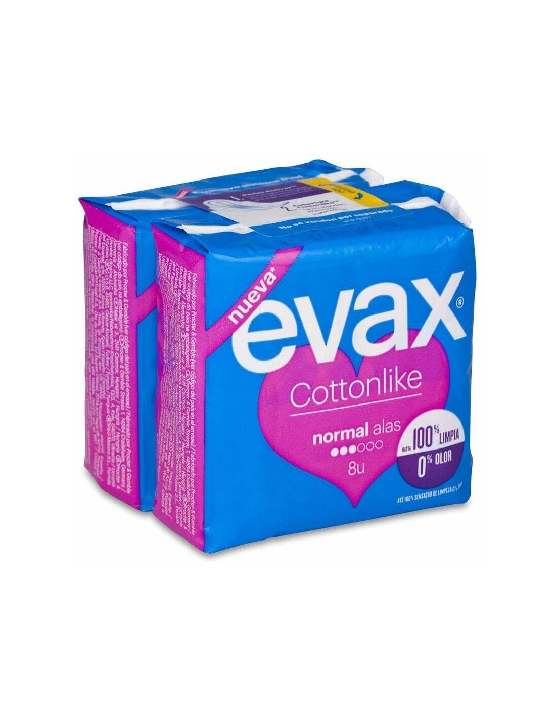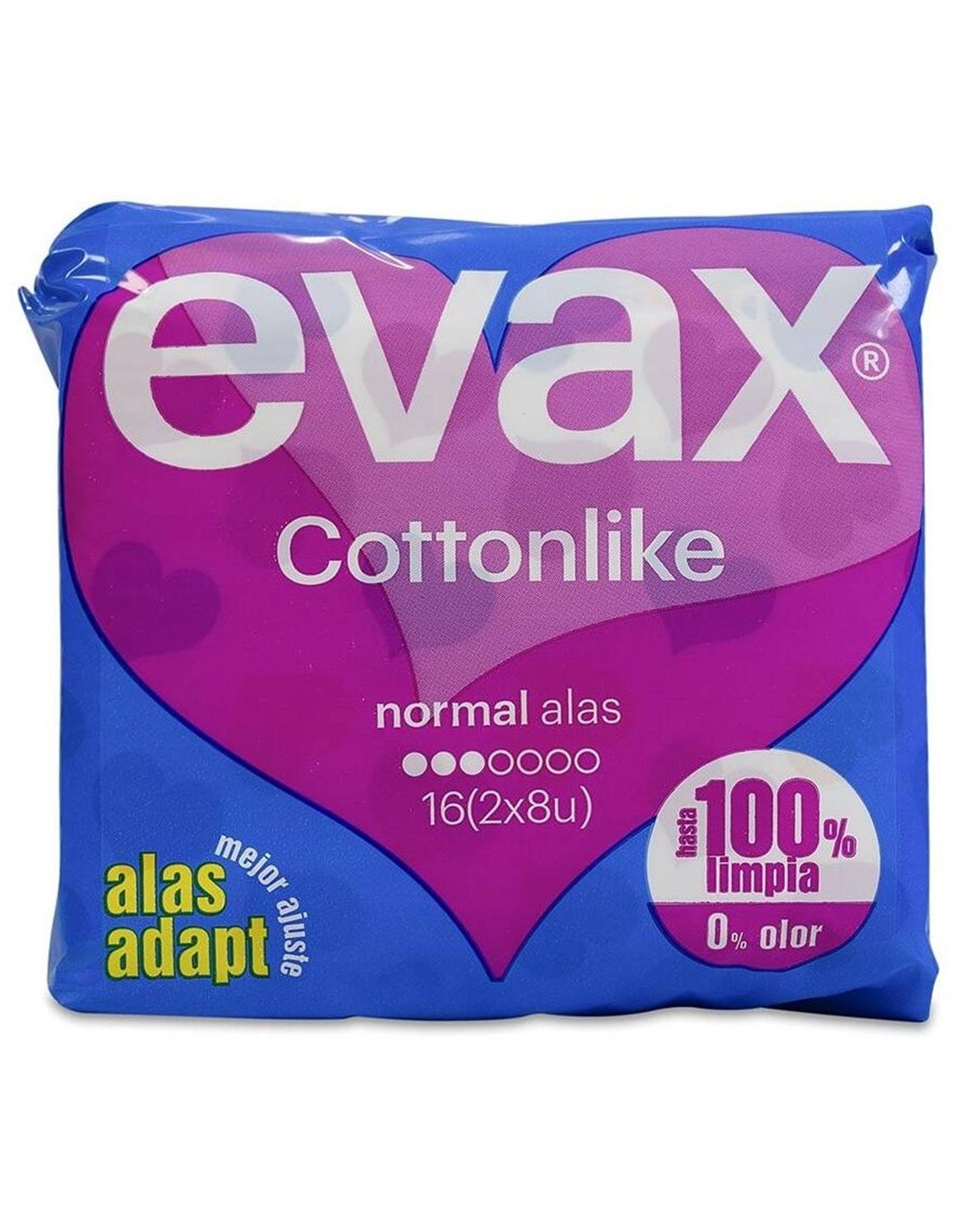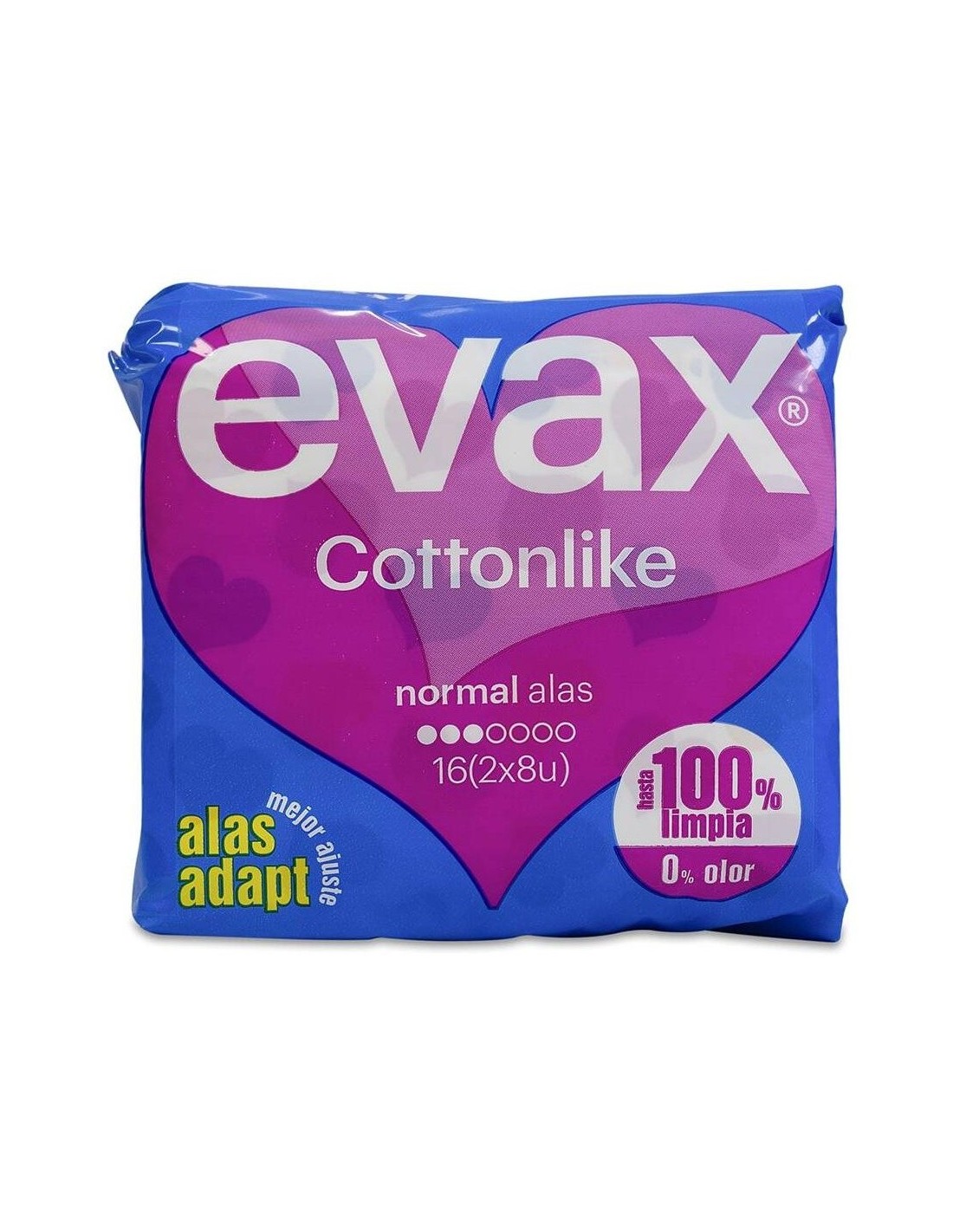 Cuenta con el Sistema EVAX Cottonlike Dual con perlas activas que neutralizan el olor y un núcleo que captura el flujo al instante, para ofrecer una absorción que mantiene hasta 100% limpia y 0% sin rastro de olor. Sus alas mantienen la compresa en su sitio y la cobertura Cottonlike ofrece un confort duradero. Para los días de mayor flujo. Producto testado dermatológicamente.