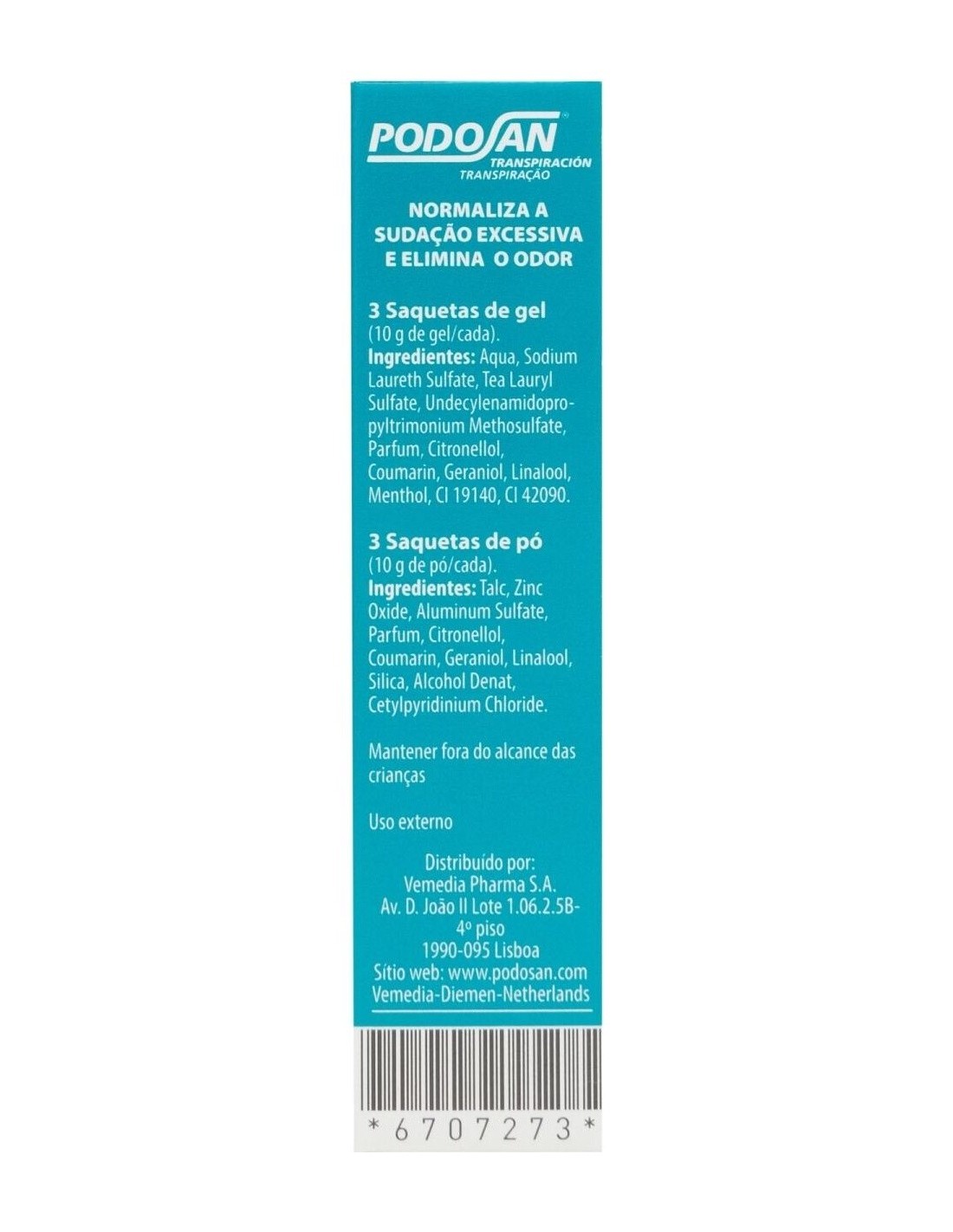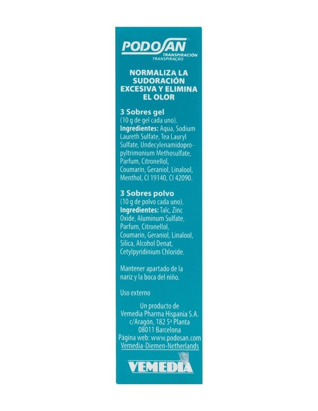 Podosan | Podosan Sobres 3 sobres de gel + 3 sobres en polvoLos sobres 3+3 de Podosan son el tratamiento más eficaz para normalizar la sudoración excesiva de los pies. Además, eliminar el olor desagradable y facilita la recuperación y descanso.