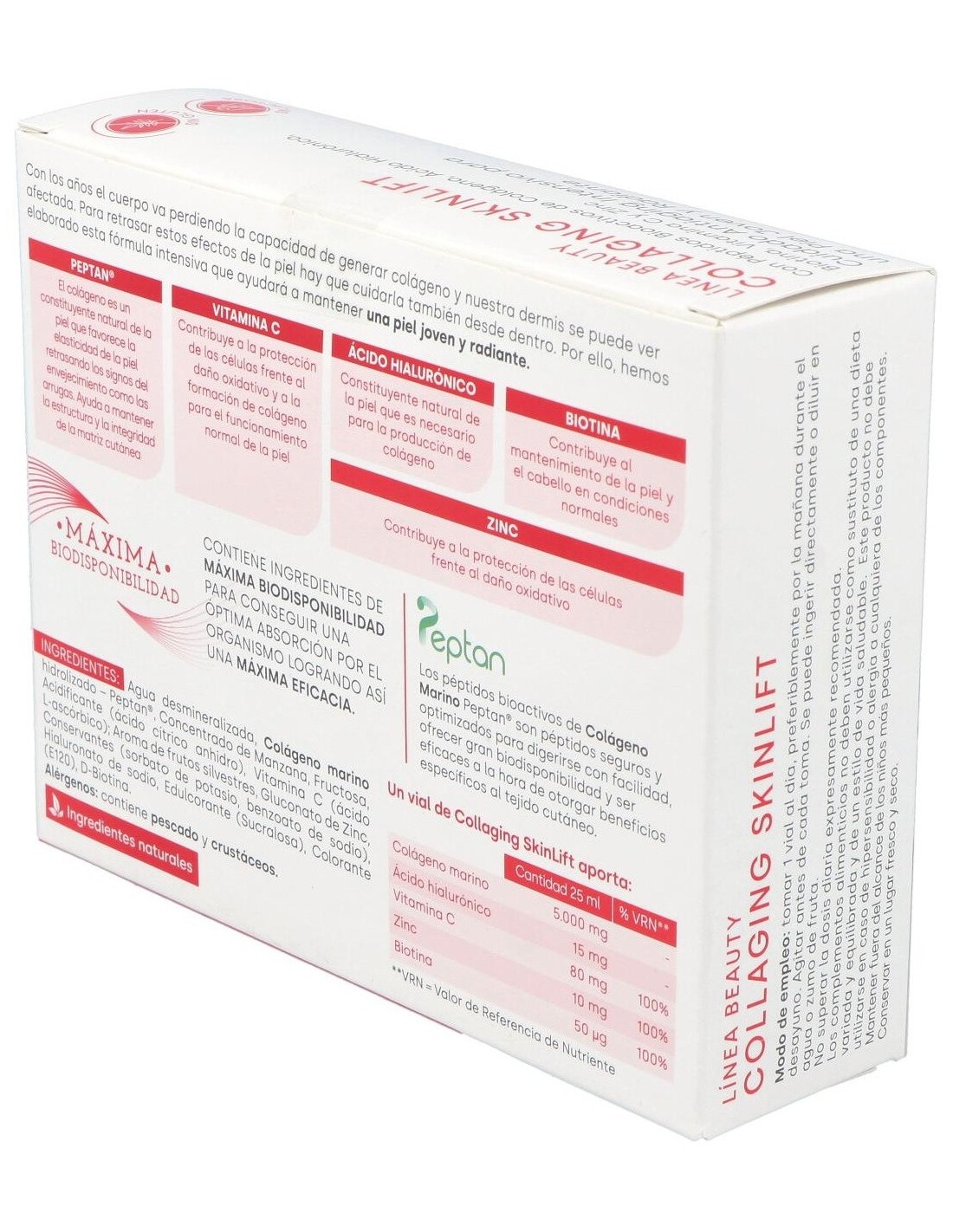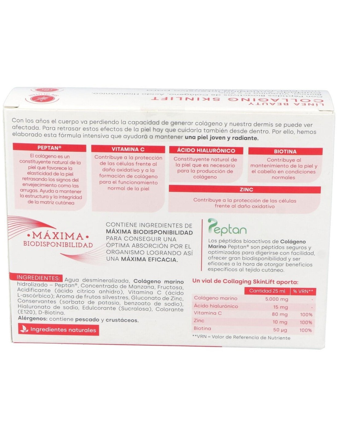 Agua desmineralizada, colágeno marino hidrolizado-Peptán, concentrado de manzana, fructosa, acidificante (ácido cítrico anhidro), vitamina C (ácido L-ascórbico), aroma de frutos silvestres, gluconato de zinc, conservantes (sorbato de potasio, benzoato de sodio), hialuronato de sodio, edulcorante (sucralosa), colorante (E-120), D-biotina.