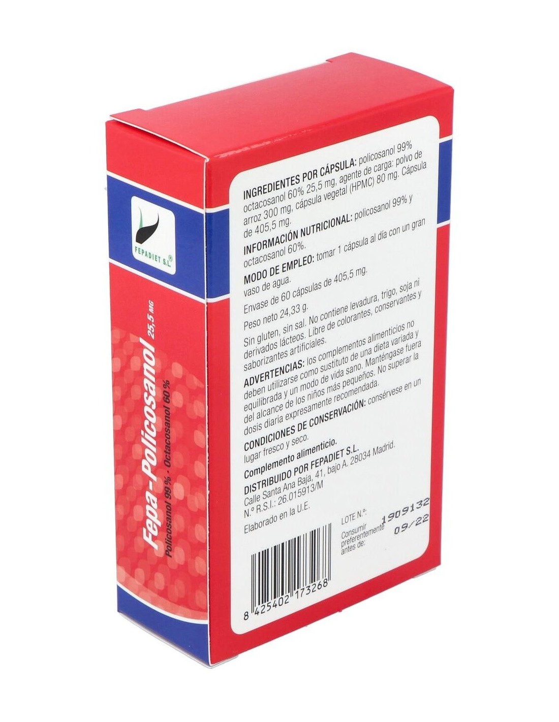 El producto está elaborado bajo controles de calidad que garantizan la pureza y concentración del policosanol. Su diseño en cápsulas permite una dosificación cómoda y práctica, ideal para quienes prefieren suplementos en formato sólido. Fepa-Policosanol 60Cap. de Fepadiet se presenta en un envase compacto que protege el contenido de la humedad y la luz.