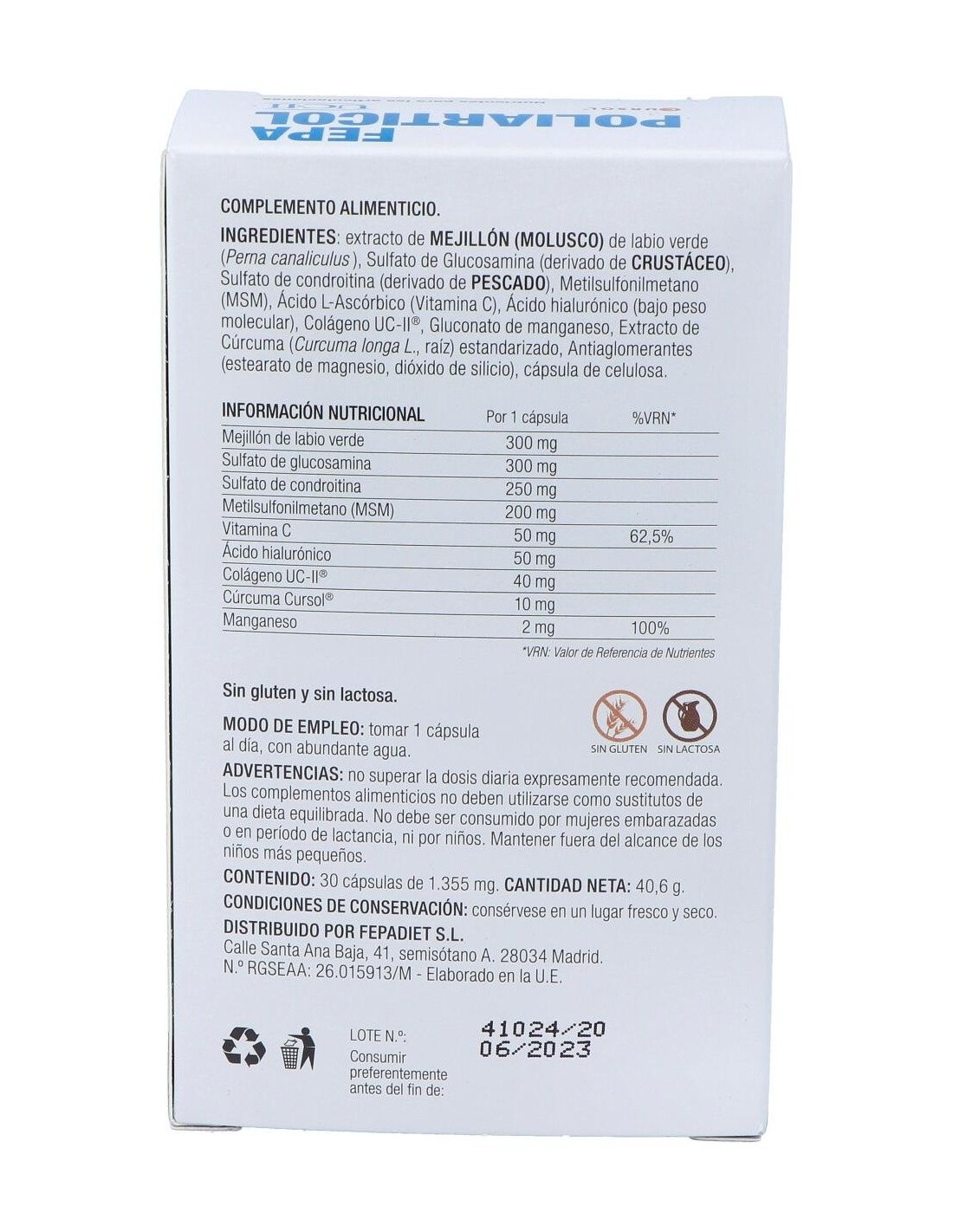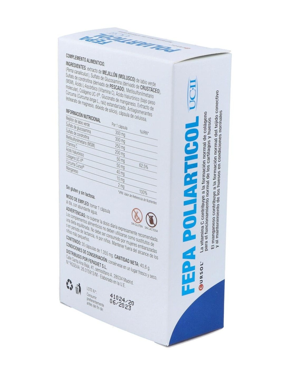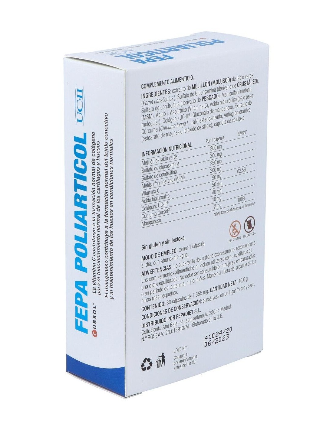 Extracto de MEJILLÓN (MOLUSCO) de labio verde (Perna canaliculus ), Sulfato de Glucosamina (derivado de CRUSTÁCEO), Sulfato de condroitina (derivado de PESCADO), Metilsulfonilmetano (MSM), Ácido L-Ascórbico (Vitamina C), Ácido hialurónico (bajo peso molecular), Colágeno UC-II®, Gluconato de manganeso, Extracto de Cúrcuma (Curcuma longa L., raíz) estandarizado, antiaglomerantes (estearato de magnesio, dióxido de silicio), cápsula de celulosa.