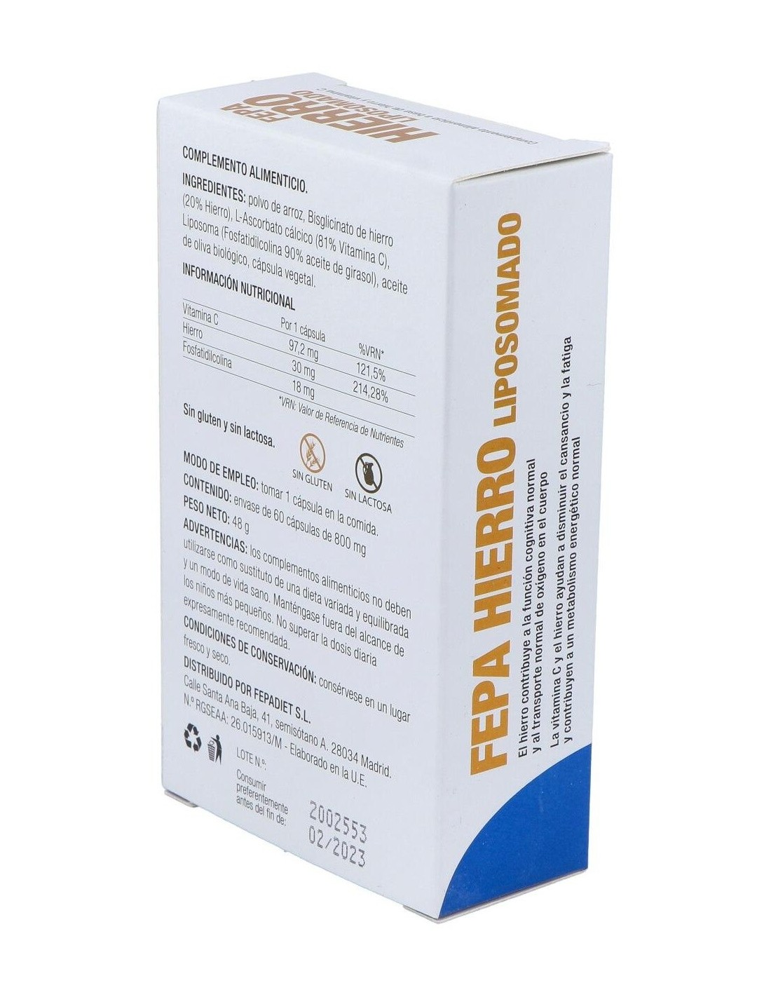 Polvo de arroz, bisglicinato de hierro (20% de hierro), ascorbato de calcio, cobertura (gelatina vegetal), fosfatidilcolina (90%), aceite de oliva biológico, antiaglomerante (estearato de magnesio).