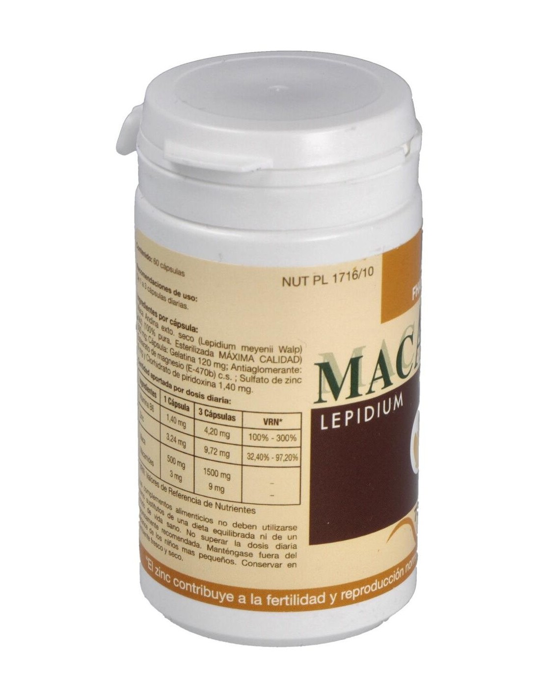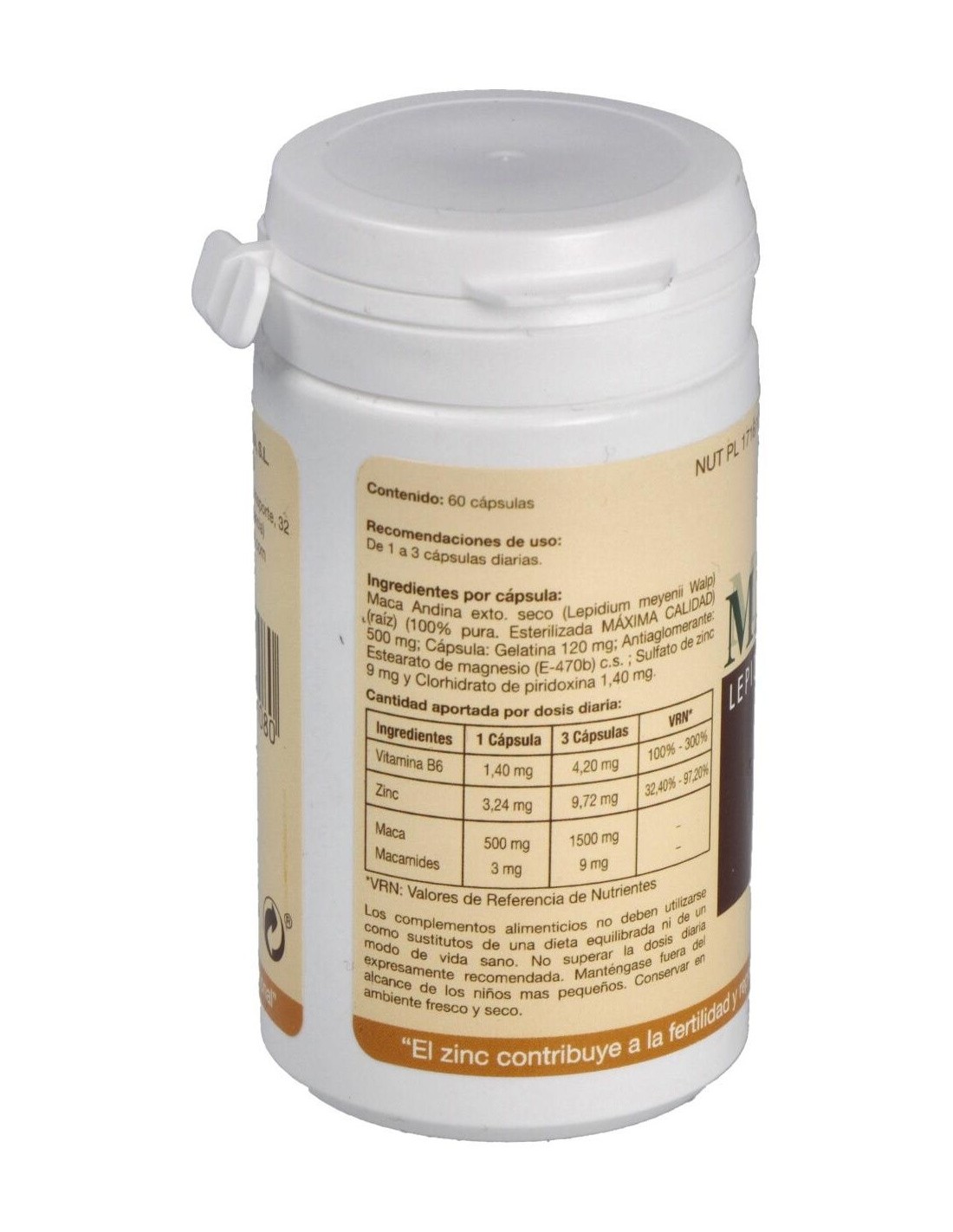 Maca Andina exto. seco (Lepidium Meyenii Walp) (raíz) (100% Pura. Esterilizada. máxima calidad) 500 mg: Cápsula: Gelatina 120 mg y Antiaglomerante: Estearato de magnesio (E- 470b) c.s.: Sulfato de zinc 9 mg y Clorhidrato de piridoxina (Vit. B6) 1,40 mg