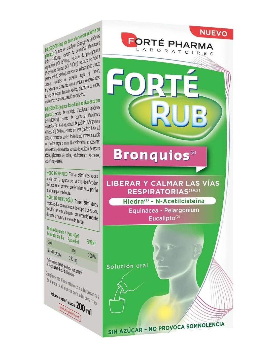 Forté Pharma Forté Rub Bronquios Jarabe 150ml es un jarabe cuya fórmula combina dos expectorantes, la N-acetilcisteína y la hiedra, para liberar los bronquios congestionados. Junto con el pelargonium, el aceite esencial de eucalipto, la equinácea y el cobre su acción favorece el confort respiratorio y refuerza la respuesta inmunitaria.