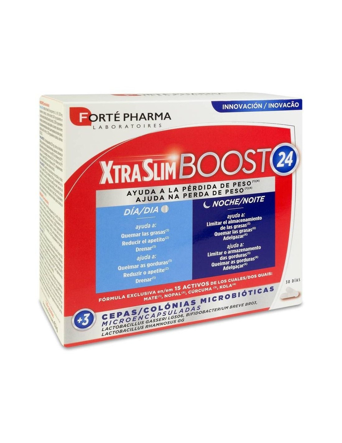 - La fórmula noche: Asocia 3 cepas microbióticas (Lactobacillus gasseri LGS06, Bifidobacterium breve BR03, Lactobacillus rhamnosus GG) con 12 mil millones de UFC*, a la inulina de achicoria y a los FOS (fructo-oligosacáridos). La cúrcuma ayuda a limitar el almacenamiento de las grasas(3) y la Kola ayuda a adelgazar(4). Enzimas y minerales completan la fórmula.