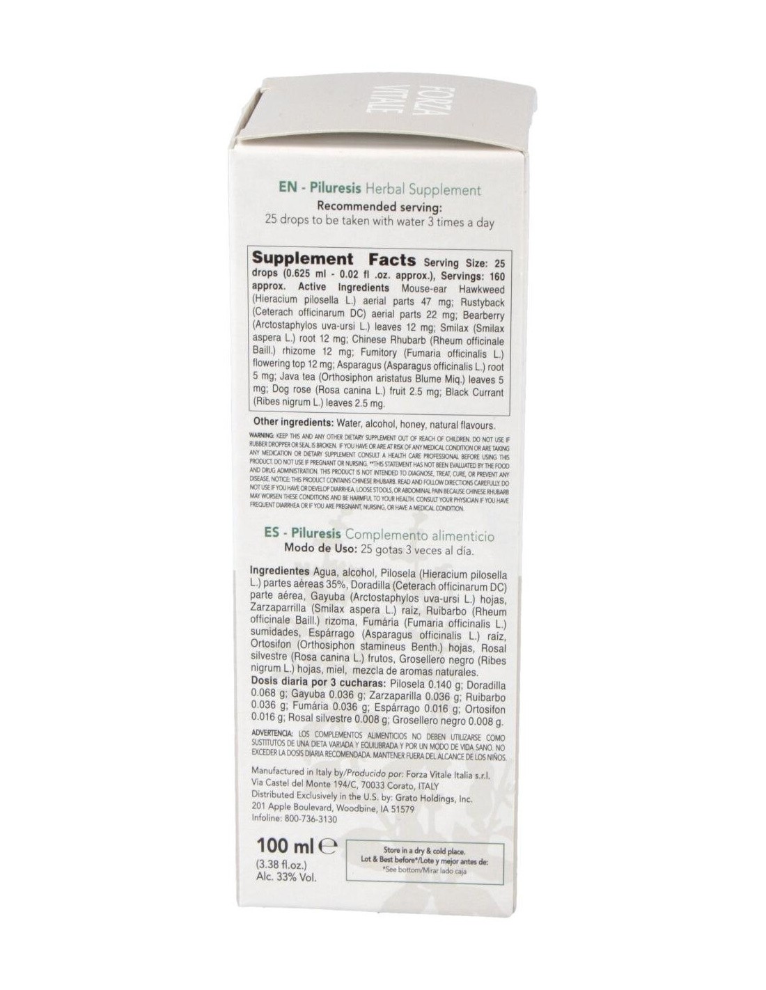 Ingredientes:Agua, Alcohol, Vellosilla (Hieracium Vellosilla) partes aéreas 35%, Rompepiedra (Ceterach officinarum) partes aéreas, Uva ursina (Arctostaphylos uva-ursi) hojas, Zarzaparrilla (Smilax aspera) raíz, Ruibarbo (Rheum officinale) raíz, Fumaria (Fumaria officinalis) sumidades, Espárrago (Asparagus officinalis) raíz, Ortosifón (Orthosiphon stamineus) hojas, Rosal silvestre (Rosal silvestre) frutos, Grosellero negro (Ribes nigrum) hojas, miel, mezcla de aromas naturales. Ingredientes activos por dosis diaria (2 ml):