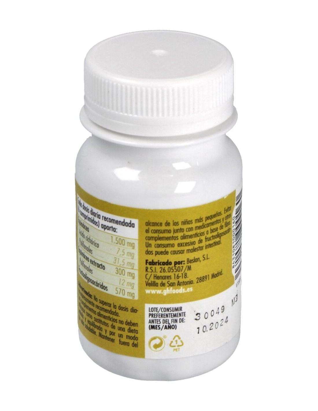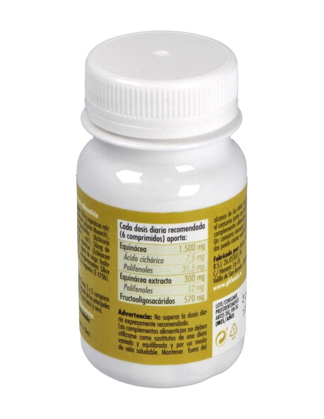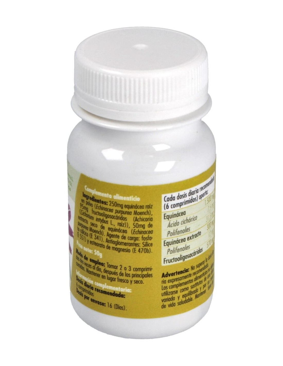 El producto está elaborado con ingredientes seleccionados para asegurar la calidad y estabilidad del extracto de equinácea. Su formato en comprimidos facilita el almacenamiento y transporte, ideal para quienes buscan comodidad y orden en su suplementación.
