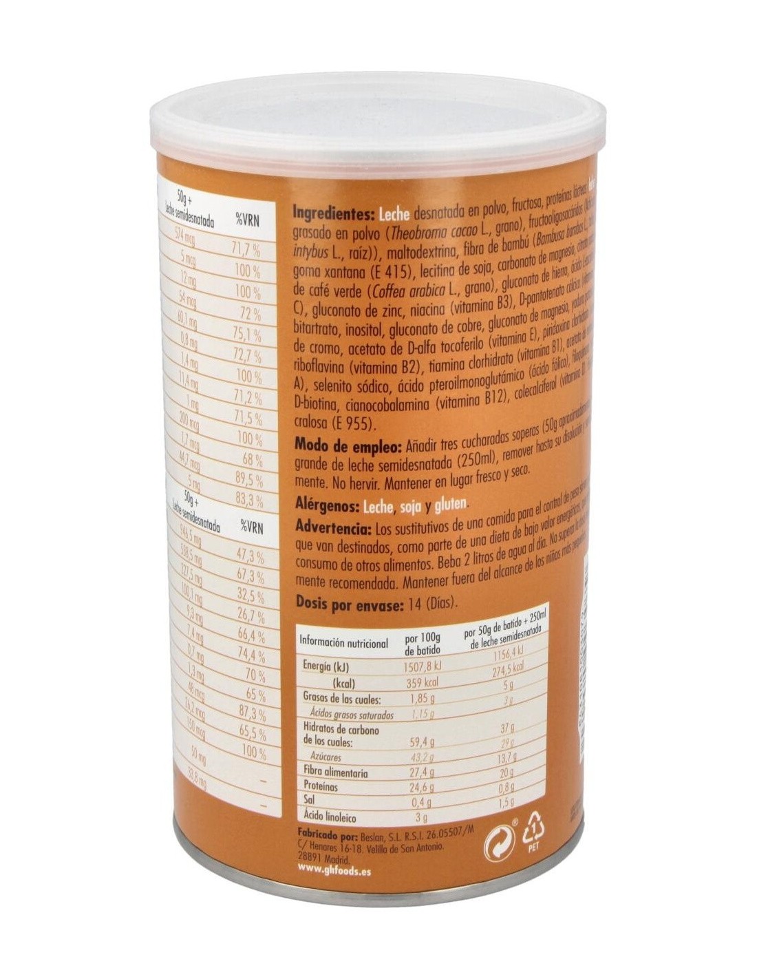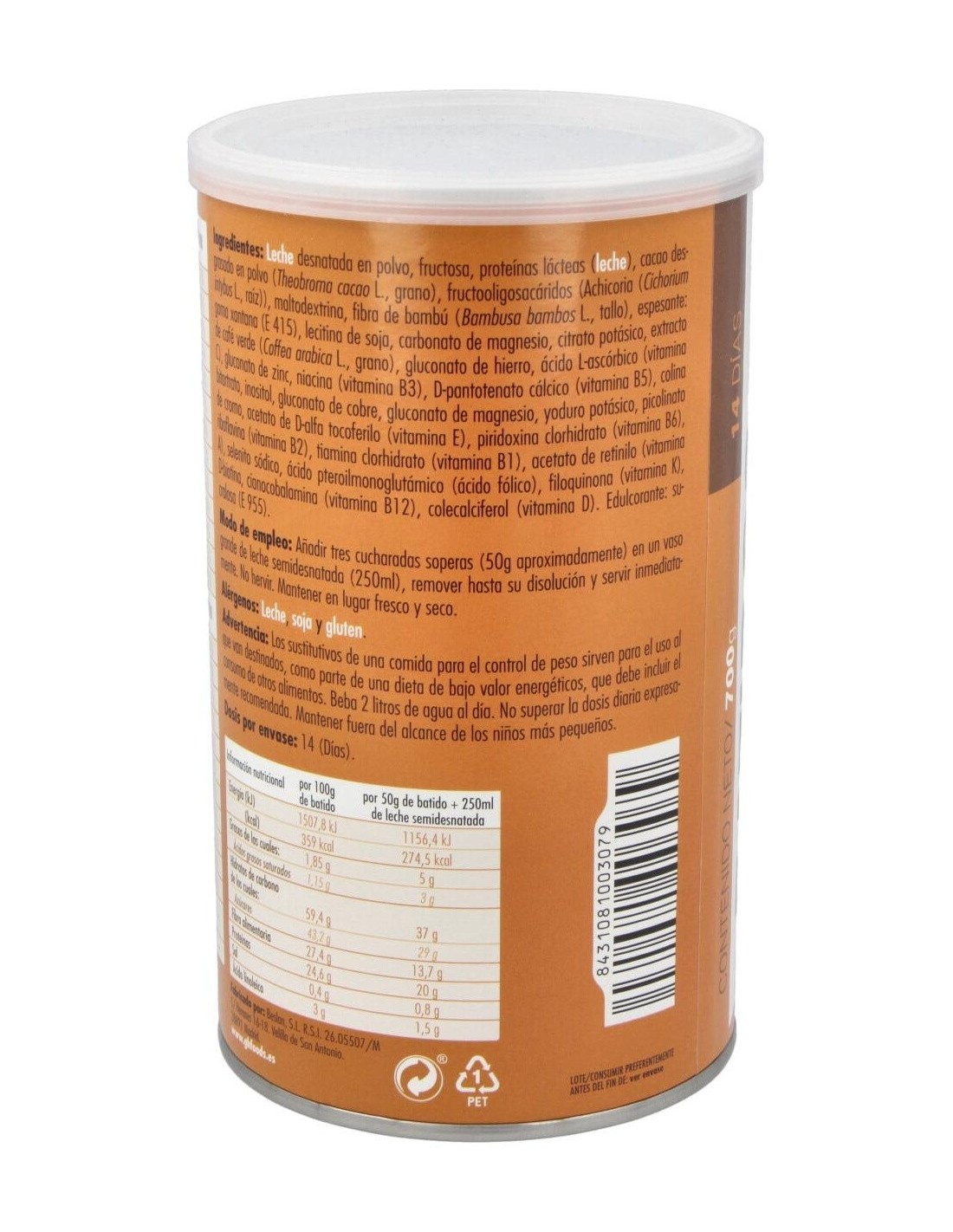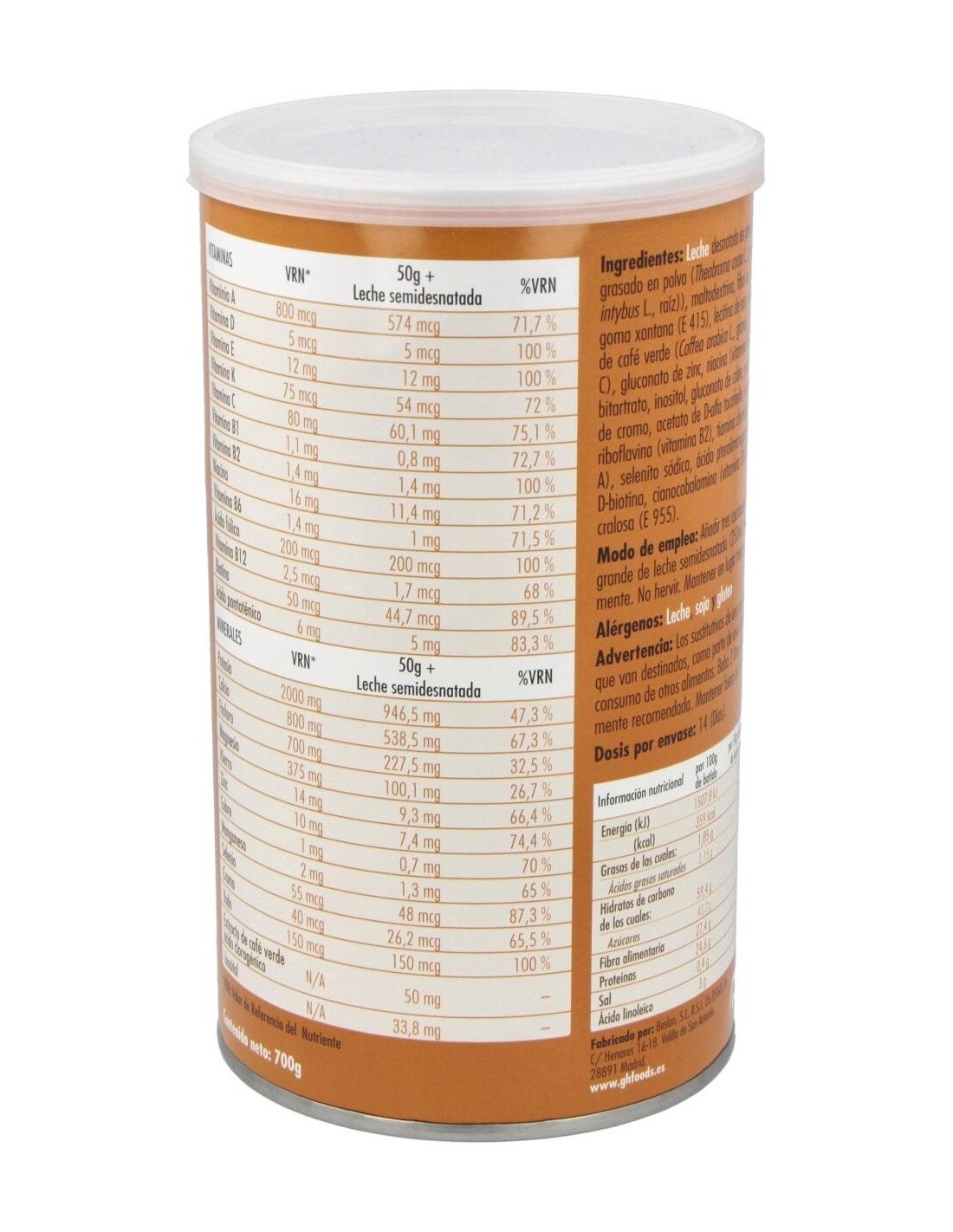 Leche desnatada en polvo, fructosa, proteínas lácteas (leche), cacao desgrasado (Theobroma cacao L., grano), fructooligosacáridos (Achicoria (Cichorium intybus L. raíz)), maltodextrina, fibra de bambú (Bambusa bambos L., tallo). Espesante: goma xantana. Lecitina de soja, carbonato de magnesio, citrato potásico, extracto de café verde (Coffea arabica L., grano), gluconato de hierro, vitamina C (ácido Lascórbico), gluconato de zinc, vitamina B3 (nicotinamida), vitamina B5 (D-pantotenato cálcico), colina bitartrato, inositol, gluconato de cobre, gluconato de manganeso, yoduro potásico, picolinato de cromo, vitamina E (D-alfa-tocoferilo), vitamina B6 (piridoxina clorhidrato), vitamina B2 (riboflavina), vitamina B1 (tiamina clorhidrato), vitamina A (acetato de retinilo), selenito sódico, ácido fólico (ácido pteroilmonoglutámico), vitamina K (filoquinona), D-biotina, vitamina B12 (cianocobalamina) y vitamina D3 (colecalciferol). Edulcorante: sucralosa (E955).