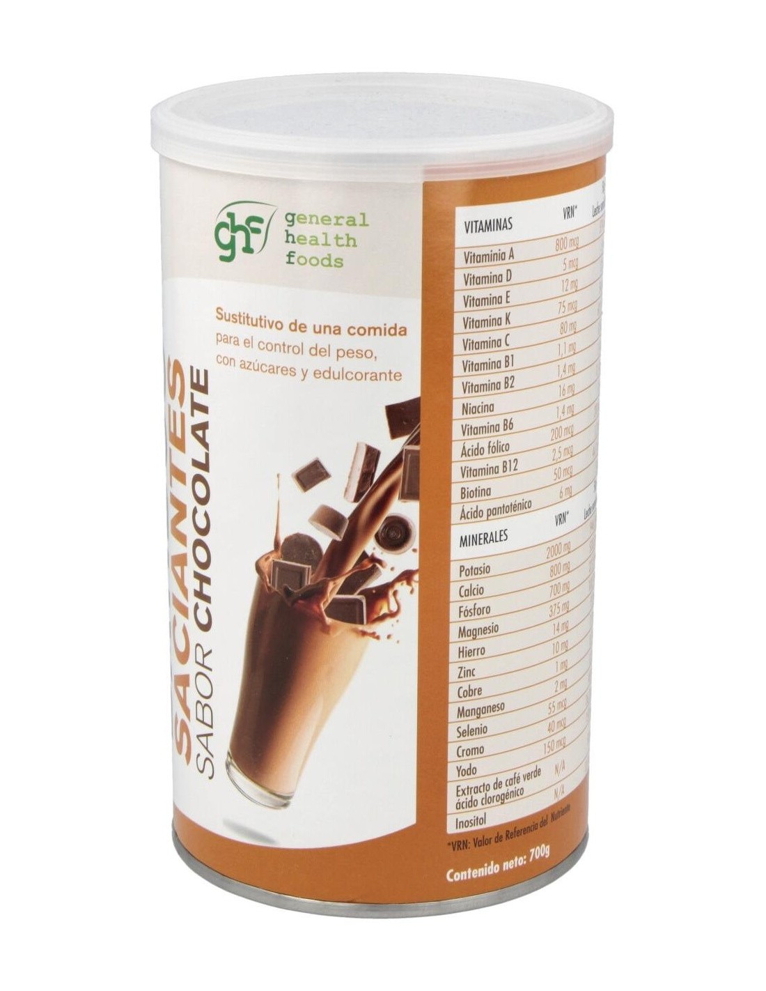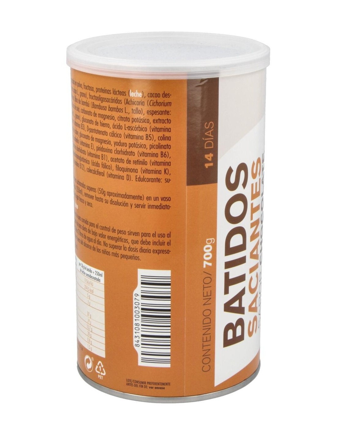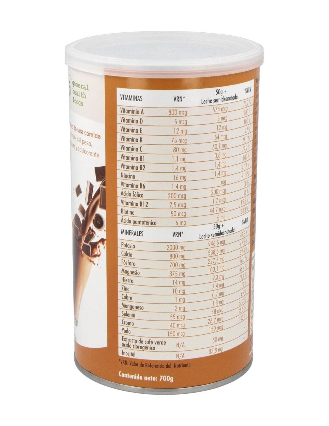 Leche desnatada en polvo, fructosa, proteínas lácteas (leche), cacao desgrasado (Theobroma cacao L., grano), fructooligosacáridos (Achicoria (Cichorium intybus L. raíz)), maltodextrina, fibra de bambú (Bambusa bambos L., tallo). Espesante: goma xantana. Lecitina de soja, carbonato de magnesio, citrato potásico, extracto de café verde (Coffea arabica L., grano), gluconato de hierro, vitamina C (ácido Lascórbico), gluconato de zinc, vitamina B3 (nicotinamida), vitamina B5 (D-pantotenato cálcico), colina bitartrato, inositol, gluconato de cobre, gluconato de manganeso, yoduro potásico, picolinato de cromo, vitamina E (D-alfa-tocoferilo), vitamina B6 (piridoxina clorhidrato), vitamina B2 (riboflavina), vitamina B1 (tiamina clorhidrato), vitamina A (acetato de retinilo), selenito sódico, ácido fólico (ácido pteroilmonoglutámico), vitamina K (filoquinona), D-biotina, vitamina B12 (cianocobalamina) y vitamina D3 (colecalciferol). Edulcorante: sucralosa (E955).