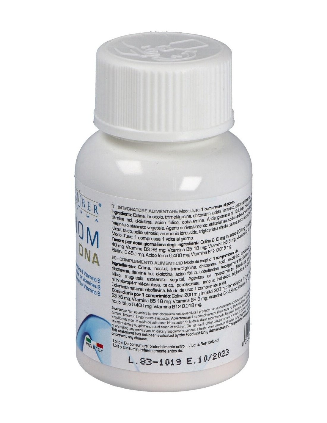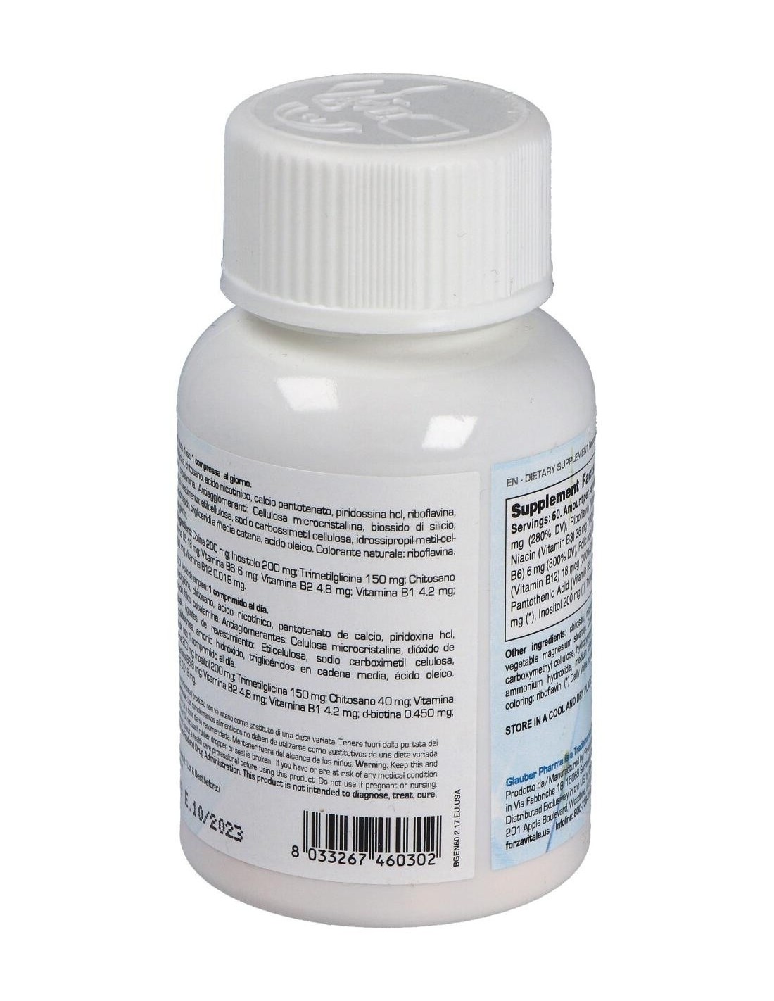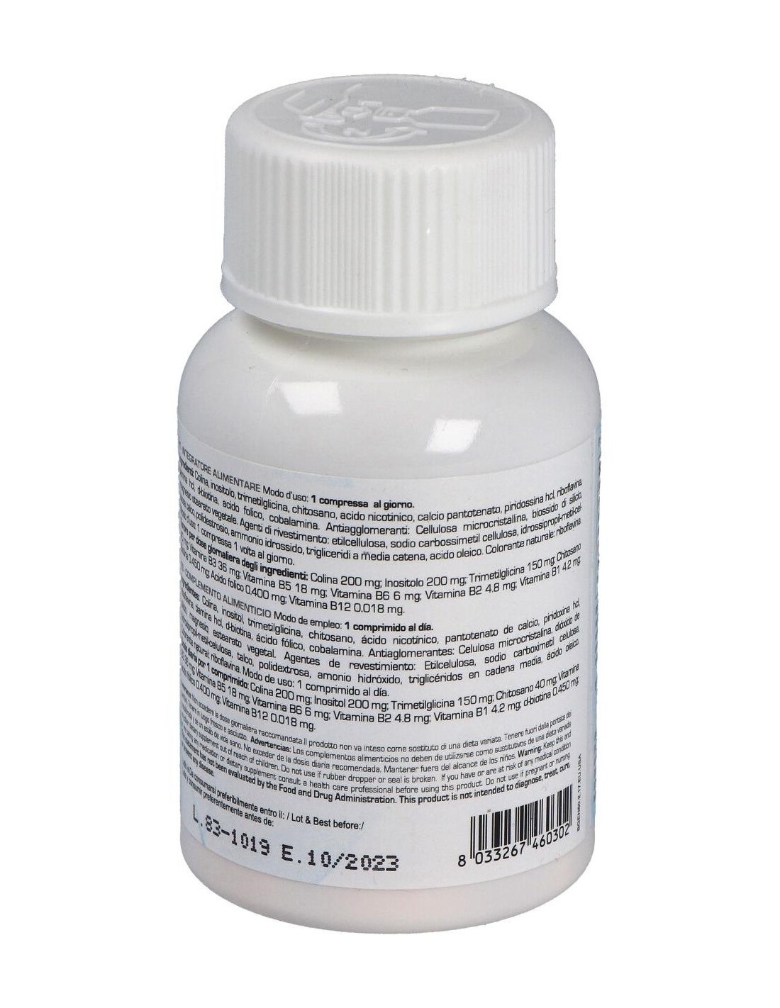 Colina 200 mg, inositol 200 mg, trimeltimicina 10 mg, quitosano 40 mg, vitamina B3, B5, B6, B2, B1, biotina, ácido fólico y vitamina B12.