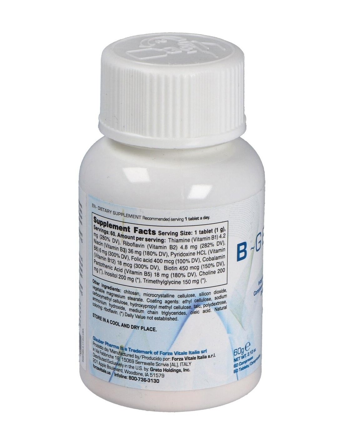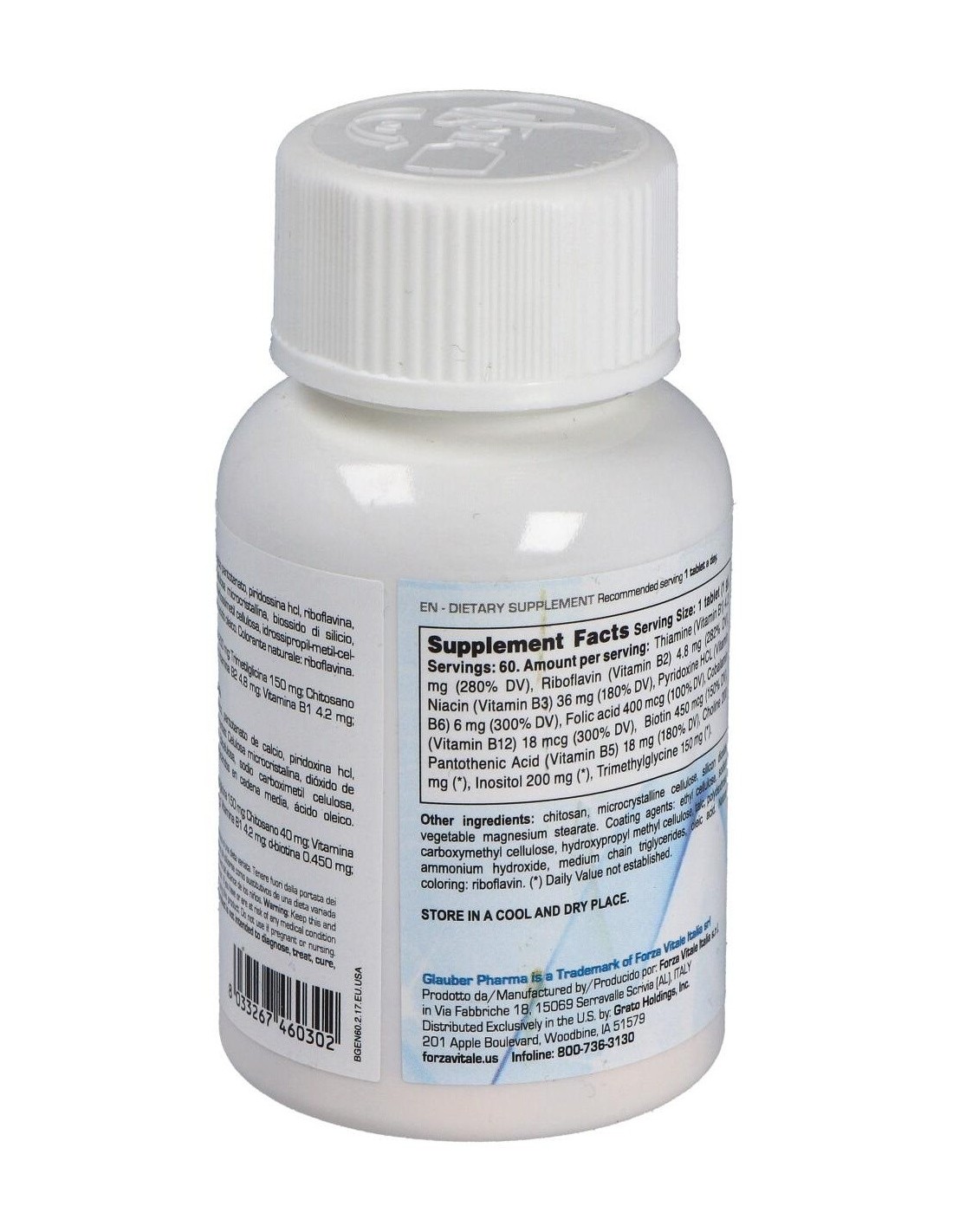 Antiaglomerantes: Celulosa microcristalina, bióxido de silicio, magnesio estearato vegetal. Agentes di revestimiento: etilcelulosa, sodio carboximetil celulosa, hidroxipropil-metil-celulosa, talco, polidextrosa, amonio hidróxido, triglicéridos de cadena media, ácido oleico. Colorante natural: riboflavin.