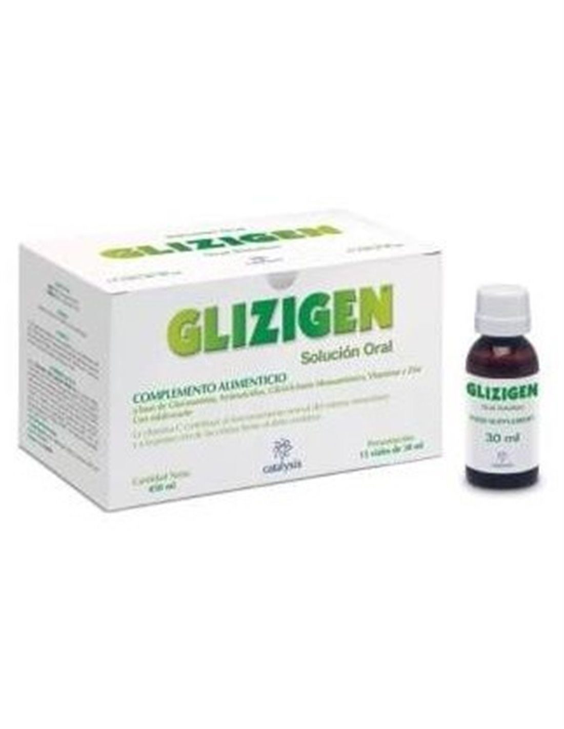 Complemento nutricional con ácido glicirricínico activado, vitaminas, minerales y aminoácidos. Contiene ácido glicirricínico activado y vitaminas y minerales. El Zinc, vitaminas C, B6 y B12 contribuyen al funcionamiento normal del sistema inmune. Zinc y vitamina C ayudan al mantenimiento de una piel normal y protegen frente al estrés oxidativo.\ \ El producto Glizigen solución oral se ha desarrollado para apoyar el normal mantenimiento de la piel y del sistema inmune, gracias a que contiene una variedad de vitaminas, como la vitamina C, que contribuye a mantener el normal funcionamiento del sistema inmunológico y a proteger las células frente al daño oxidativo, así como el Zinc, que ayuda a la normal función de la piel.\ En resumen, Glizigen es un producto con una composición altamente mejorada, para aquellos que buscan ayudar, así como aportando nutrientes para dar apoyo a su sistema inmune y al bienestar general.