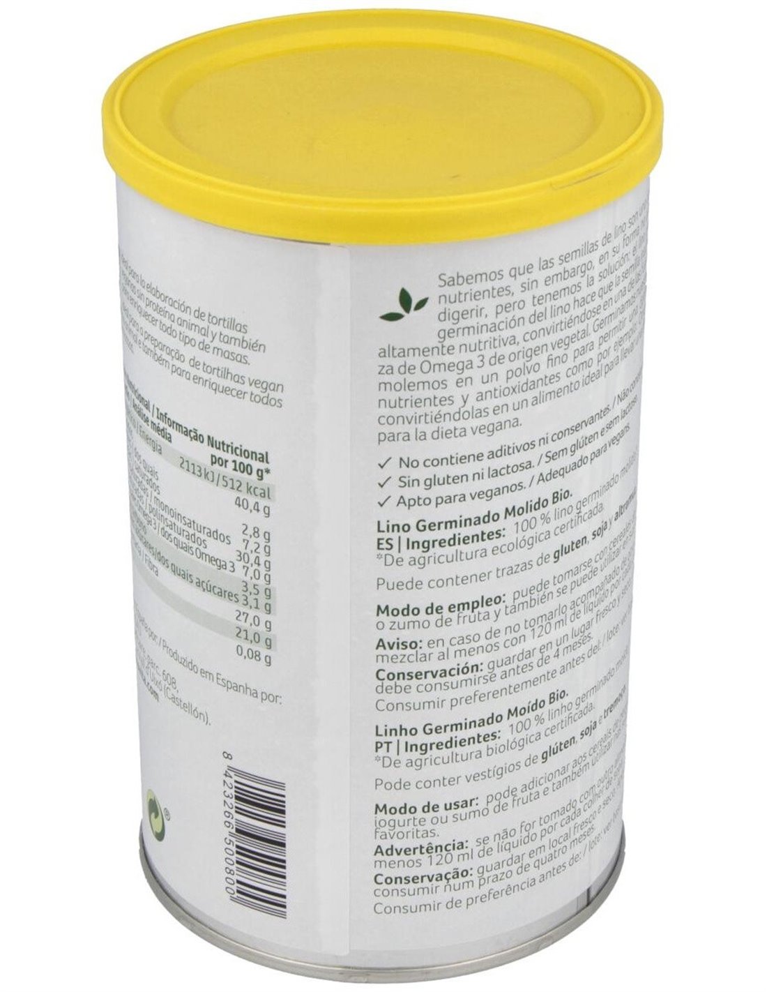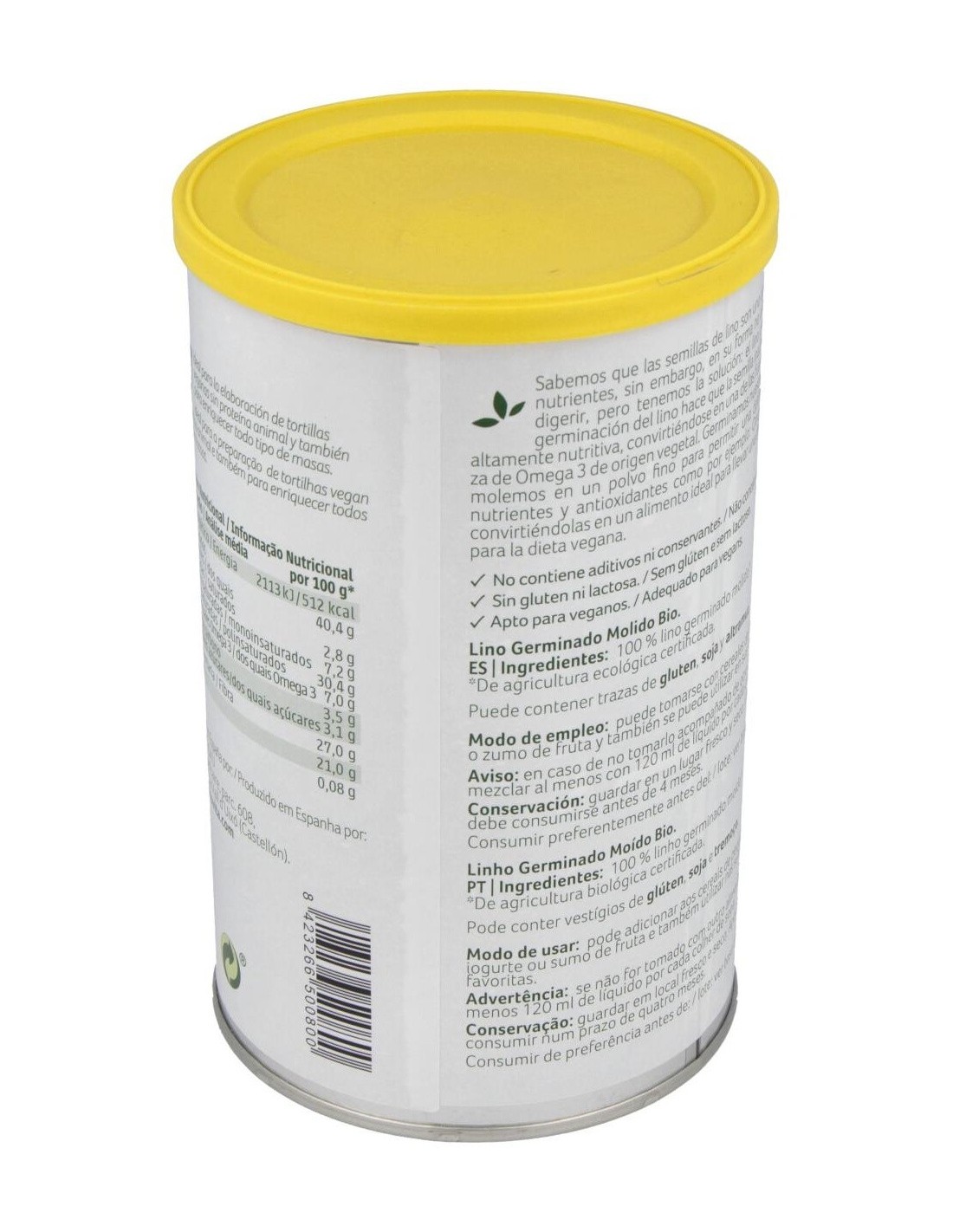 Ingredientes:100 % lino germinado molido*. (*)=De cultivo ecológico.Valor nutricional por 100 gramos: