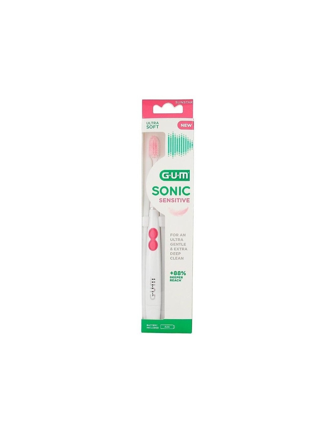El cepillo sónico GUM SONIC SENSITIVE ofrece una limpieza ultrasuave y más profunda para dientes y encías sensibles. Se ha demostrado que sus filamentos ultrasuaves, a doble nivel y de forma cónica en ambos extremos eliminan un 88% más la placa en áreas de difícil acceso. Elegante, cómodo y sin cables. Hasta 3 meses de uso con la pila AAA proporcionada. Capuchón protector y 3 anillos de color para personalizar el cepillo. Cabezal reemplazable . Compatible con cabezales de recambio para GUM SONIC SENSITIVE, GUM SONIC DAILY y GUM ActiVital® SONIC