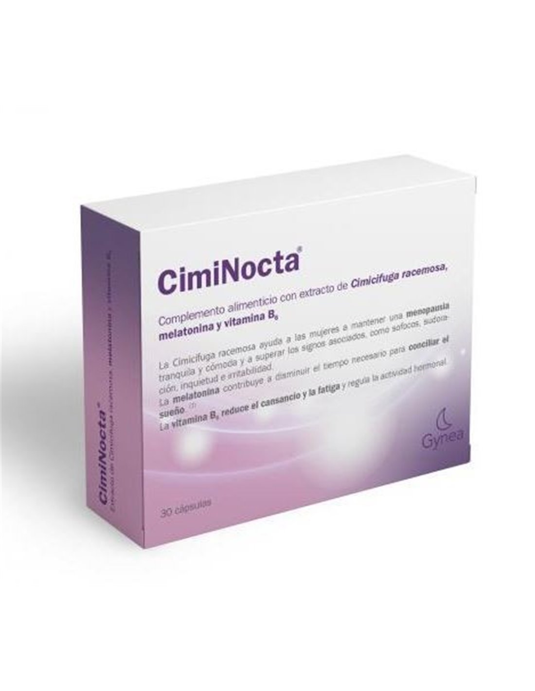 CimiNocta es un suplemento que está especialmente formulado para aliviar los síntomas ocasionados por la menopausia o premenopausia, como sofocos, cansancio, fatiga, diferencia en la actividad hormonal o alteraciones de sueño. Este complemento alimenticio puede ser consumido por personas celíacas, intolerantes al huevo, alérgicos a la proteína de leche o intolerantes a la lactosa. Su formulación es a base de extracto de cimifuga racemosa (mejora los sofocos, la sudoración y el nerviosismo), melatonina (ayuda con el insomnio) y vitamina B6 (promueve el equilibrio hormonal). Este producto se presenta en una caja con 30 cápsulas. Se recomienda tomar una al día, alrededor de 30 minutos antes de dormir. Se debe tener en cuenta que este es un complemento alimenticio que nunca debe sustituir una dieta diaria equilibrada. No debe ser administrado a niños.