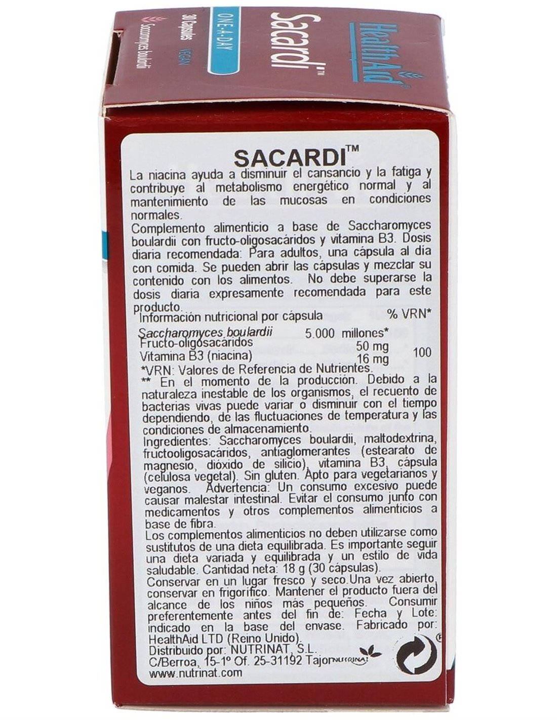 Sacardi (Saccharomyces Boulardii) 30Vcaps. de Health Aid es un suplemento probiótico para personas que buscan apoyar la salud digestiva, formulado con Saccharomyces Boulardii para contribuir al equilibrio intestinal.