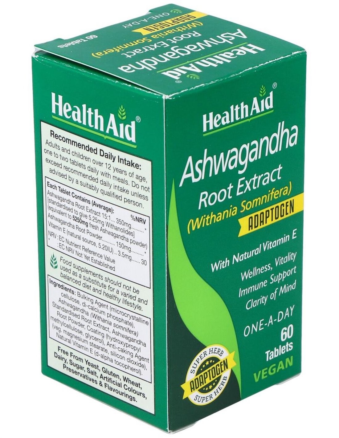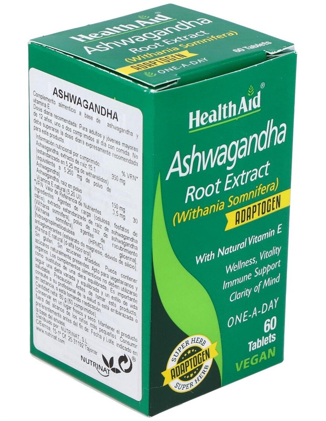 Ashwagandha 60Comp. de Health Aid es un suplemento natural para adultos que ayuda a mantener el equilibrio físico y mental, formulado con extracto estandarizado para apoyar la respuesta al estrés diario.