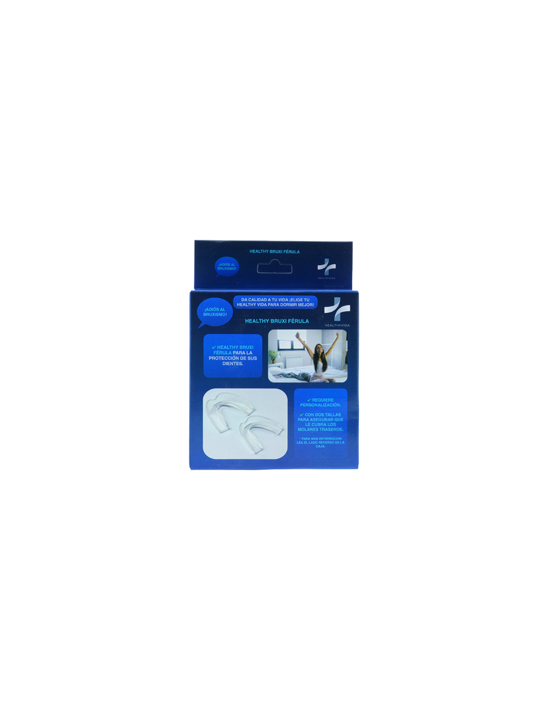 HEALTHY VIDAHEALTHY BRUXI Férula está indicada para aquellas personas que produzcan roce y rechinamiento no funcional de los dientes. Requiere personalización para su fácil adaptación en la boca. Fabricado con material totalmente hipoalergénico. Se presentan las férulas en un embolsado estéril, dentro de una caja protectora que también se podrá utilizar para guardarla después de su uso y en el interior contiene el folleto de instrucciones.\ Esta férula ayuda a disminuir los síntomas del bruxismo:\ Protegerá y disminuirá la presión de los dientes.\ Relajará la mandíbula.\ Aliviará el dolor de cabeza y las tensiones relacionada con el rechinamiento y el desgaste dentales.