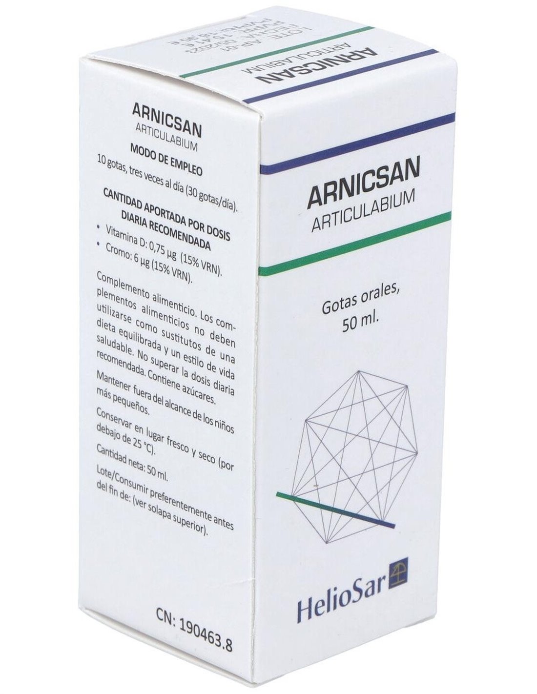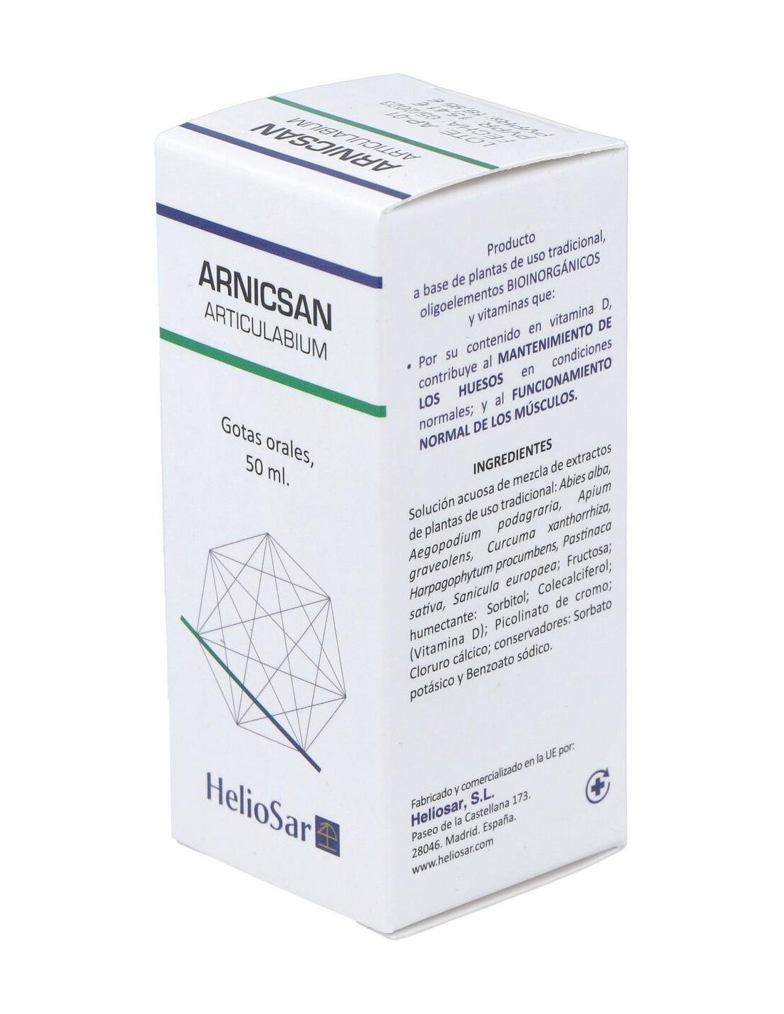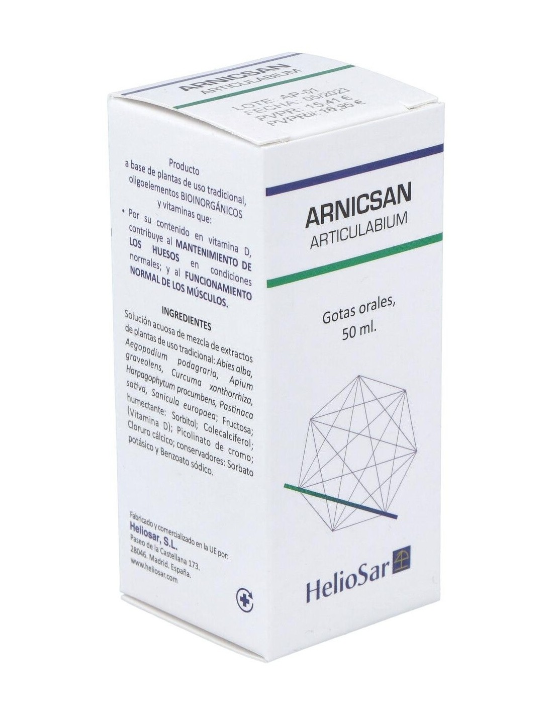Arnicsan Articulabium HelioSar, complemento alimenticio para tratamiento homeopático. Fórmula con contenido en vitamina D que contribuye al mantenimiento de los huesos en condiciones normales; y al funcionamiento normal de los músculos. El producto resulta en solución acuosa de mezcla de extractos de plantas de uso tradicional: Abies alba, Aegopodium podagraria, Apium graveolens, Curcuma xanthorrhiza, Harpagophytum procumbens, Pastinaca sativa, Sanicula europaea, Fructosa, Sorbitol, Colecalciferol, (Vitamina D), Picolinato de cromo, Cloruro cálcico.