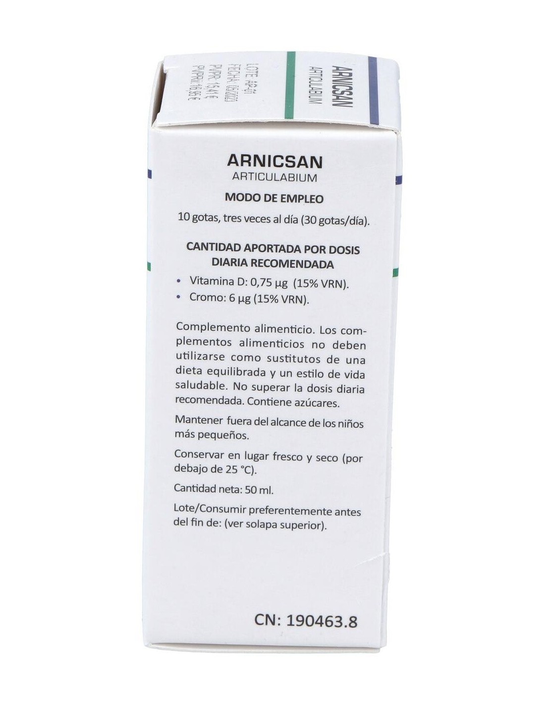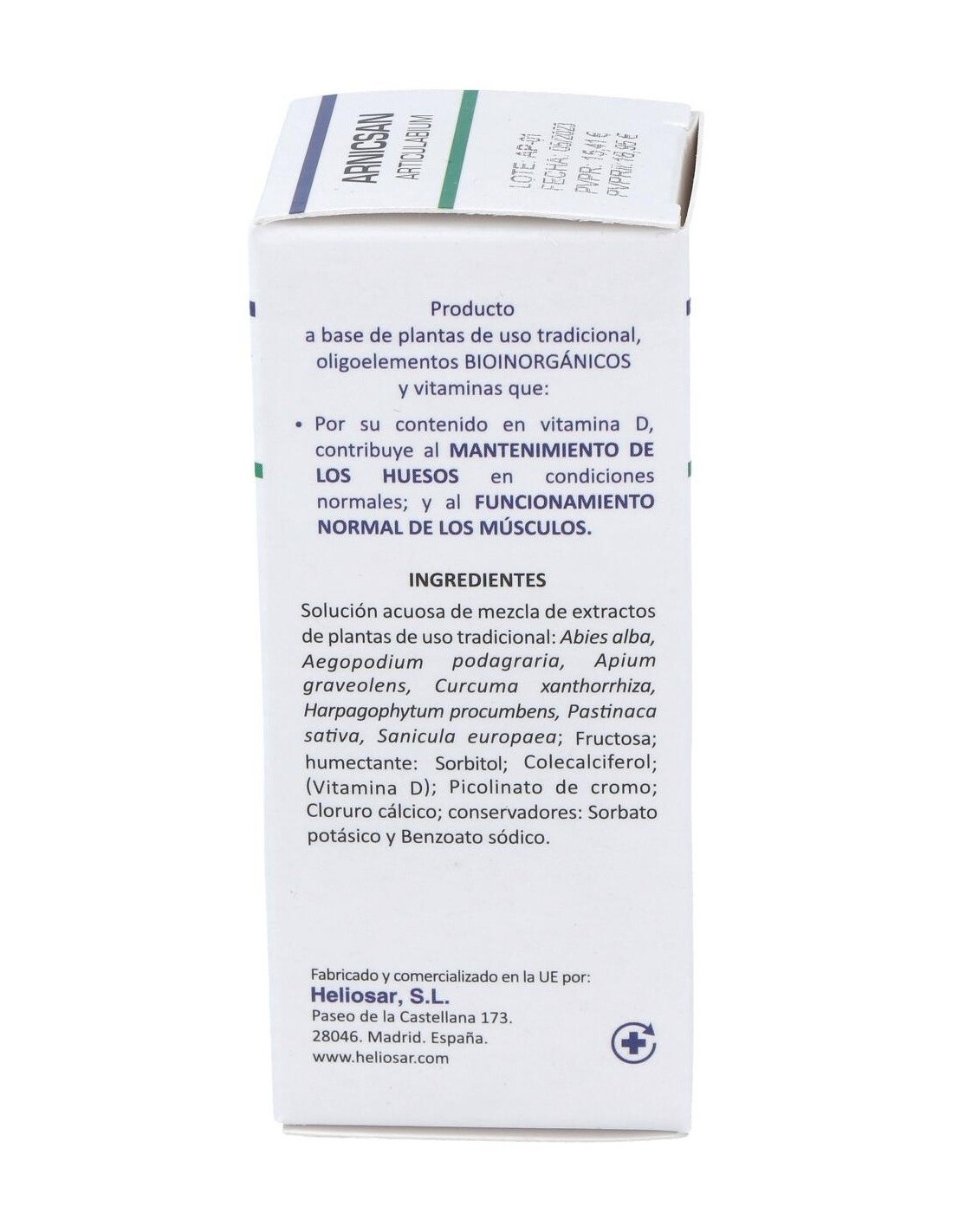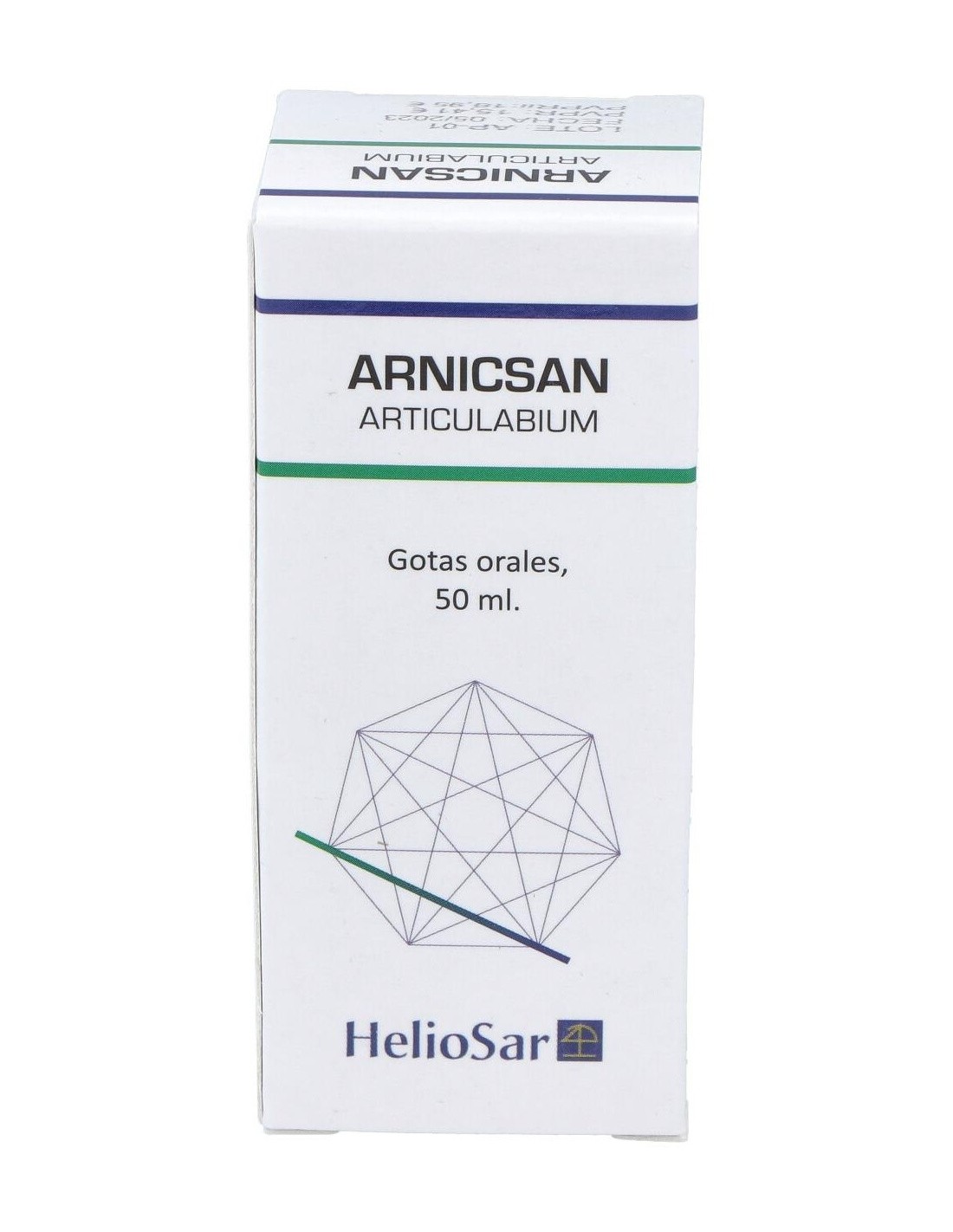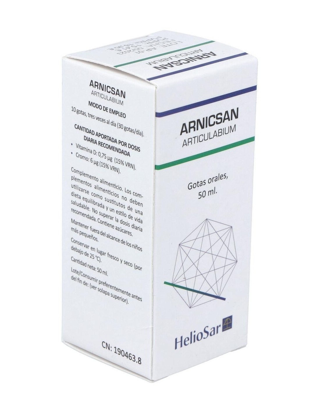 Arnicsan Articulabium HelioSar, complemento alimenticio para tratamiento homeopático. Fórmula con contenido en vitamina D que contribuye al mantenimiento de los huesos en condiciones normales; y al funcionamiento normal de los músculos. El producto resulta en solución acuosa de mezcla de extractos de plantas de uso tradicional: Abies alba, Aegopodium podagraria, Apium graveolens, Curcuma xanthorrhiza, Harpagophytum procumbens, Pastinaca sativa, Sanicula europaea, Fructosa, Sorbitol, Colecalciferol, (Vitamina D), Picolinato de cromo, Cloruro cálcico.