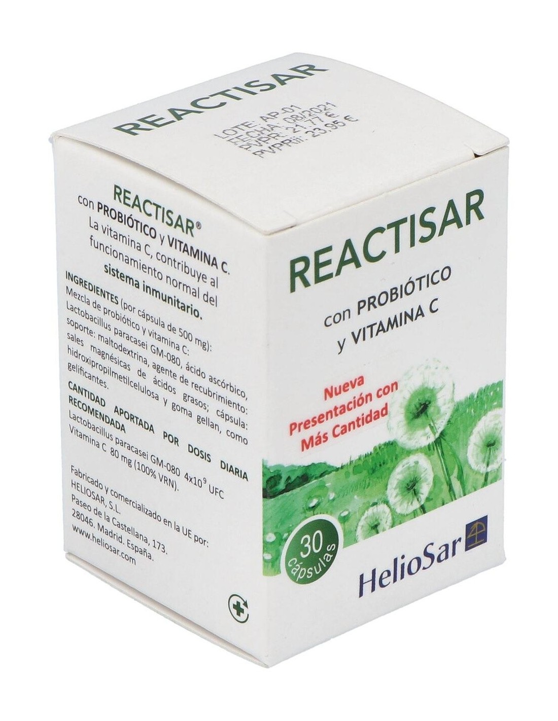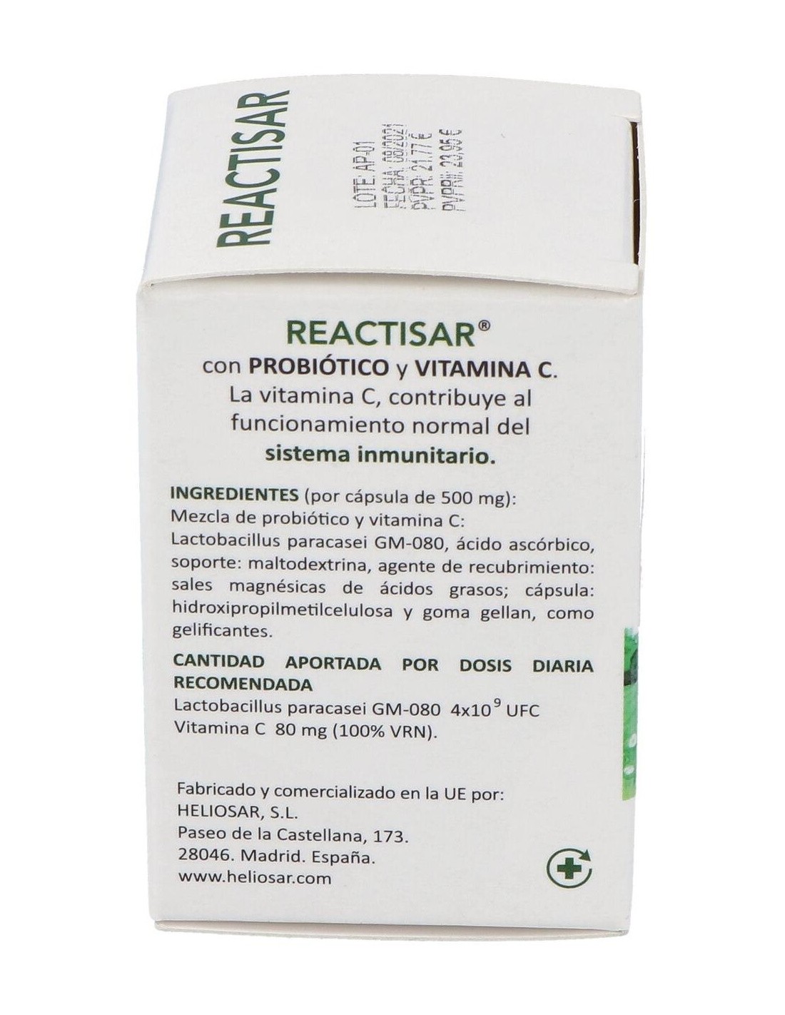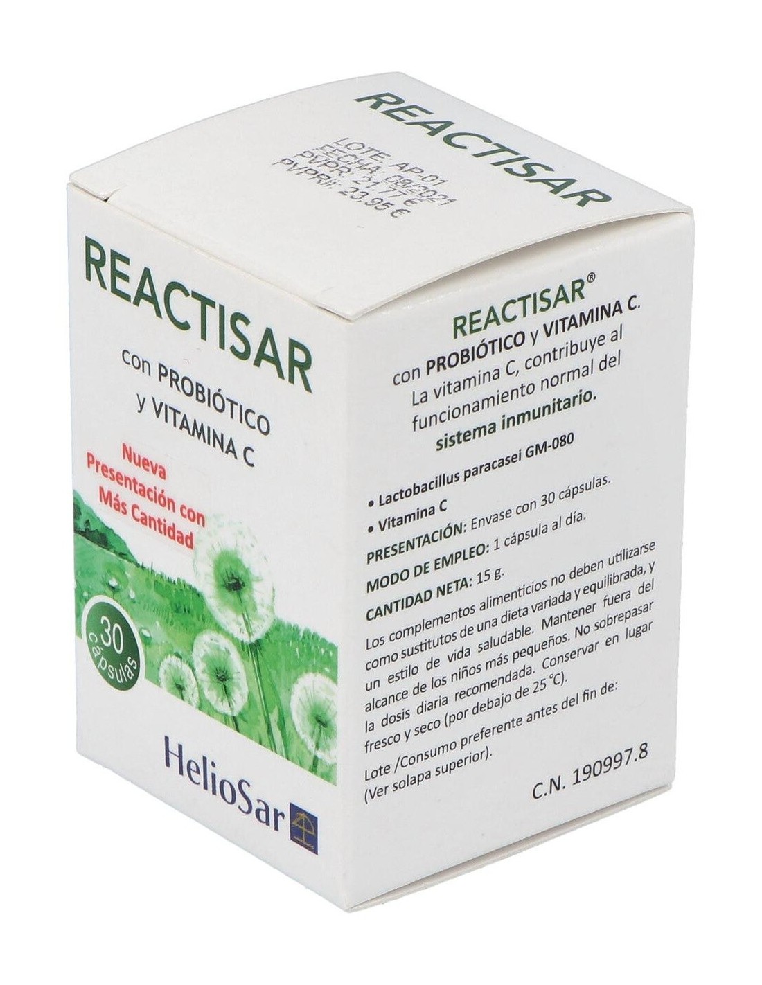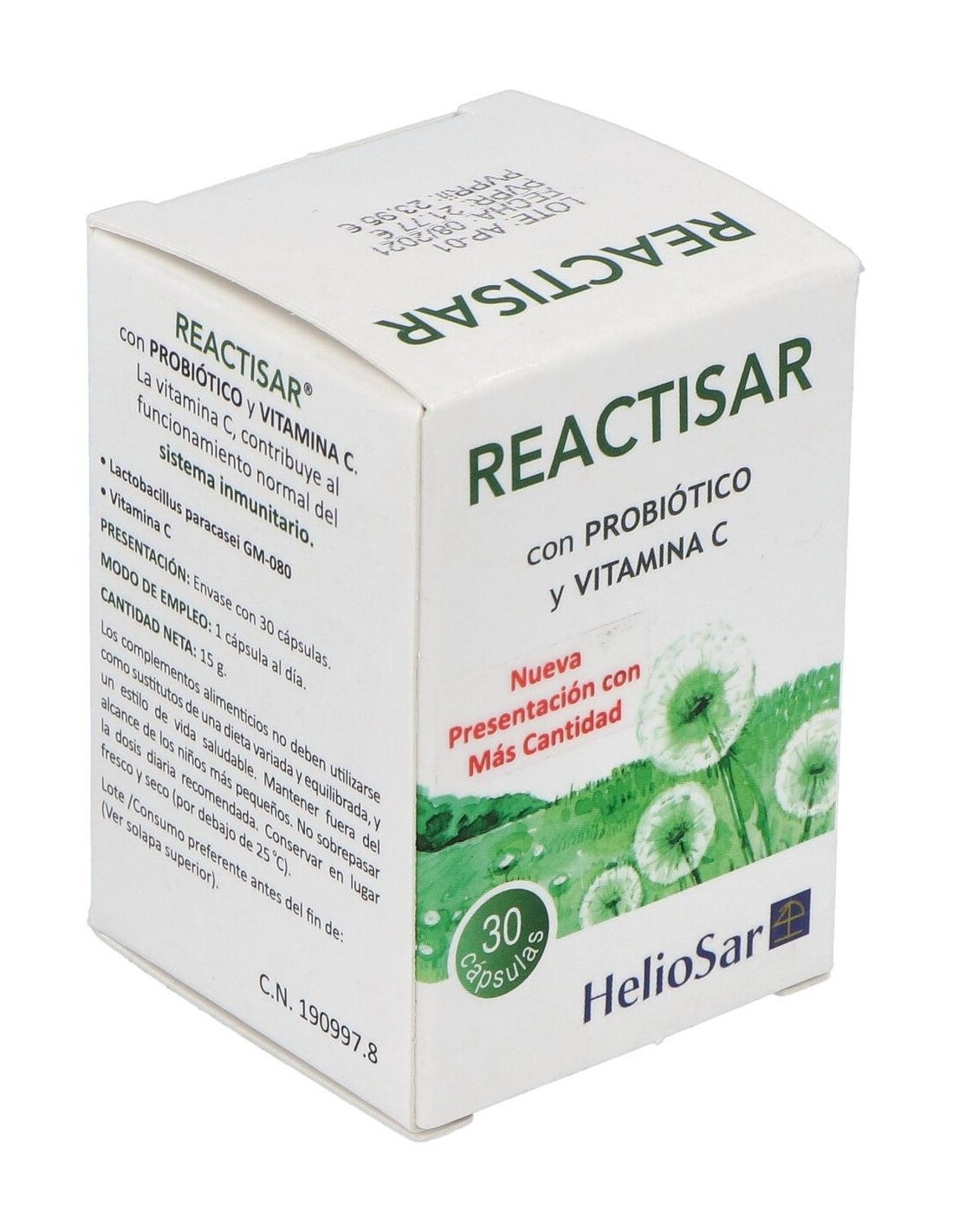El suplemento alimenticio Reactisar de Heliosar está indicado para reforzar el sistema inmunitario. Su fórmula contiene vitamina C y el probiótico Lactobacillus paracasei GM-080. La vitamina C es un antioxidante que eleva las defensas del organismo. Su presencia en estas cápsulas contribuye a disminuir alergias, rinitis, estornudos y enrojecimiento de ojos. También ayuda en casos de irritación cutánea. Al combinarse con los lactobacilos, promueve la salud intestinal. Restaura su mucosa y regula la microflora que puede dañarse por inflamaciones provocadas por agentes externos.
