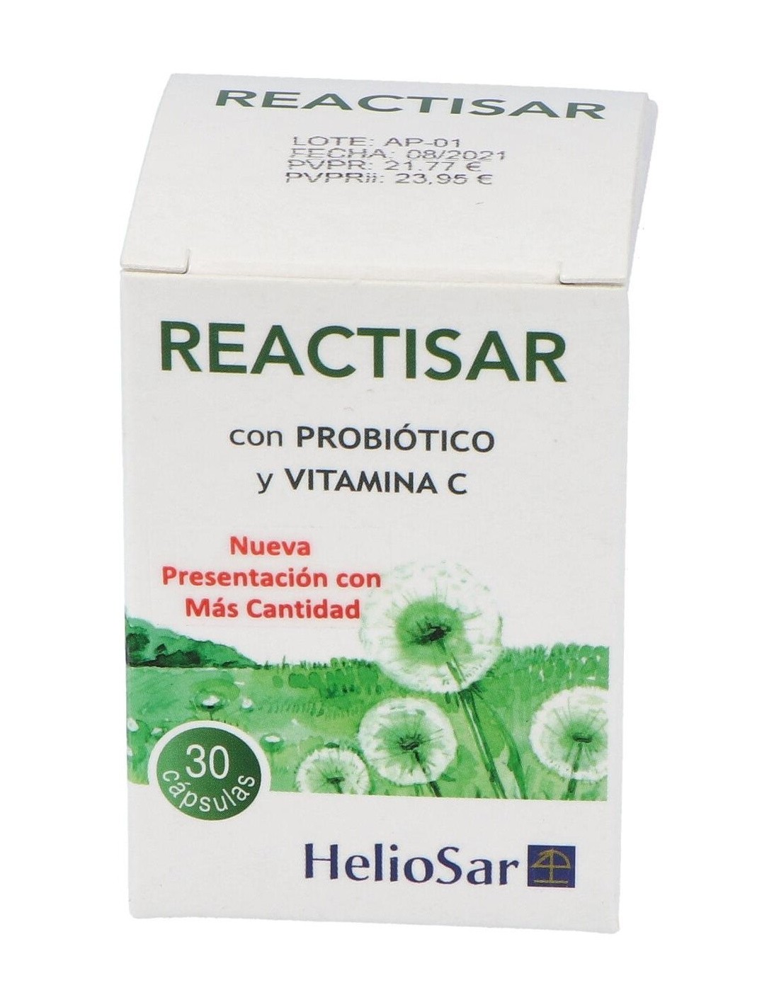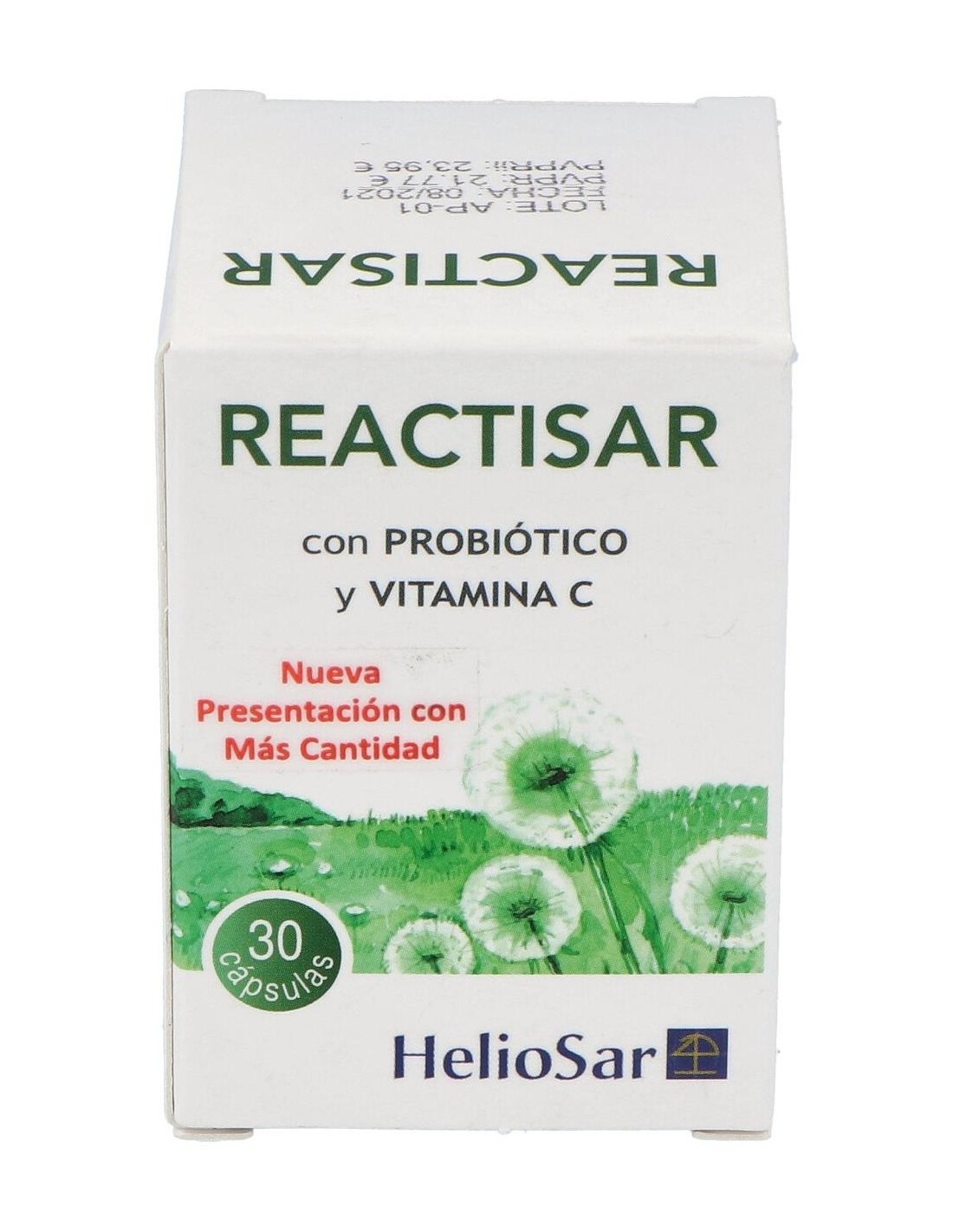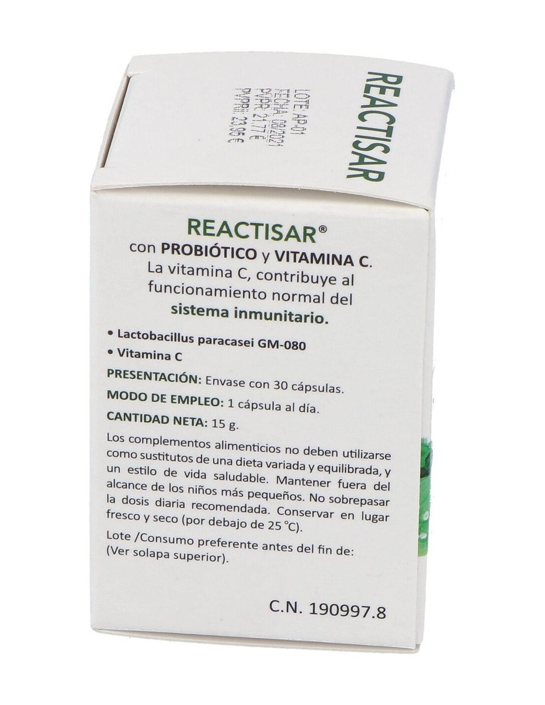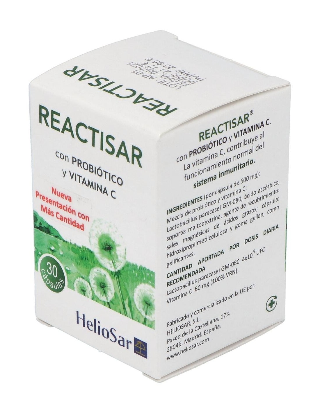 El suplemento alimenticio Reactisar de Heliosar está indicado para reforzar el sistema inmunitario. Su fórmula contiene vitamina C y el probiótico Lactobacillus paracasei GM-080. La vitamina C es un antioxidante que eleva las defensas del organismo. Su presencia en estas cápsulas contribuye a disminuir alergias, rinitis, estornudos y enrojecimiento de ojos. También ayuda en casos de irritación cutánea. Al combinarse con los lactobacilos, promueve la salud intestinal. Restaura su mucosa y regula la microflora que puede dañarse por inflamaciones provocadas por agentes externos.