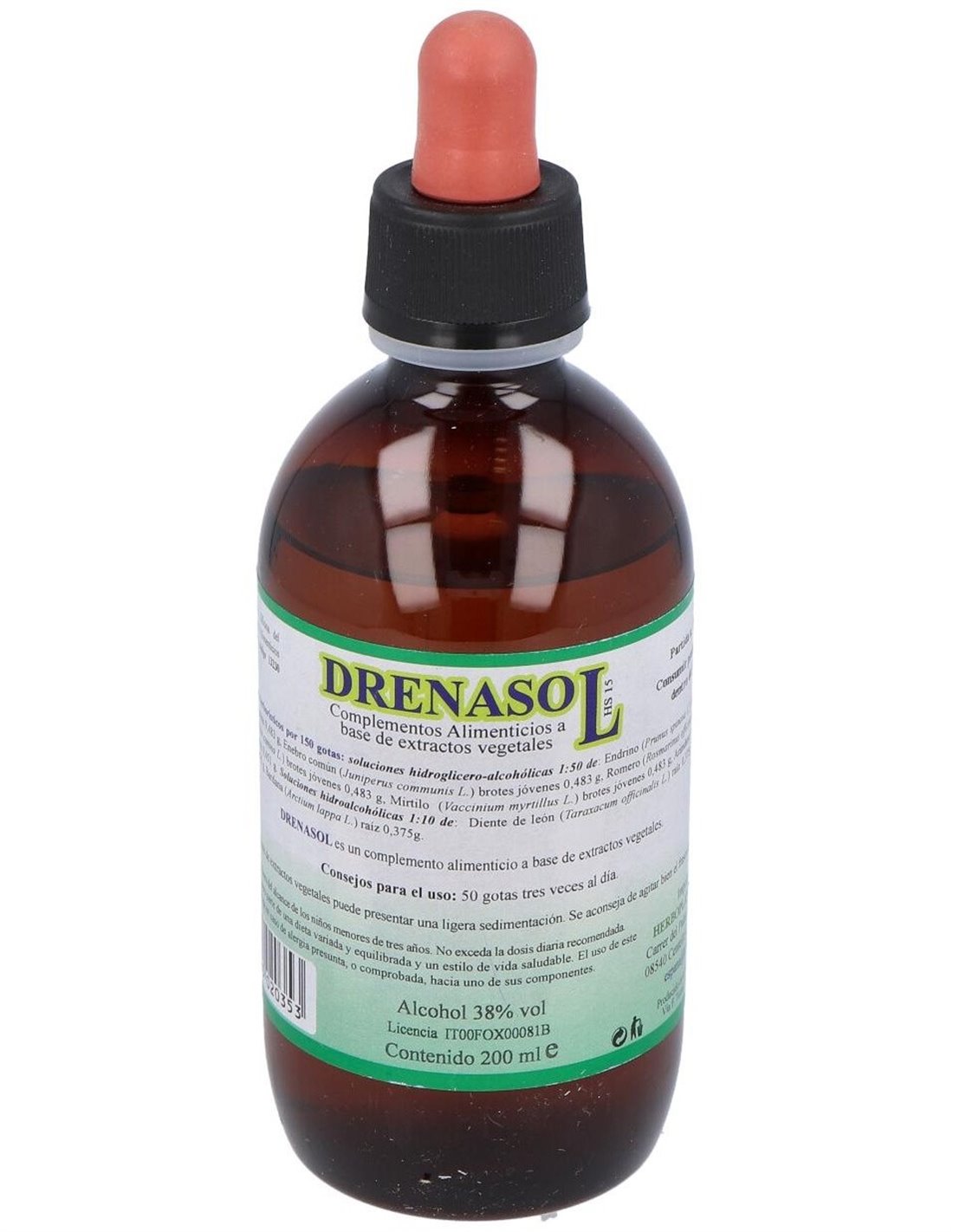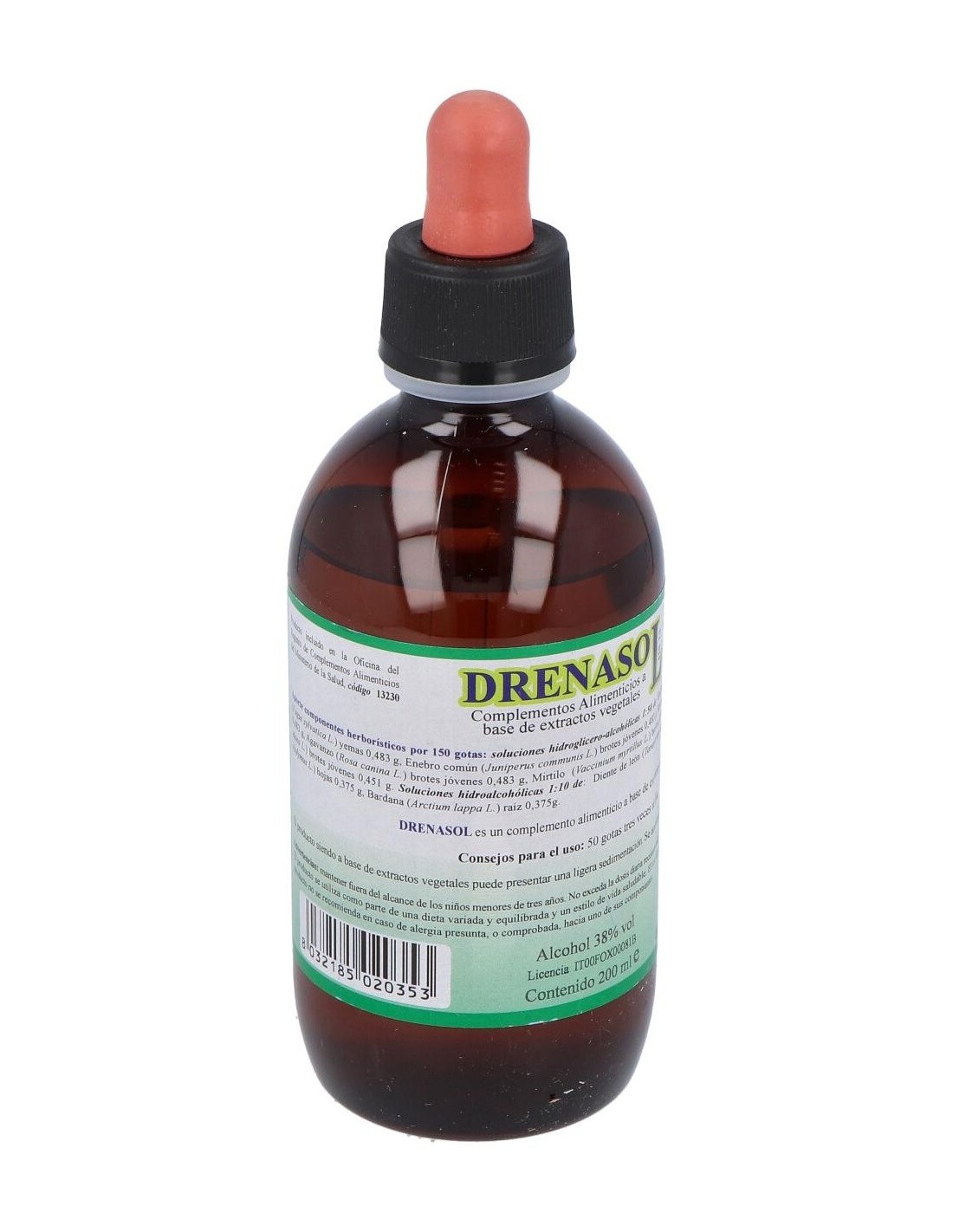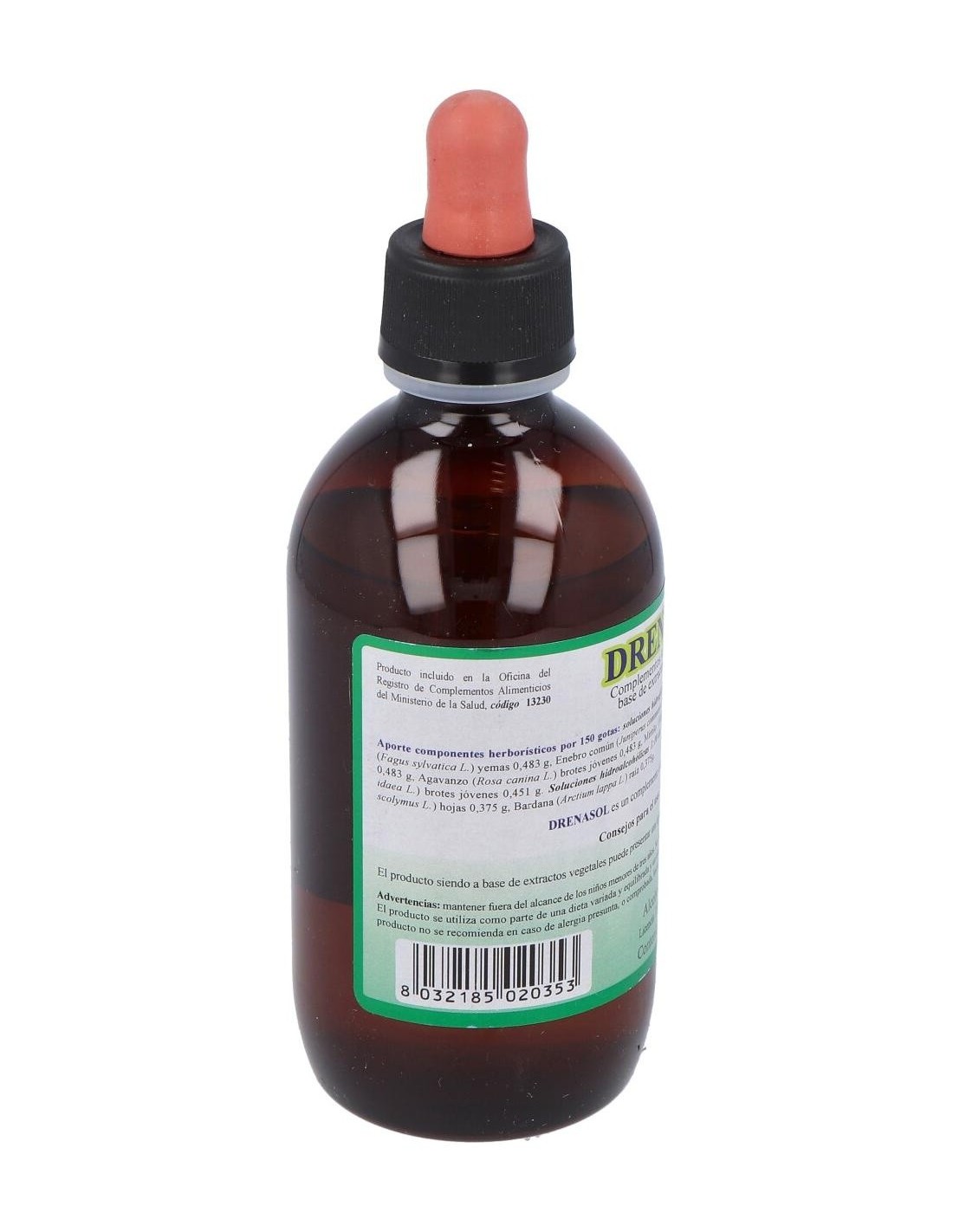 Drenasol de Herboplanet es un complemento alimenticio a base de extractos vegetales que promueve el drenaje de los fluidos corporales, las funciones depurativas del cuerpo, el bienestar de la piel y el drenaje de los fluidos corporales.Drenasol de Herboplanet es un complemento alimenticio que actúa como drenante general, depurativo, retención hídrica, hipodiuresis. Obesidad. Trastornos intestinales y gástricas concomitante a trastornos renales. Lleva al exterior todo lo que ralentiza la actividad enzimática del organismo.Ingredientes por 150 gotas:MSA (Macerado Espagírico-Alquímico de Solanimus R.E. 1/50) de: Endrino (Prunus spinosa L.) yemas 0,483 g, Haya (Fagus sylvatica L.) yemas 0,483 g, Enebro (Juniperus communis L.) jóvenes brotes 0,483 g, Romero (Rosmarinus officinalis L.) jóvenes brotes 0,483 g, Arándano rojo (Vaccinium vitis idaea L.) jóvenes brotes 0,451 g, Rosal silvestre (Rosa canina L.) jóvenes brotes 0,483 g, Arándano (Vaccinium myrtillus L.) jóvenes brotes 0,483 g. TSA (Tintura Espagírico-Alquímica de Solanimus R.E. 1/10) de: Diente de León (Taraxacum officinale Weber) raíz 0,375 g, Alcachofa (Cynara scolymus L.) hojas 0,375 g, Bardana (Arctium lappa L.) raíz 0,375 g.Modo de empleo:Tomar 25-50 gotas, en agua, 2-3 veces al día, 15 minutos antes de las comidas. Presentación:Envase de 200 ml.