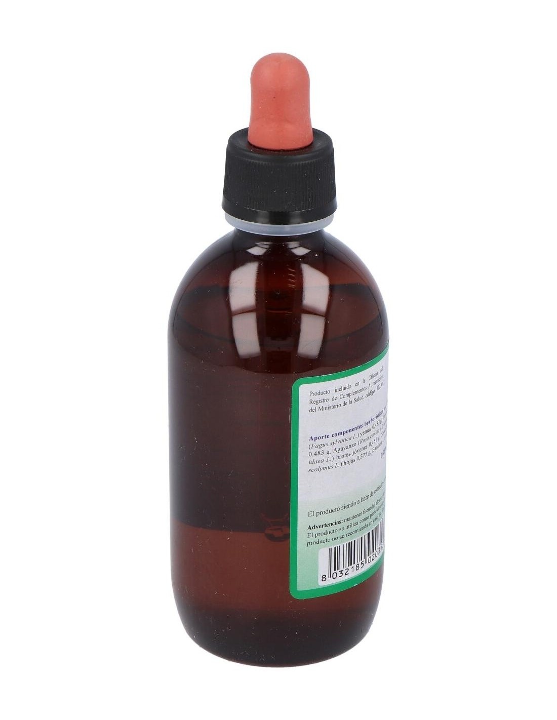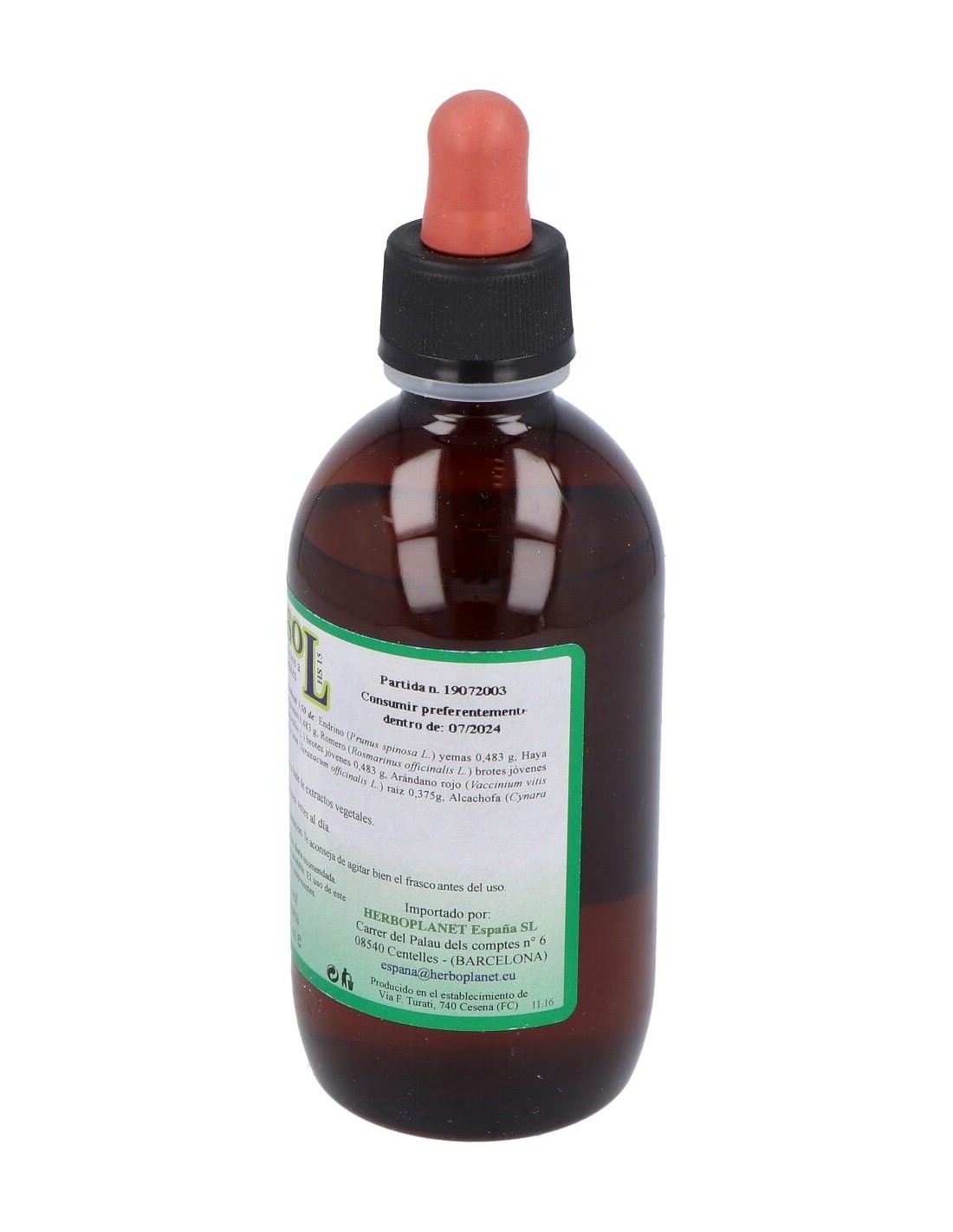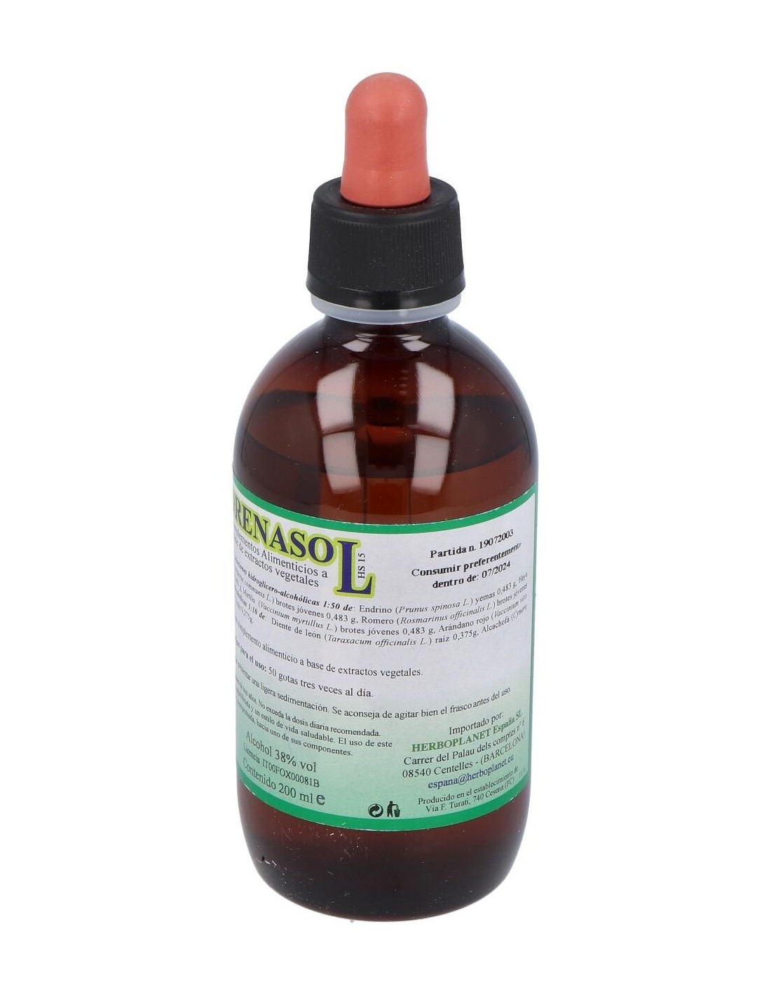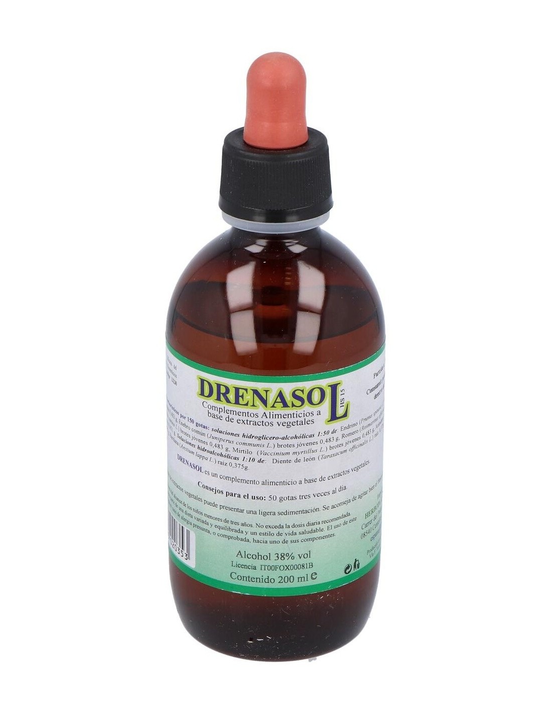 Drenasol de Herboplanet es un complemento alimenticio a base de extractos vegetales que promueve el drenaje de los fluidos corporales, las funciones depurativas del cuerpo, el bienestar de la piel y el drenaje de los fluidos corporales.Drenasol de Herboplanet es un complemento alimenticio que actúa como drenante general, depurativo, retención hídrica, hipodiuresis. Obesidad. Trastornos intestinales y gástricas concomitante a trastornos renales. Lleva al exterior todo lo que ralentiza la actividad enzimática del organismo.Ingredientes por 150 gotas:MSA (Macerado Espagírico-Alquímico de Solanimus R.E. 1/50) de: Endrino (Prunus spinosa L.) yemas 0,483 g, Haya (Fagus sylvatica L.) yemas 0,483 g, Enebro (Juniperus communis L.) jóvenes brotes 0,483 g, Romero (Rosmarinus officinalis L.) jóvenes brotes 0,483 g, Arándano rojo (Vaccinium vitis idaea L.) jóvenes brotes 0,451 g, Rosal silvestre (Rosa canina L.) jóvenes brotes 0,483 g, Arándano (Vaccinium myrtillus L.) jóvenes brotes 0,483 g. TSA (Tintura Espagírico-Alquímica de Solanimus R.E. 1/10) de: Diente de León (Taraxacum officinale Weber) raíz 0,375 g, Alcachofa (Cynara scolymus L.) hojas 0,375 g, Bardana (Arctium lappa L.) raíz 0,375 g.Modo de empleo:Tomar 25-50 gotas, en agua, 2-3 veces al día, 15 minutos antes de las comidas. Presentación:Envase de 200 ml.